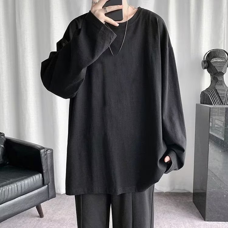 홍콩 스타일 긴팔 티셔츠 남성용 가을 느슨한 둥근 목 커플의베이스 셔츠 캐주얼 트렌디 이너 탑 남성용 티셔츠