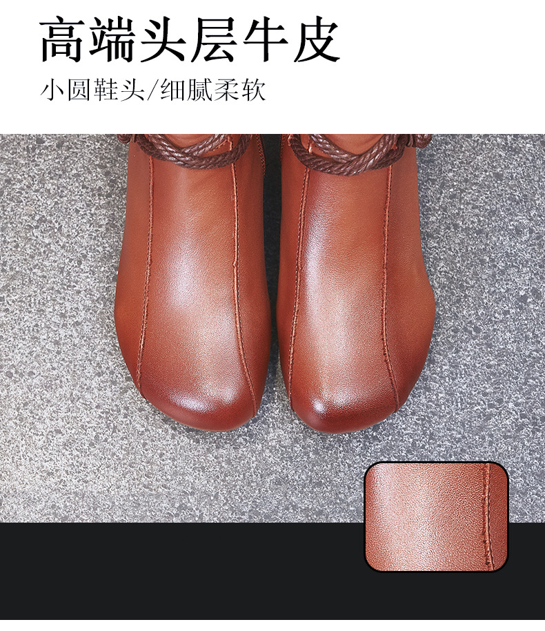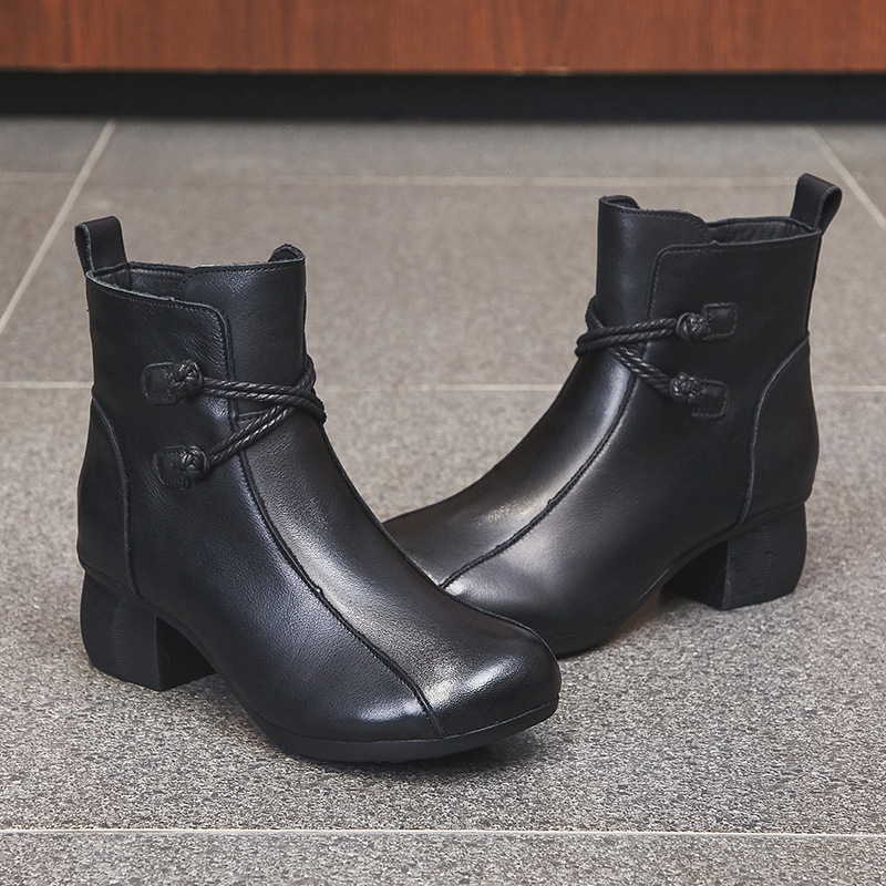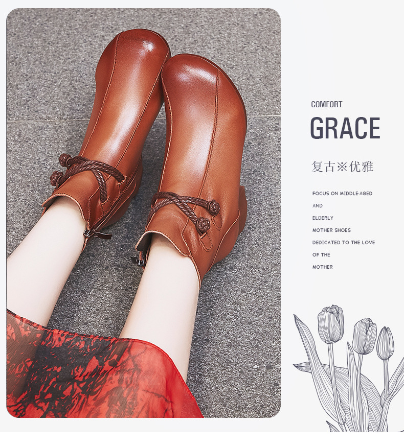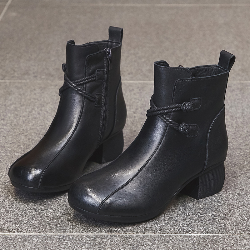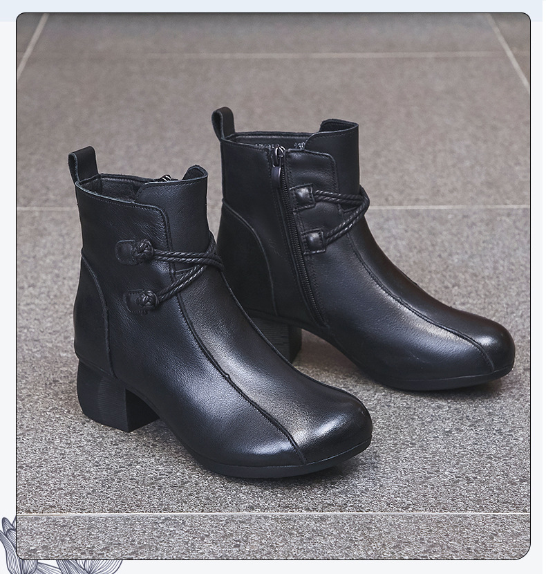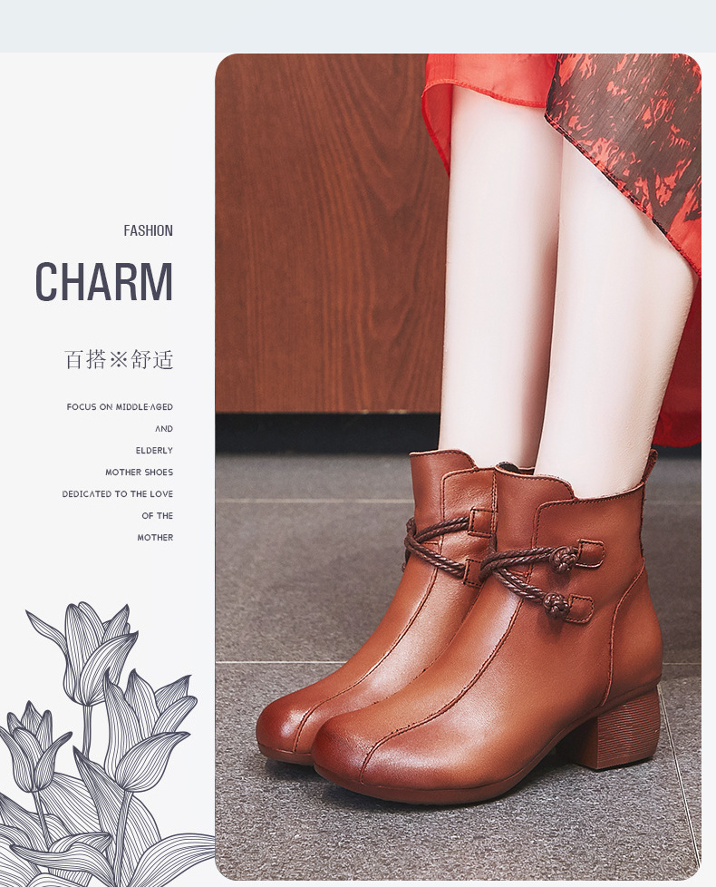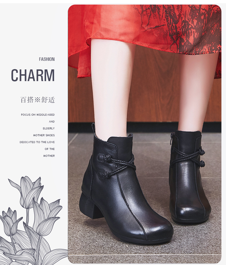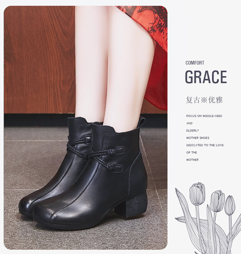 짧은 부츠 여성 복고풍 여성 신발 2024 겨울 새로운 중년 따뜻한면 신발 소 가죽 두꺼운 뒤꿈치 부드러운 바닥 마틴 부츠 도매