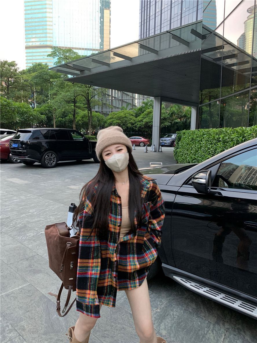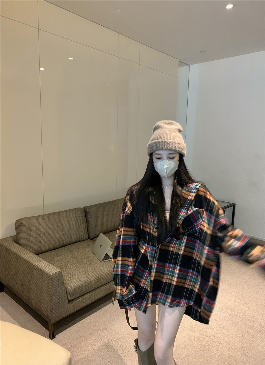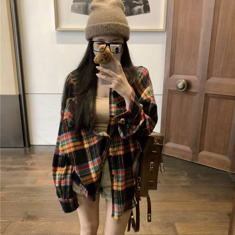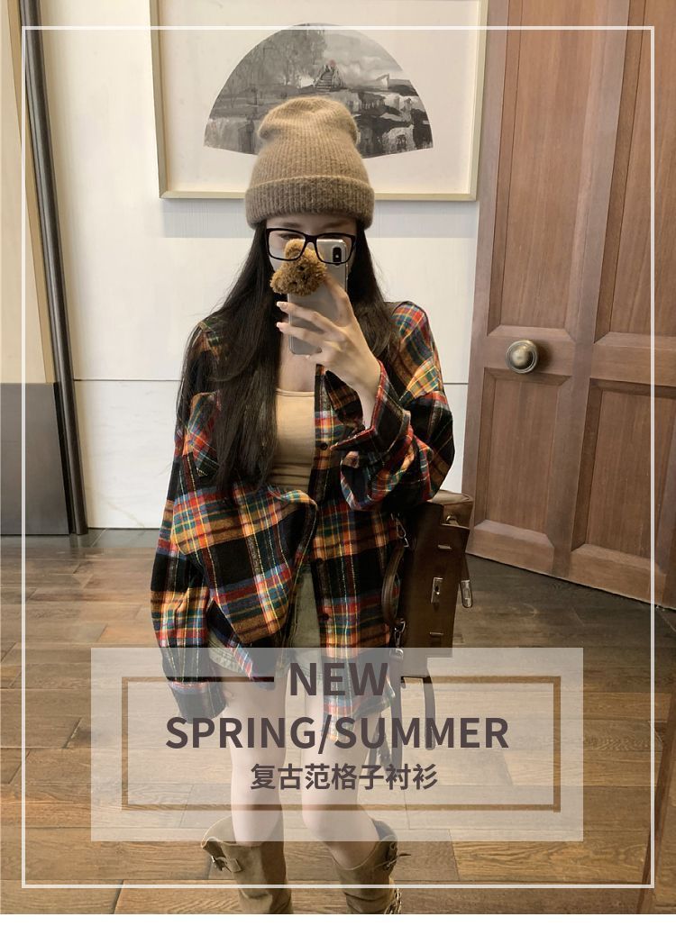 봄과 가을 한국 스타일 홍콩 스타일 격자 무늬 폴로 칼라 셔츠 코트 작은 여성을위한 중간 길이의 느슨한 복고풍 셔츠스토어 가기