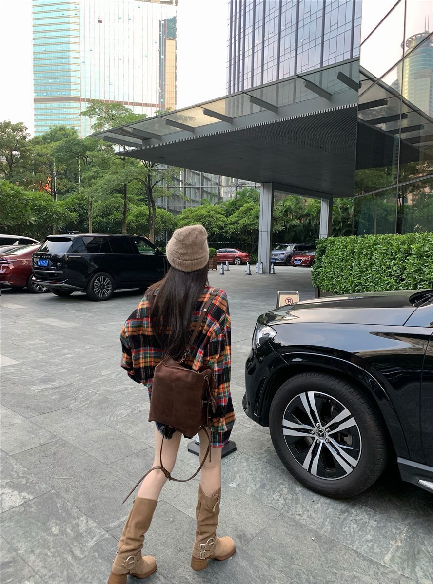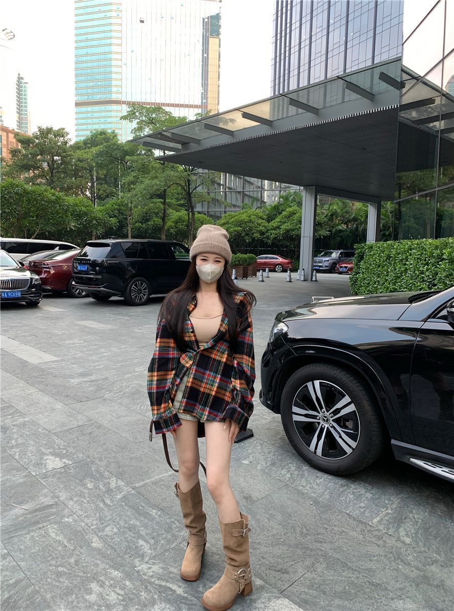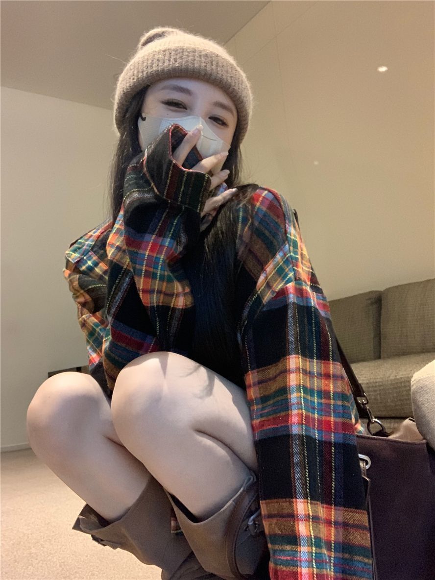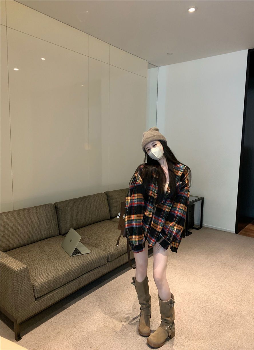 봄과 가을 한국 스타일 홍콩 스타일 격자 무늬 폴로 칼라 셔츠 코트 작은 여성을위한 중간 길이의 느슨한 복고풍 셔츠스토어 가기