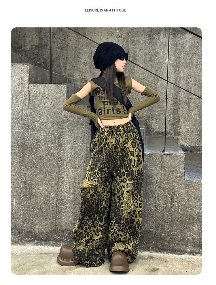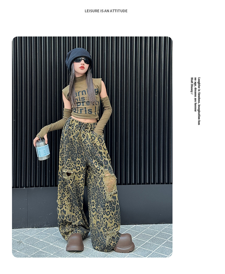 여성용 아메리칸 레트로 레오파드 프린트 찢어진 청바지 2025 가을 신상 하이웨이스트 슬리밍 스트레이트 와이드 레그 바닥 기장 팬츠스토어 가기