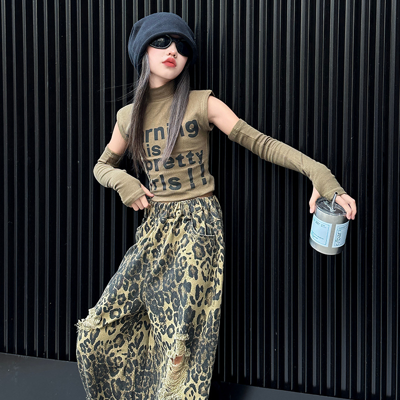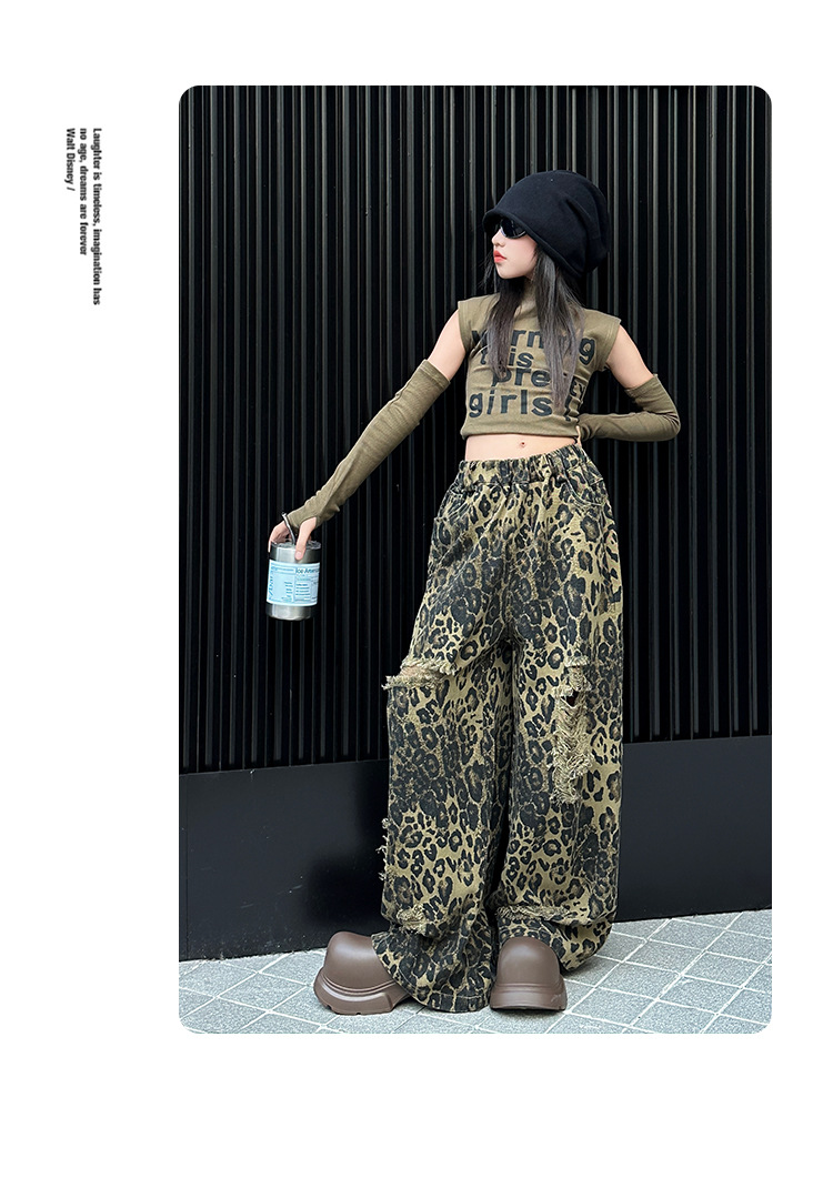 여성용 아메리칸 레트로 레오파드 프린트 찢어진 청바지 2025 가을 신상 하이웨이스트 슬리밍 스트레이트 와이드 레그 바닥 기장 팬츠