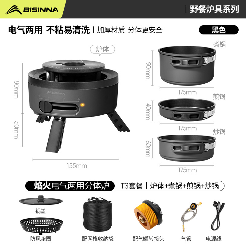 • 블랙 : T3 난로 + 냄비 + 프라이팬 + 웍 [전기 겸용 / 수납가방 / 어댑터 포함]