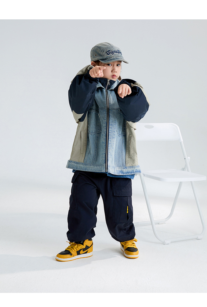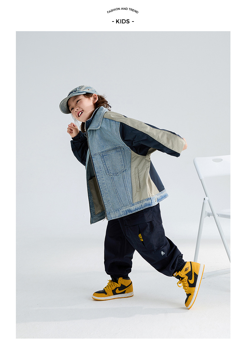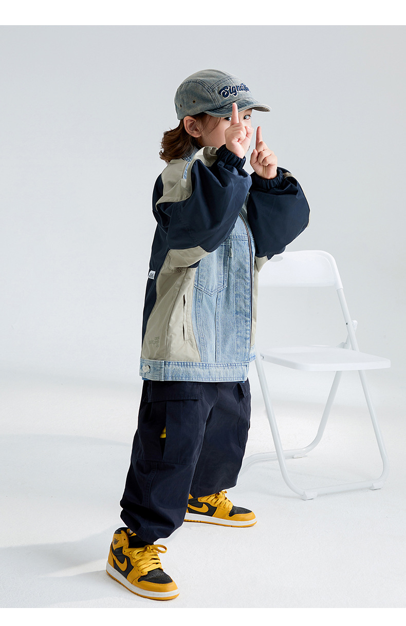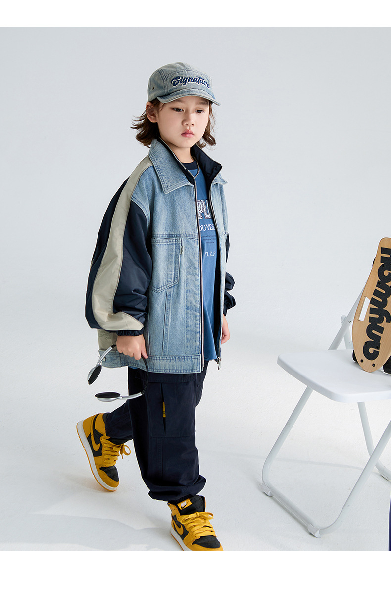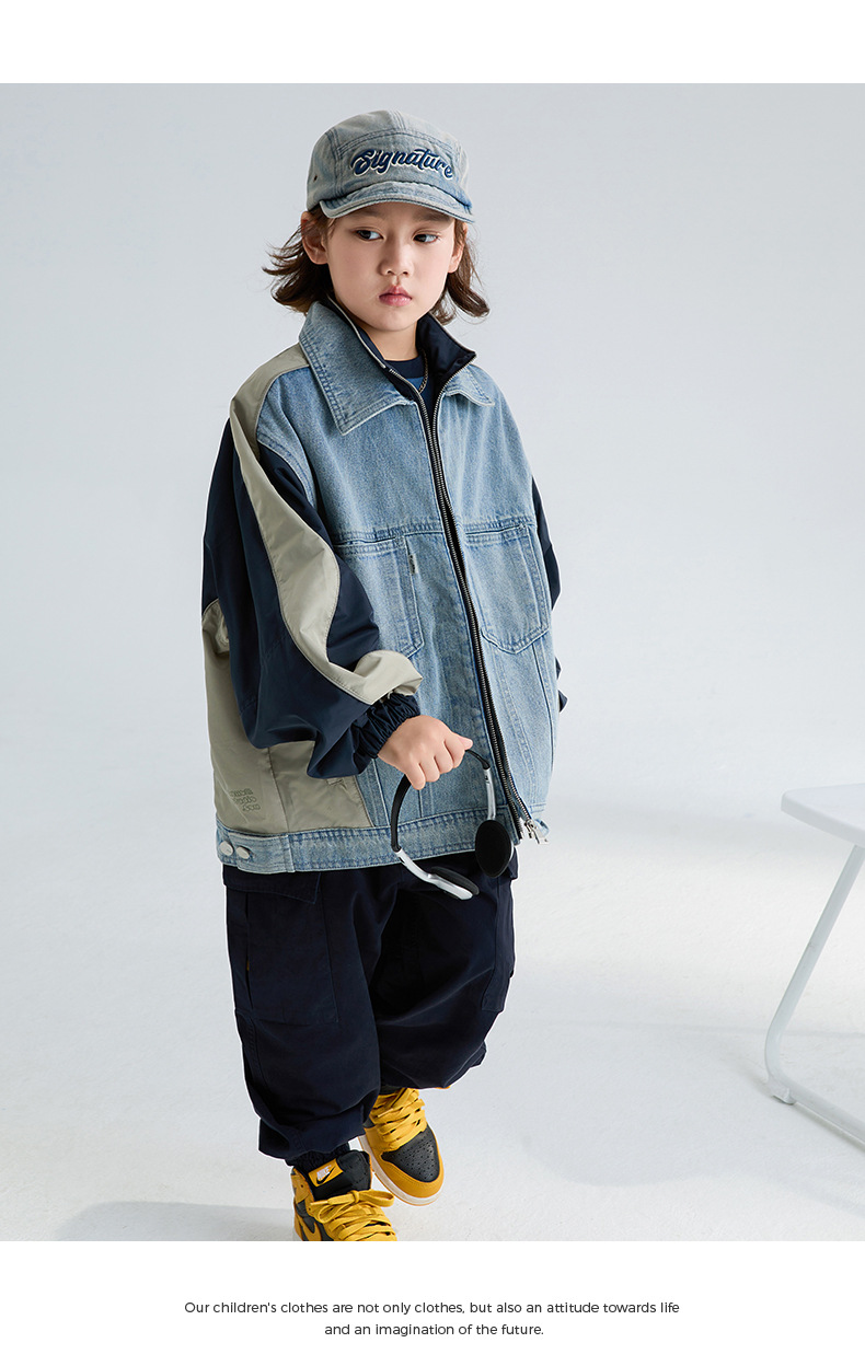 FULONGZAI 부모-자식 아동복 2024 가을 소년 소녀 신상 중대형 아동 데님 트렌디 브랜드 짧은 재킷