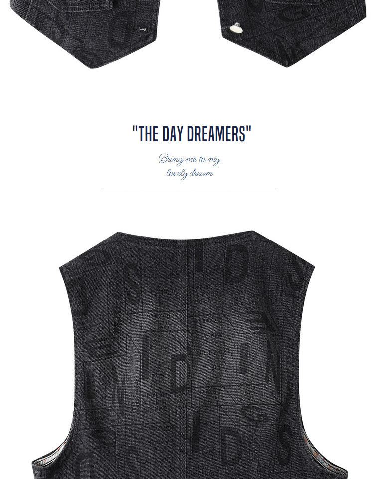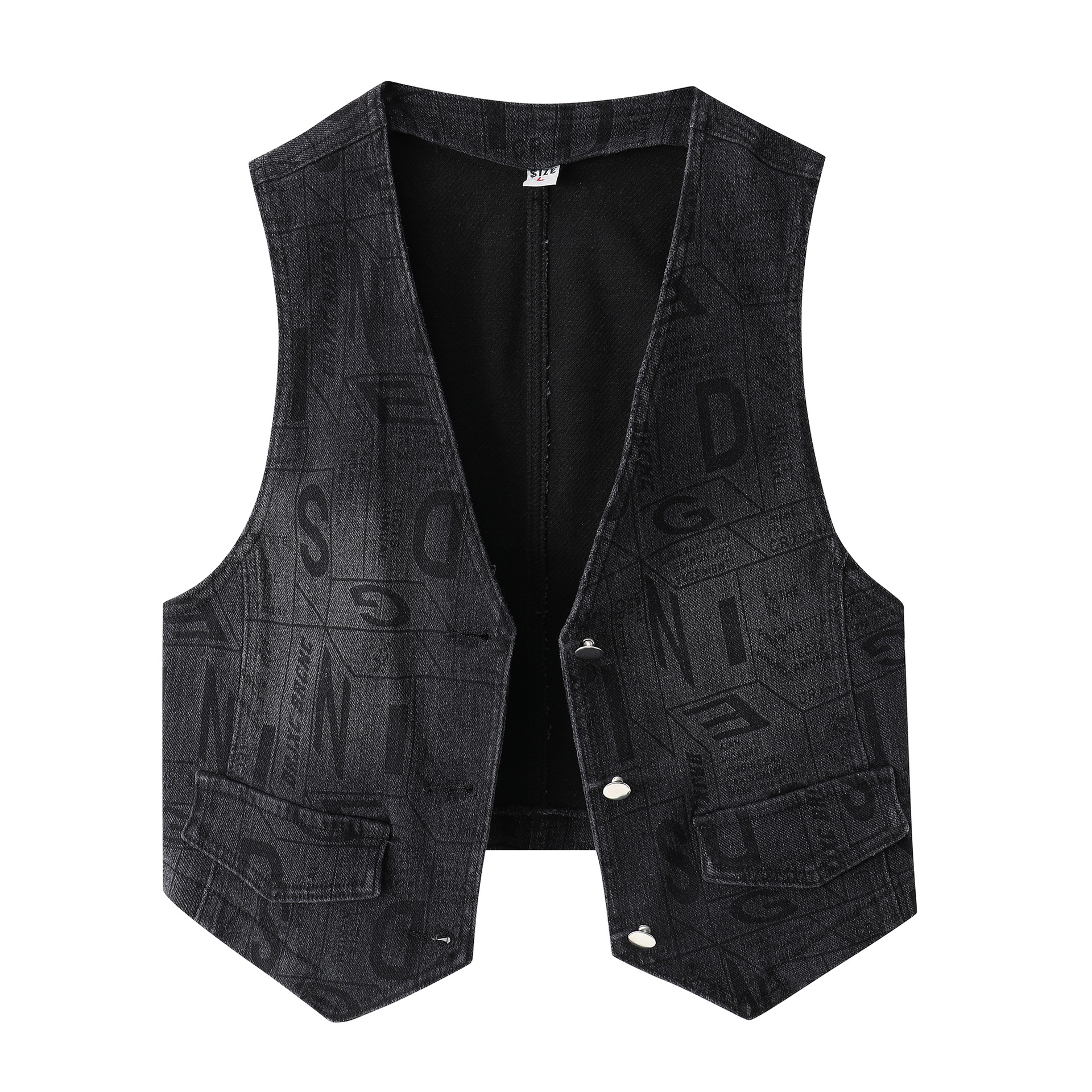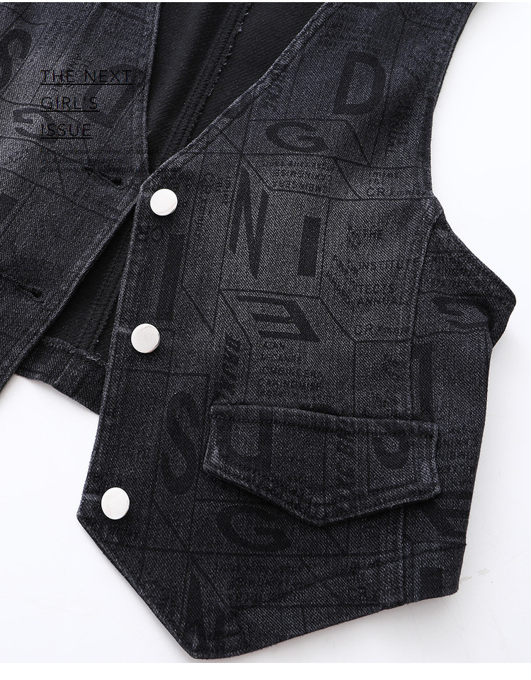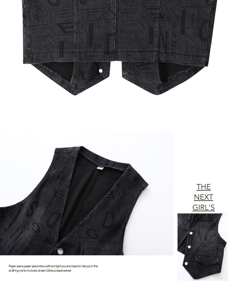2024 년 봄과 가을 그레이 블랙 데님 조끼 여성의 짧은 한국식 슬리밍 프린트 조끼 트렌디스토어 가기
