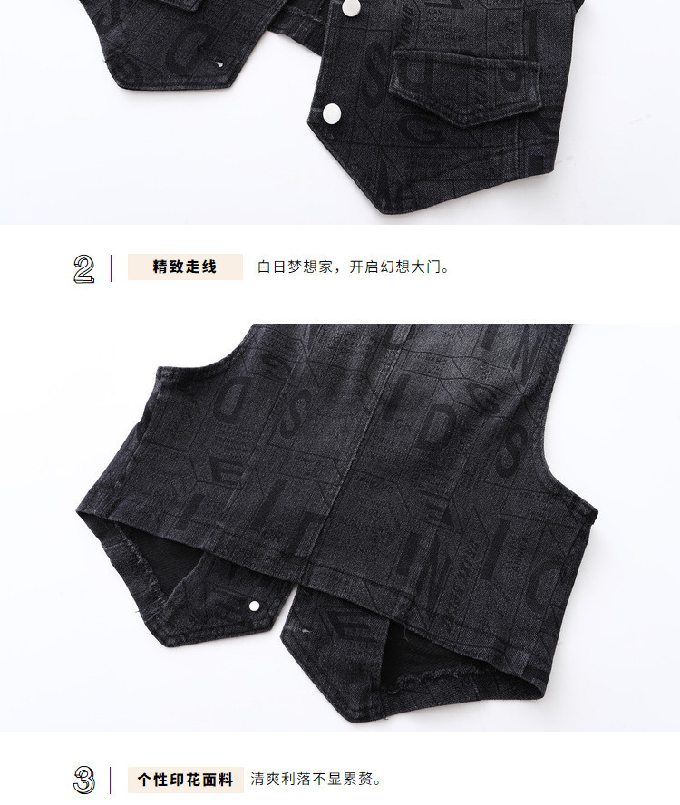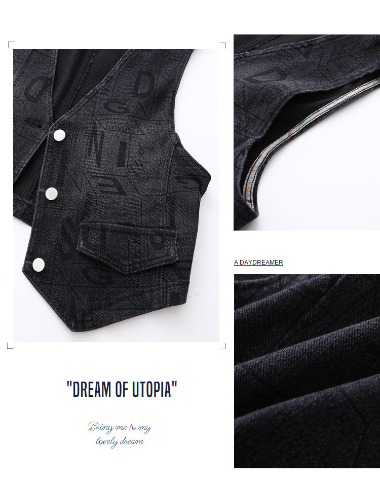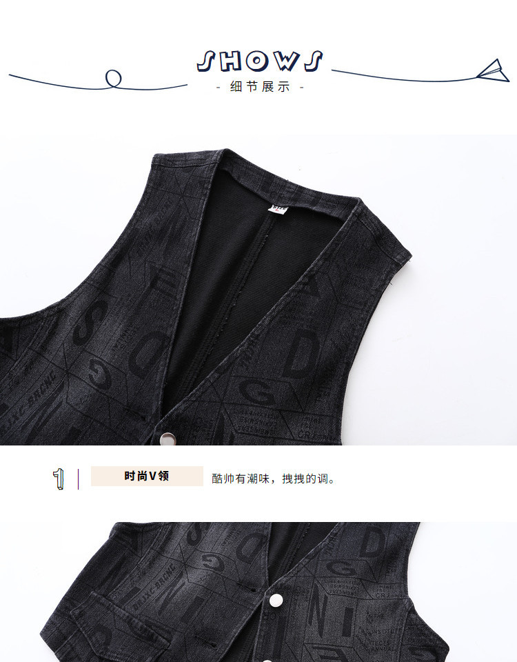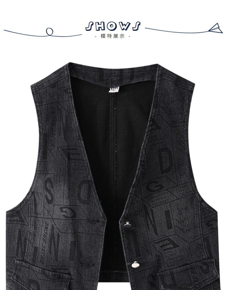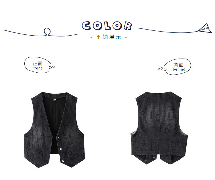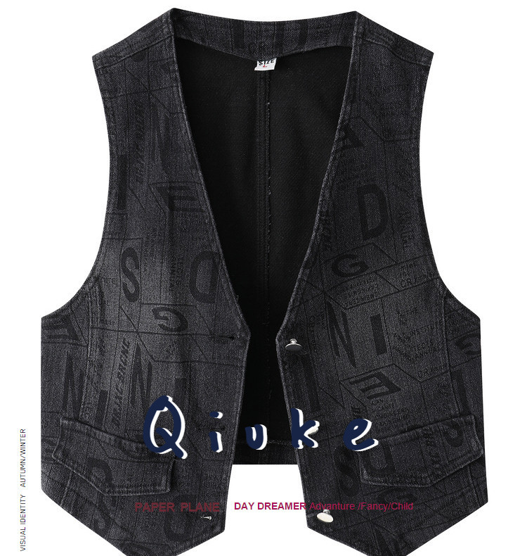 2024 년 봄과 가을 그레이 블랙 데님 조끼 여성의 짧은 한국식 슬리밍 프린트 조끼 트렌디스토어 가기