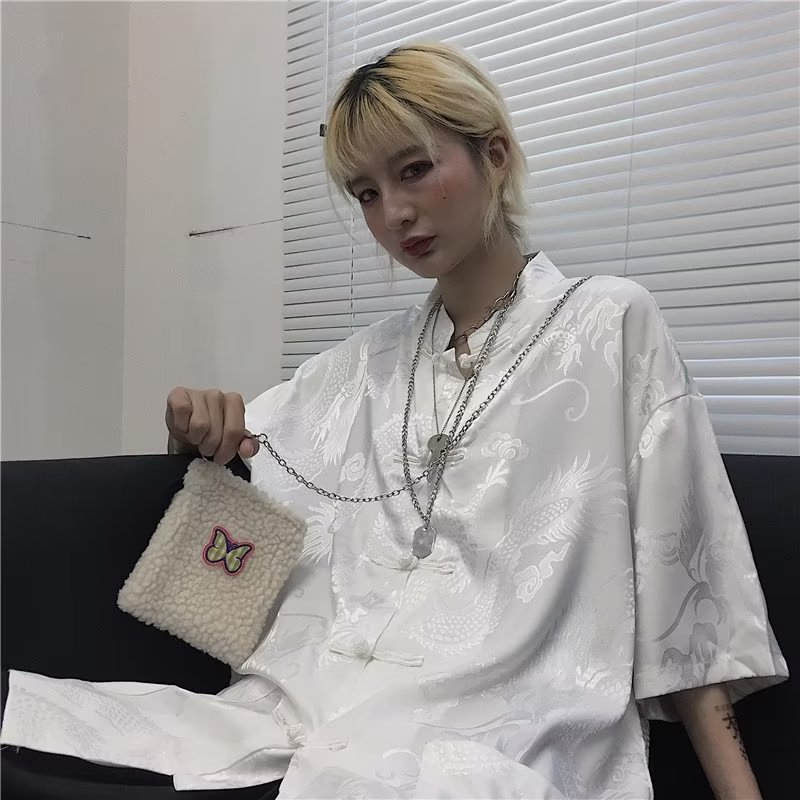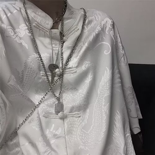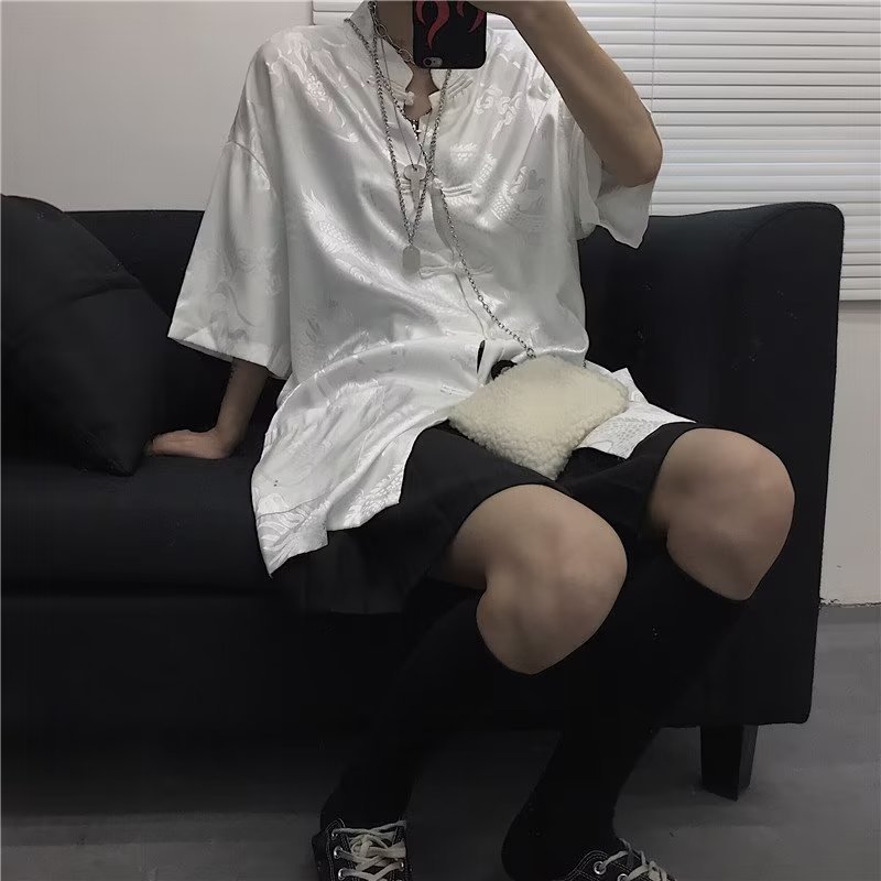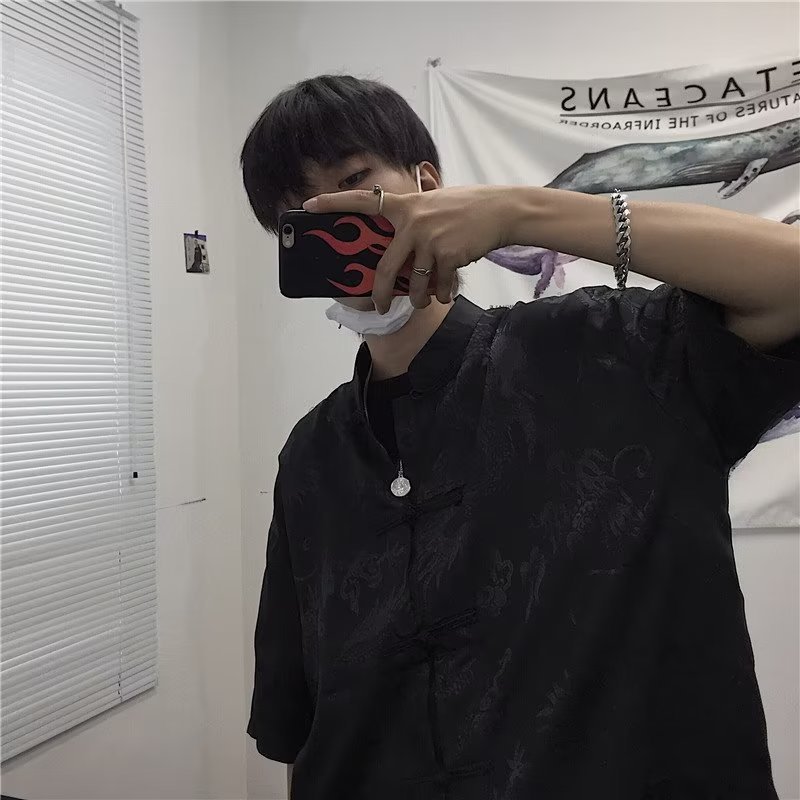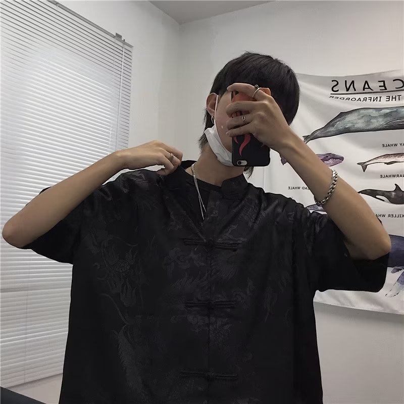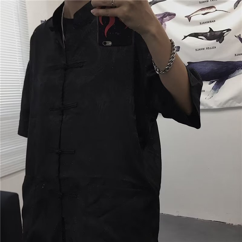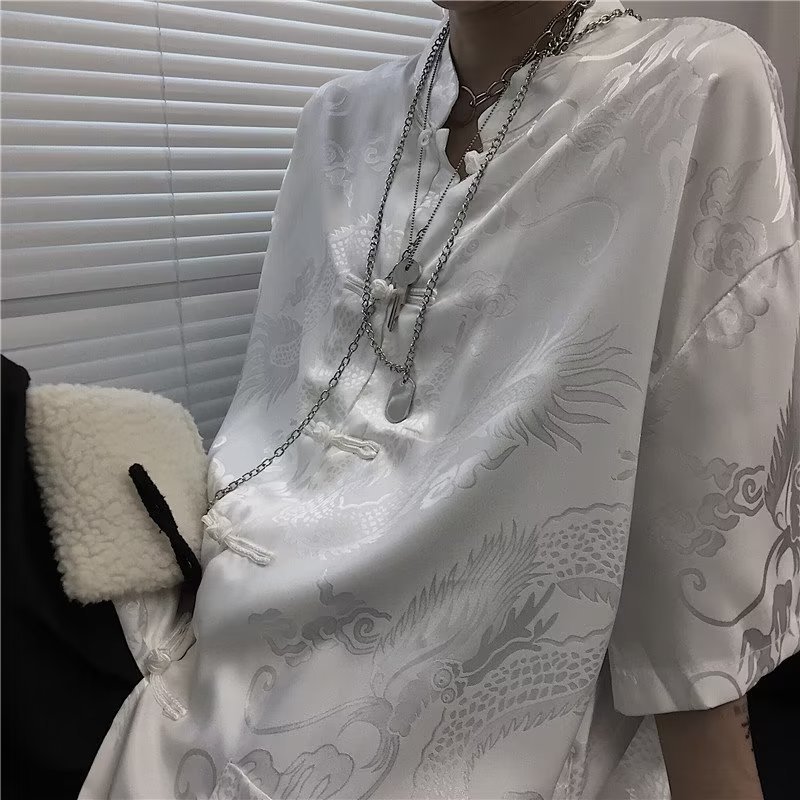 새로운 중국 스타일 팬 입 탕 원피스 반팔 셔츠 남자 복고풍 다크 드래곤 패턴 전국 패션 커플의 캐주얼 올 매치 셔츠 재킷스토어 가기