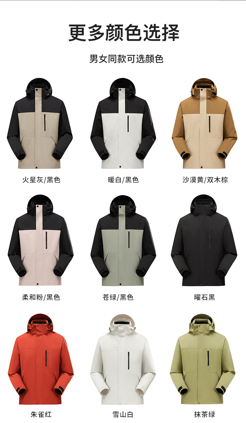 티몰과 동일한 스타일의 여성용 삼중 기능 재킷 남성용 GBT32614 방풍 방수 등산복 야외 작업복 겨울용