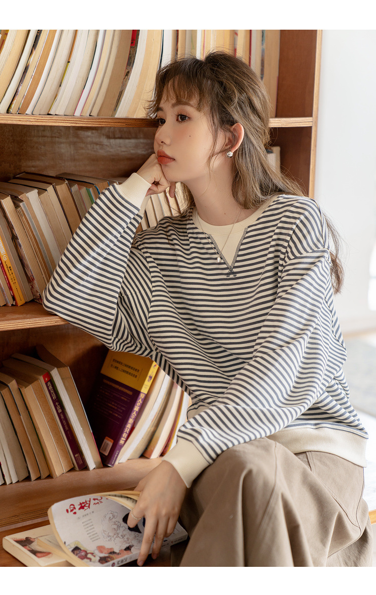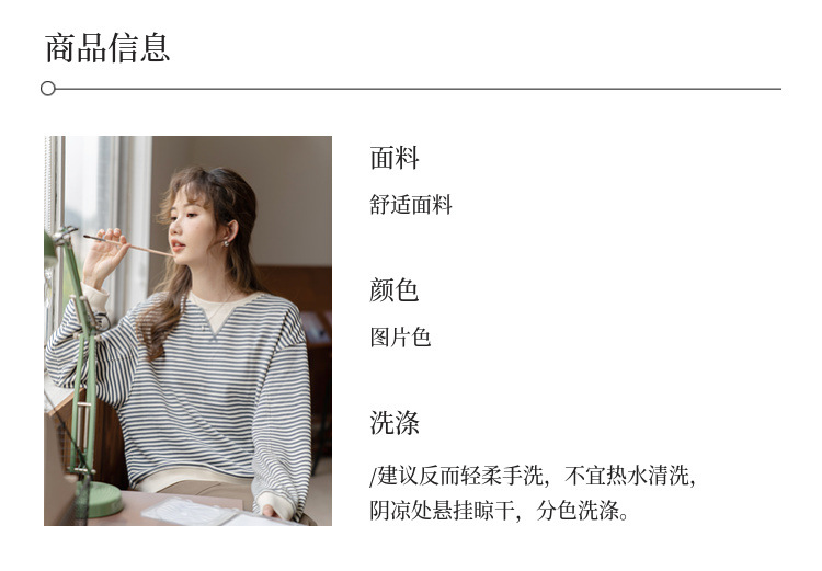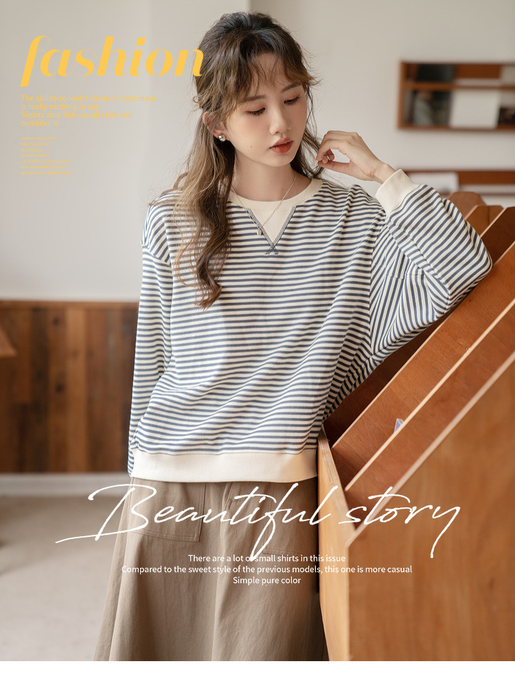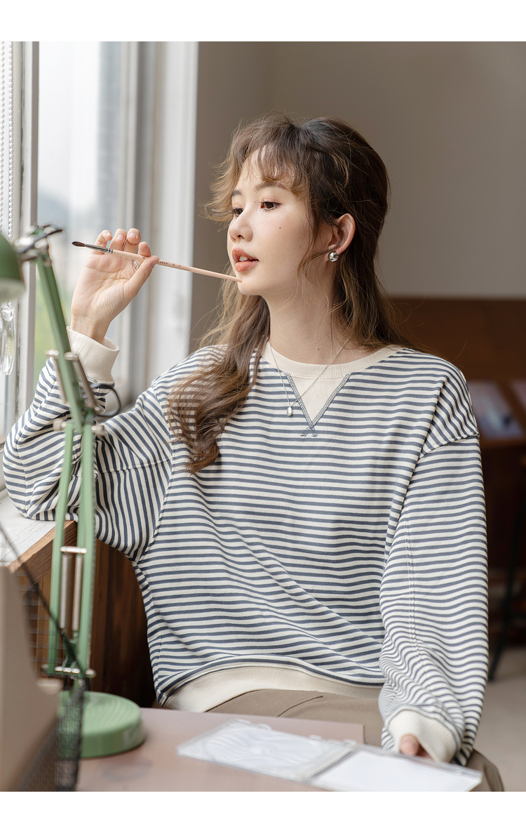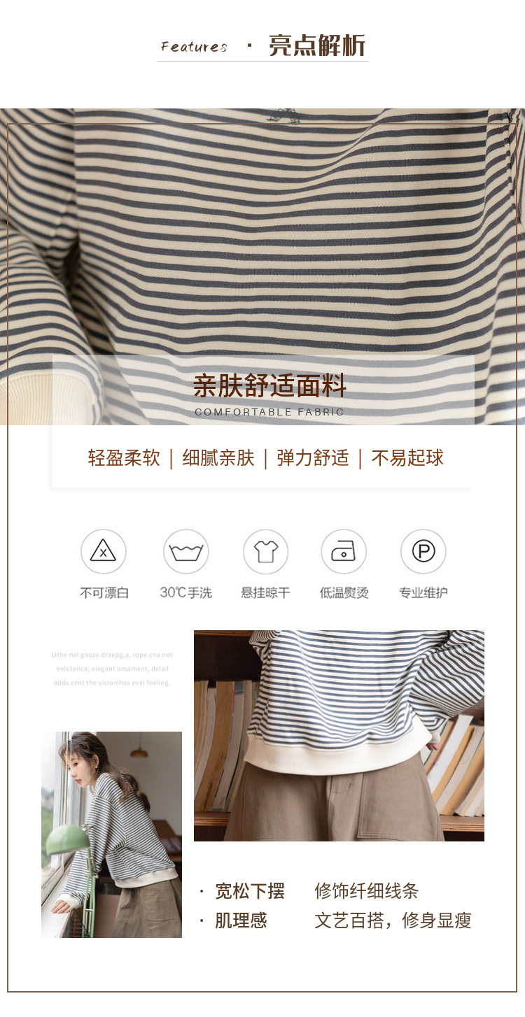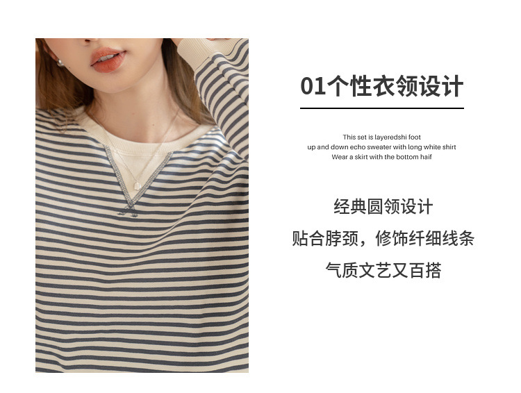 2024 가을 새로운 캐주얼 패션 그레이 스트라이프 니트 라운드 넥 컬러 매칭 디자인 감각 스웨터 여성의 오버 사이즈스토어 가기