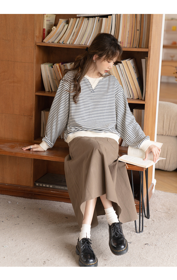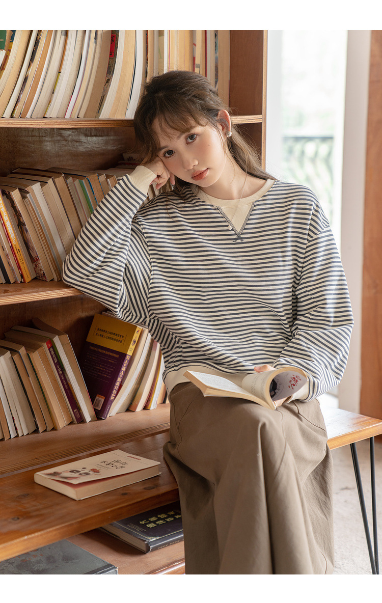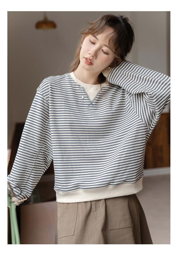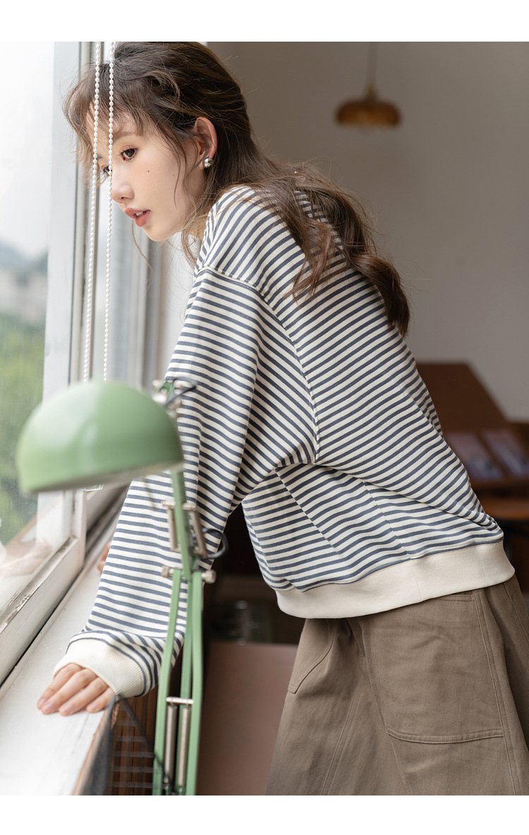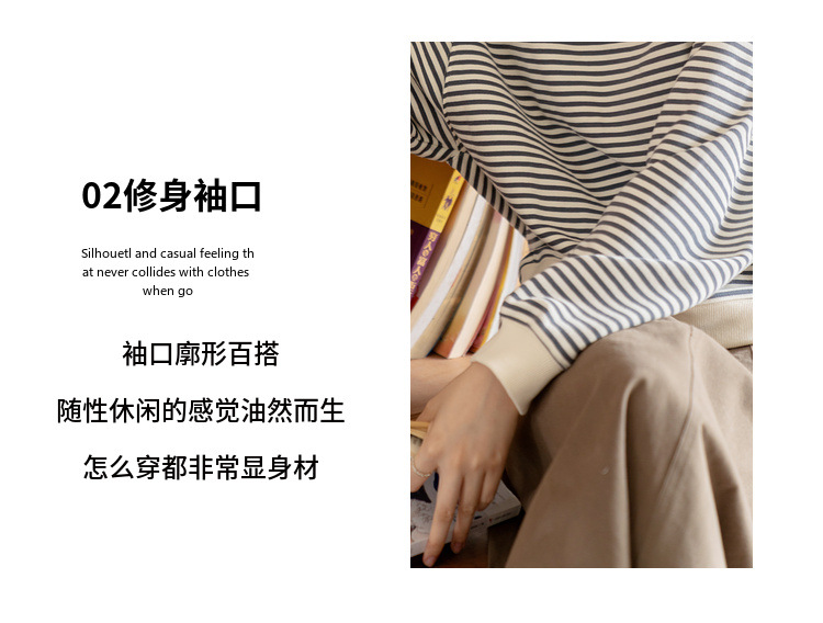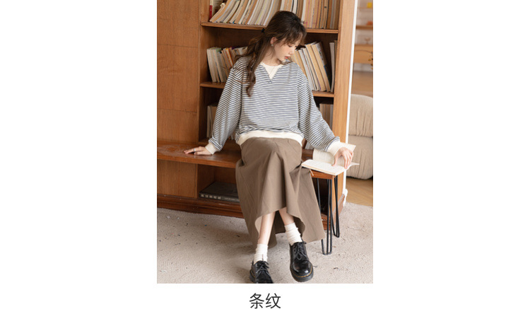 2024 가을 새로운 캐주얼 패션 그레이 스트라이프 니트 라운드 넥 컬러 매칭 디자인 감각 스웨터 여성의 오버 사이즈스토어 가기