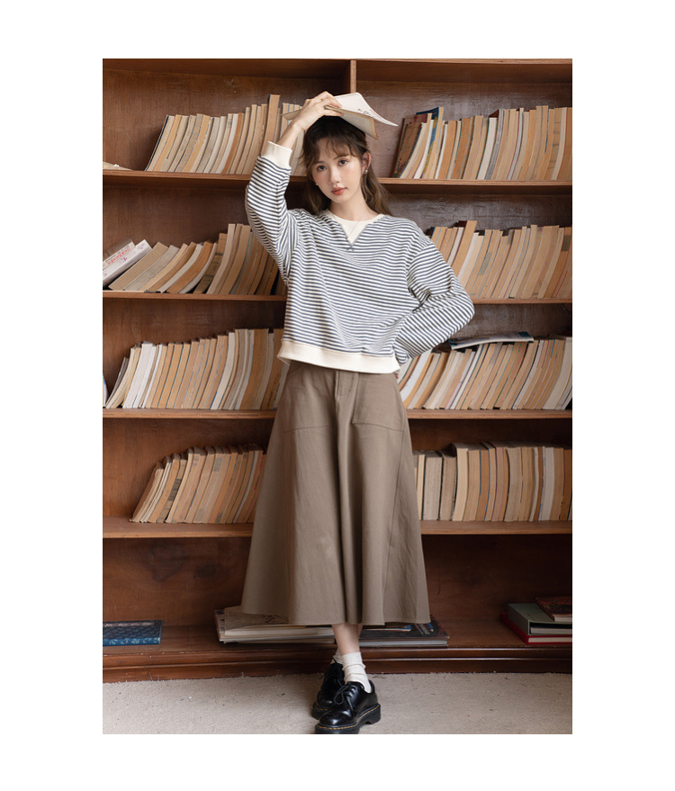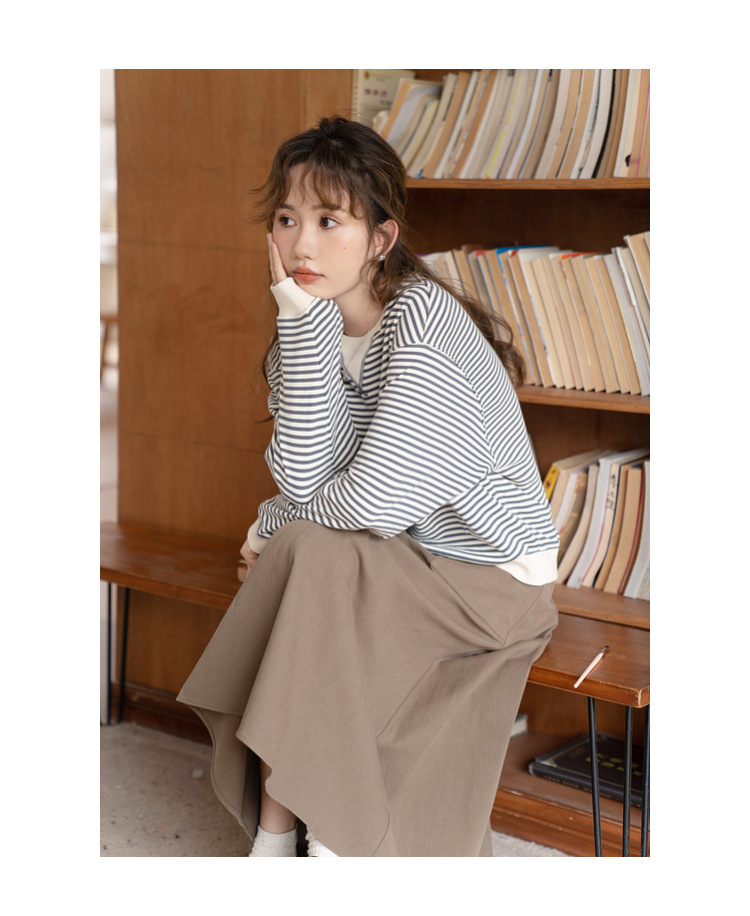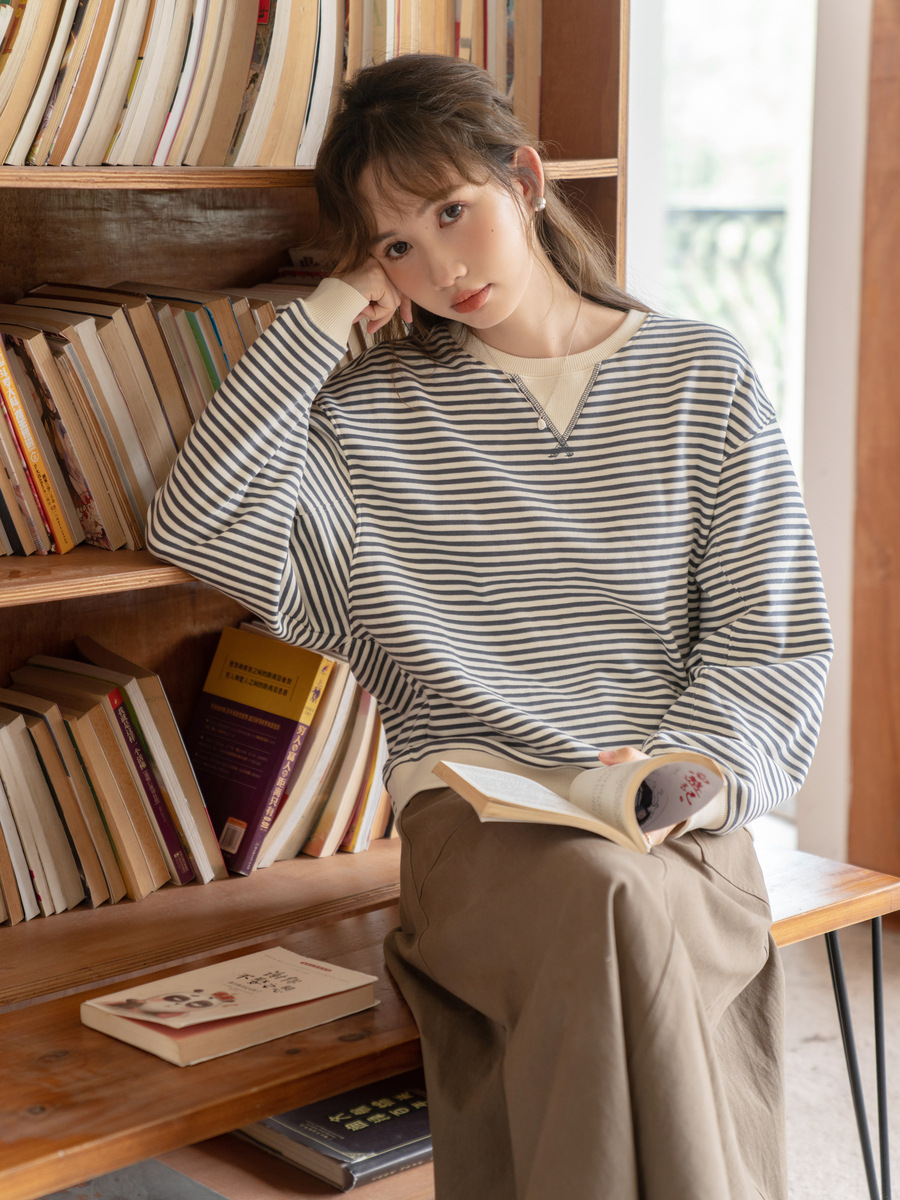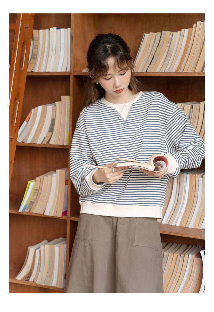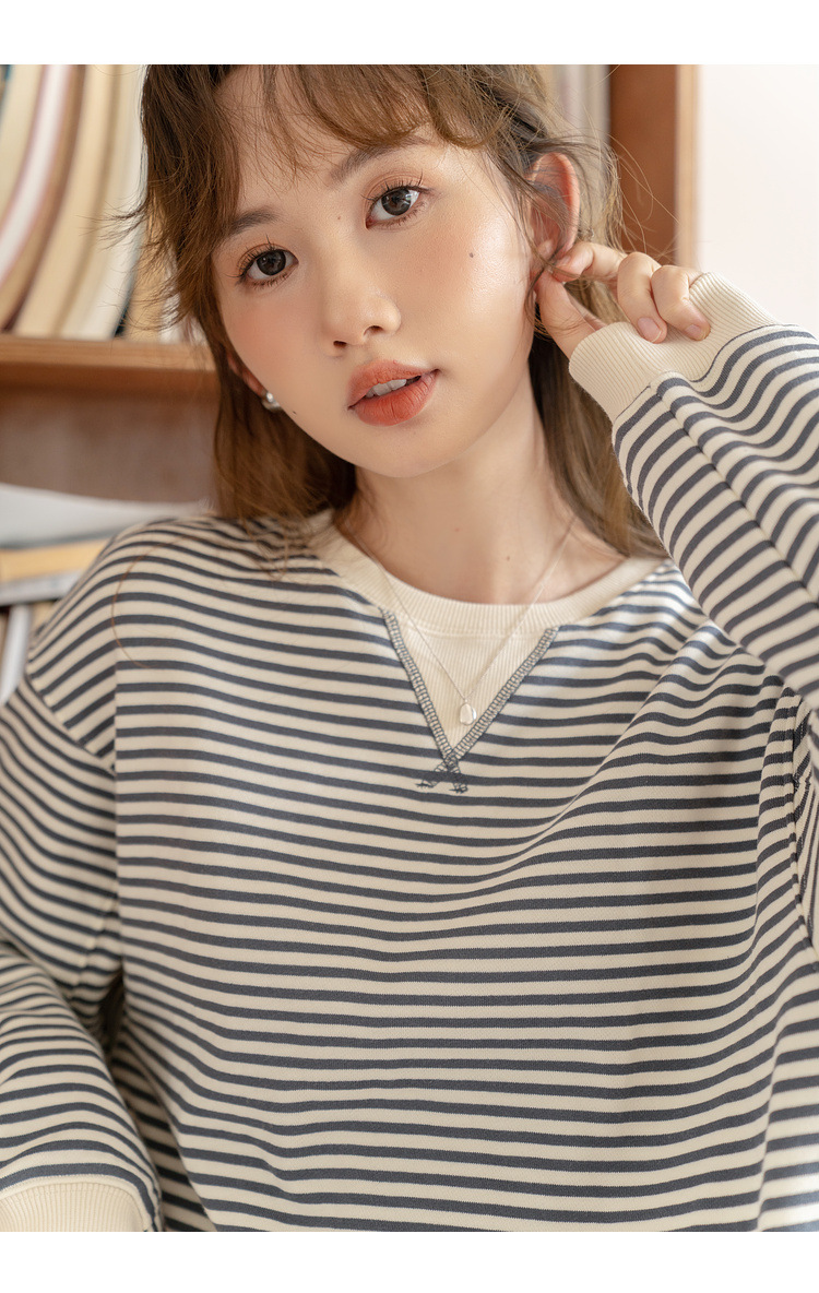 2024 가을 새로운 캐주얼 패션 그레이 스트라이프 니트 라운드 넥 컬러 매칭 디자인 감각 스웨터 여성의 오버 사이즈스토어 가기