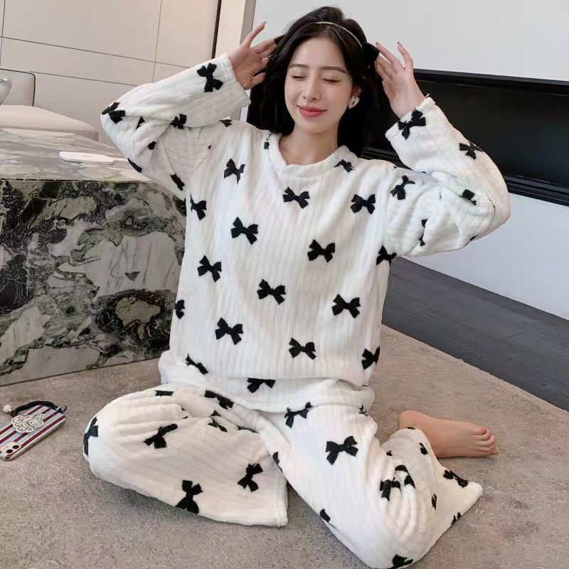귀여운 인쇄 플란넬 두꺼운 긴 소매 파자마 여성의 가을과 겨울 달콤한 따뜻한 외부 착용 한국 스타일 홈 패션