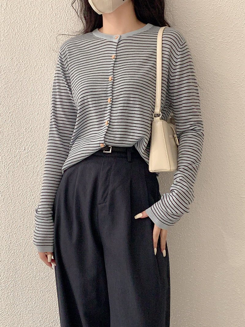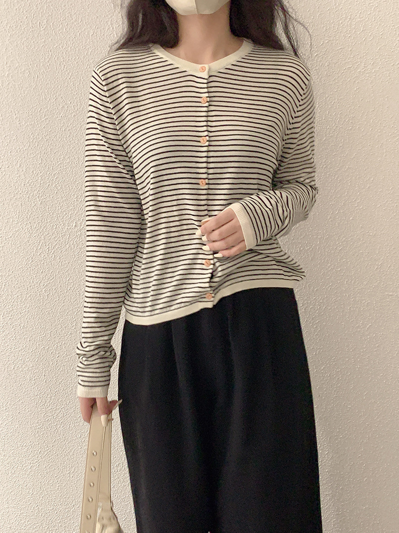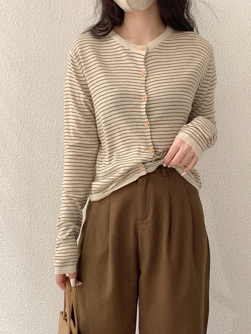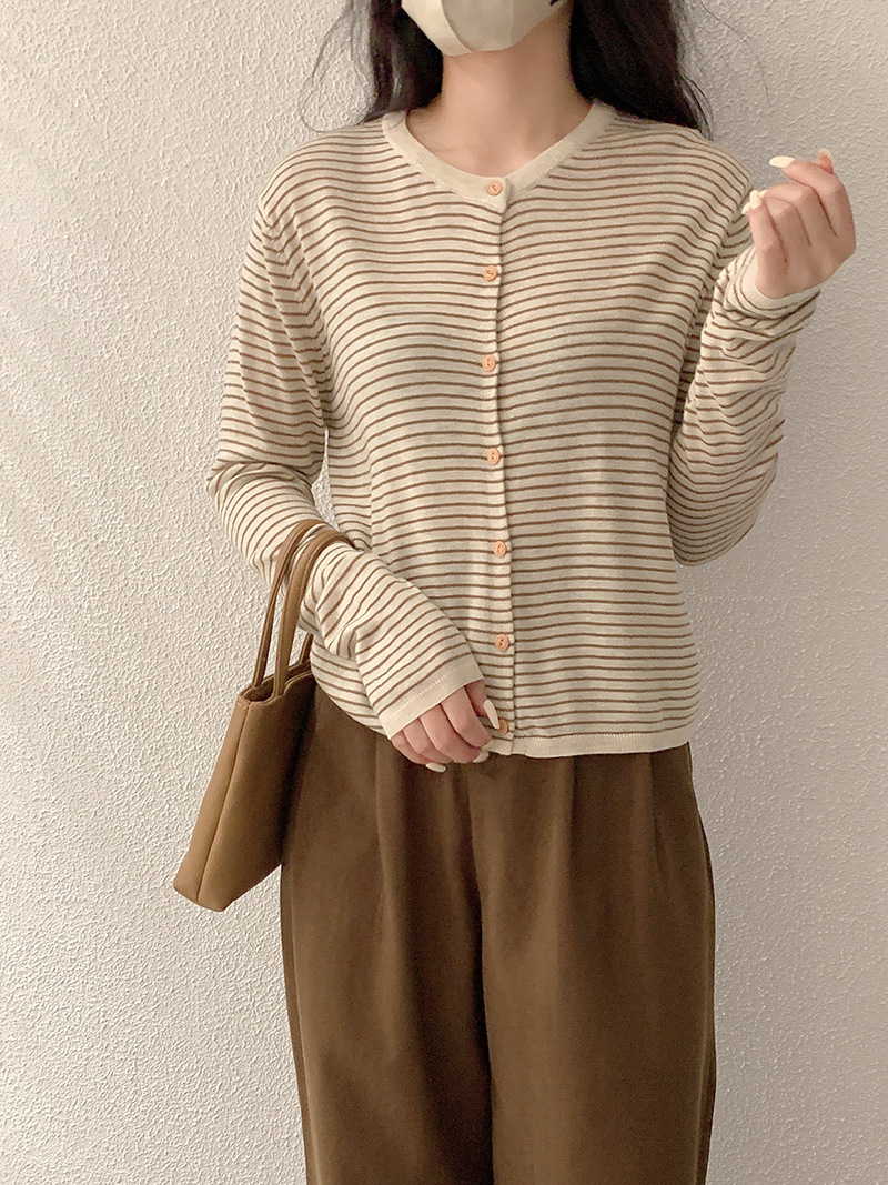 가을 느슨한 둥근 목 다재다능한 부드럽고 섬세한 스웨터 재킷 한국식 여성 의류 대조 컬러 줄무늬 니트 카디건