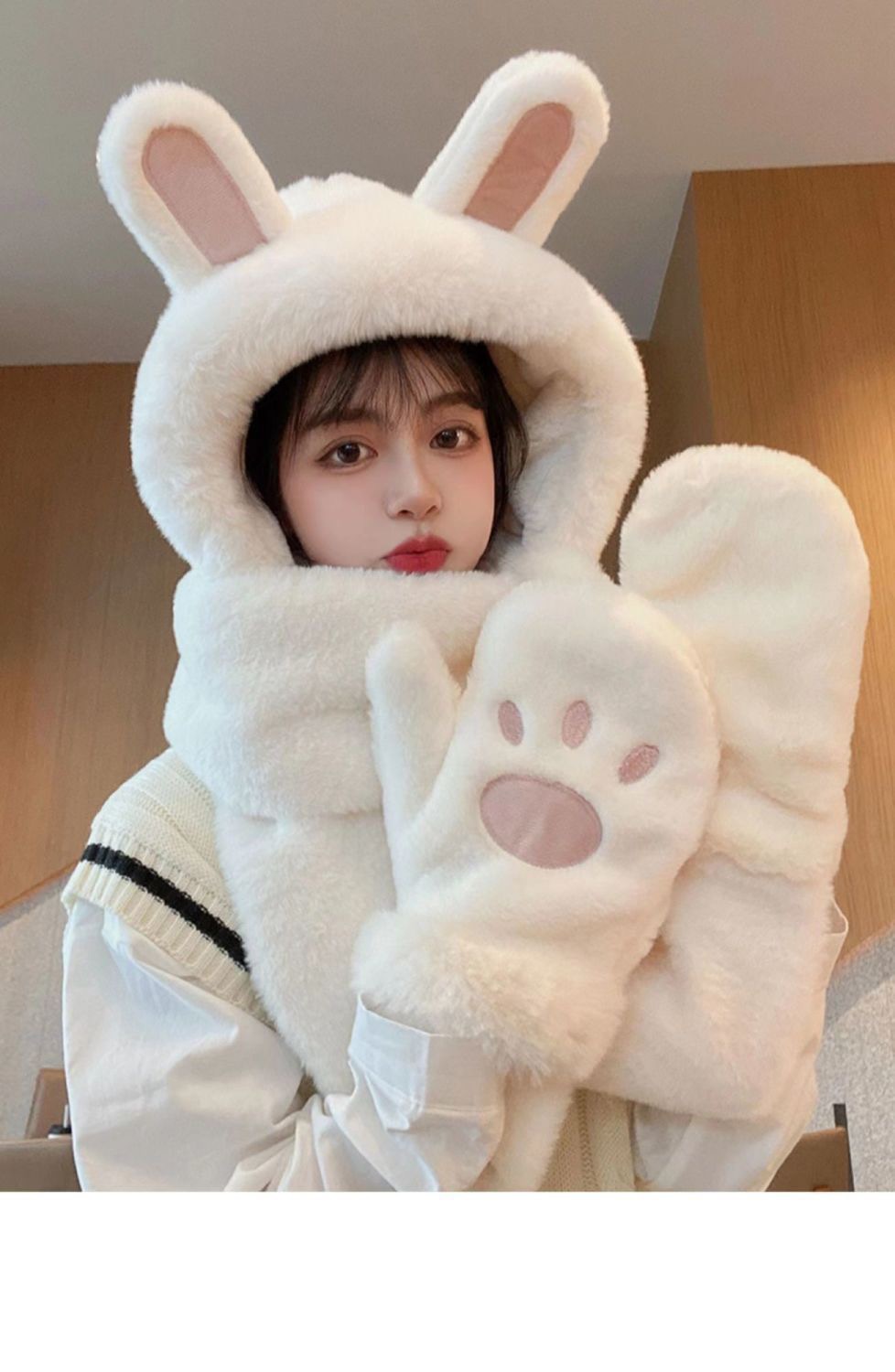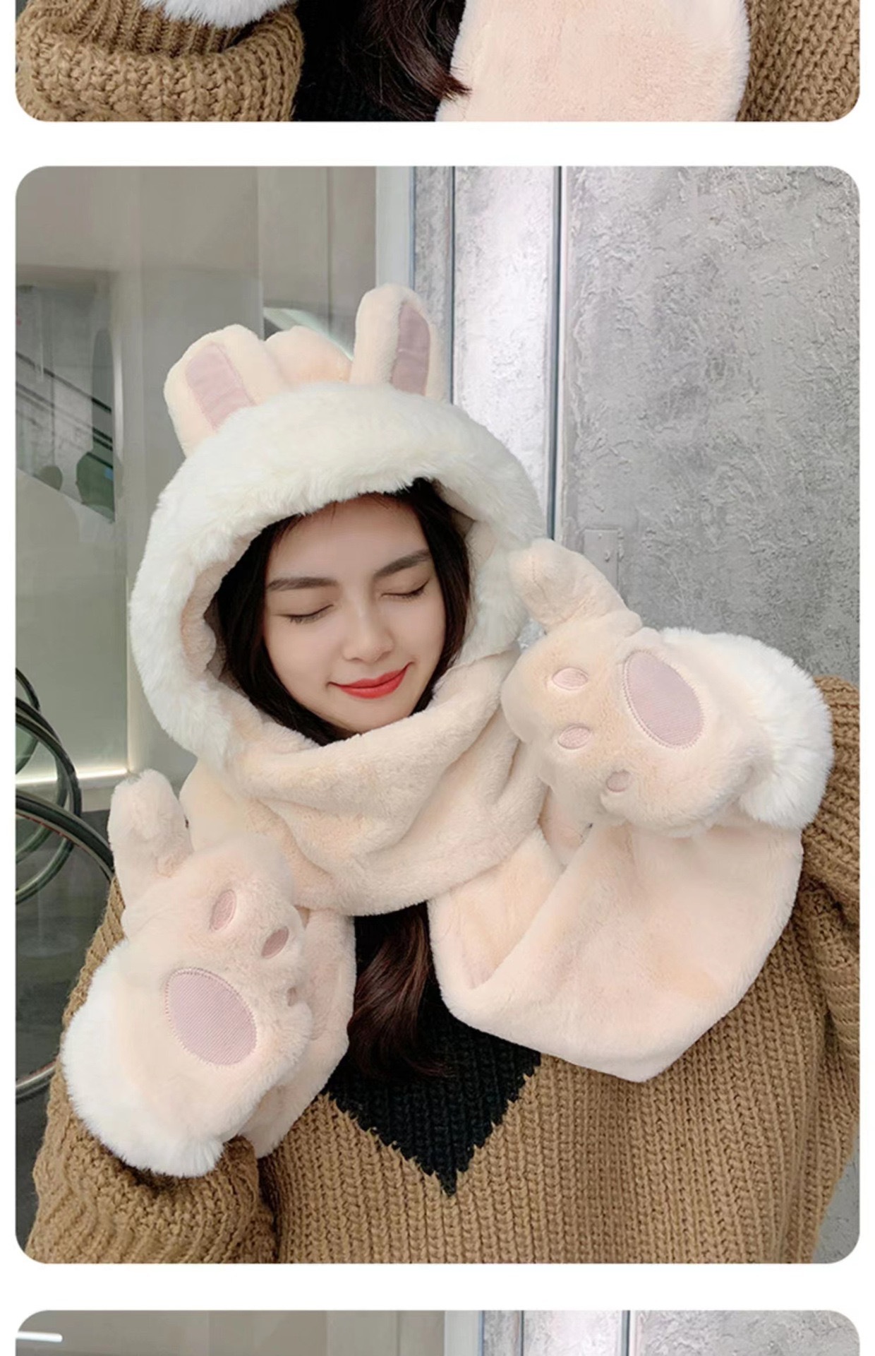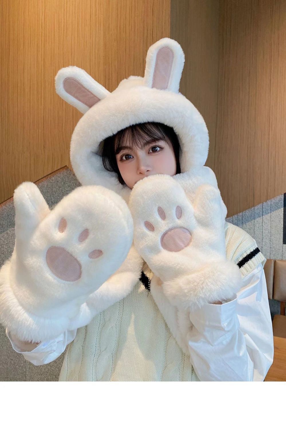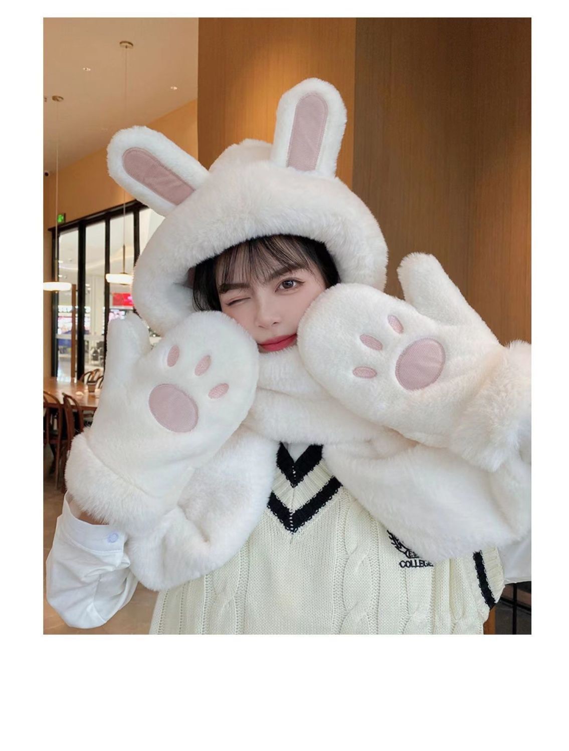 한국식 모자 여자 가을과 겨울 모자 스카프 3 피스 세트 귀여운 토끼 귀 올매치 두꺼운 따뜻한 스카프 3 피스 세트스토어 가기