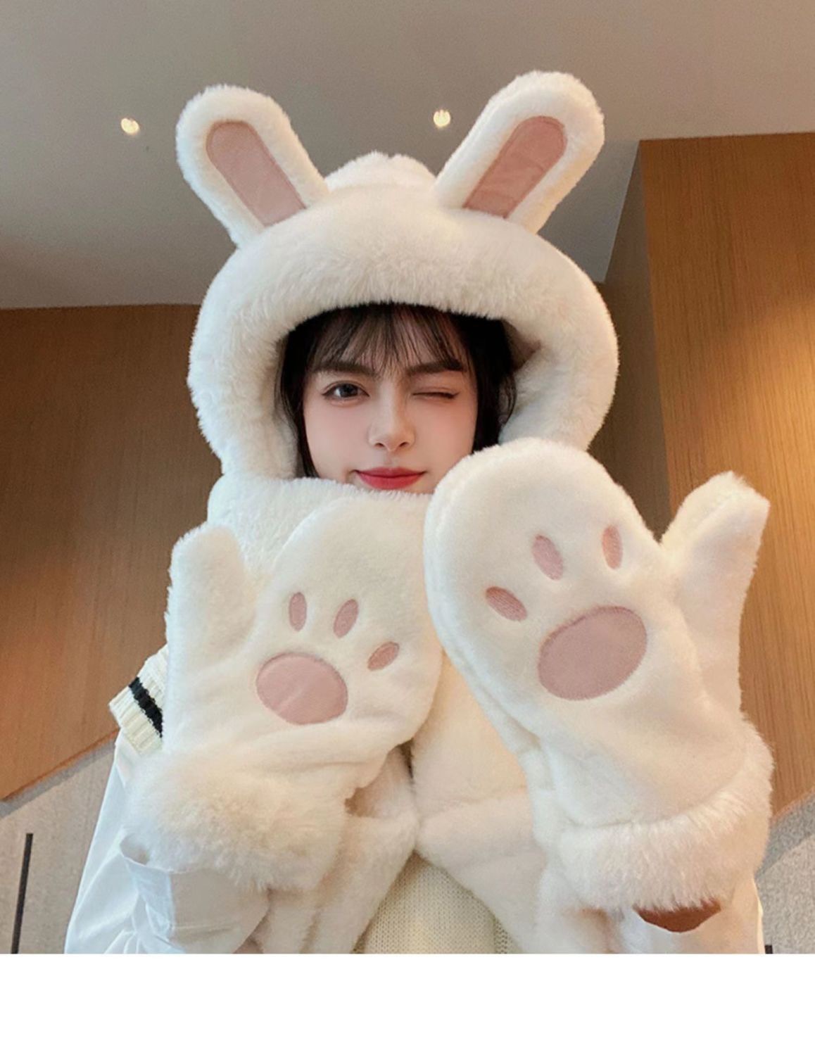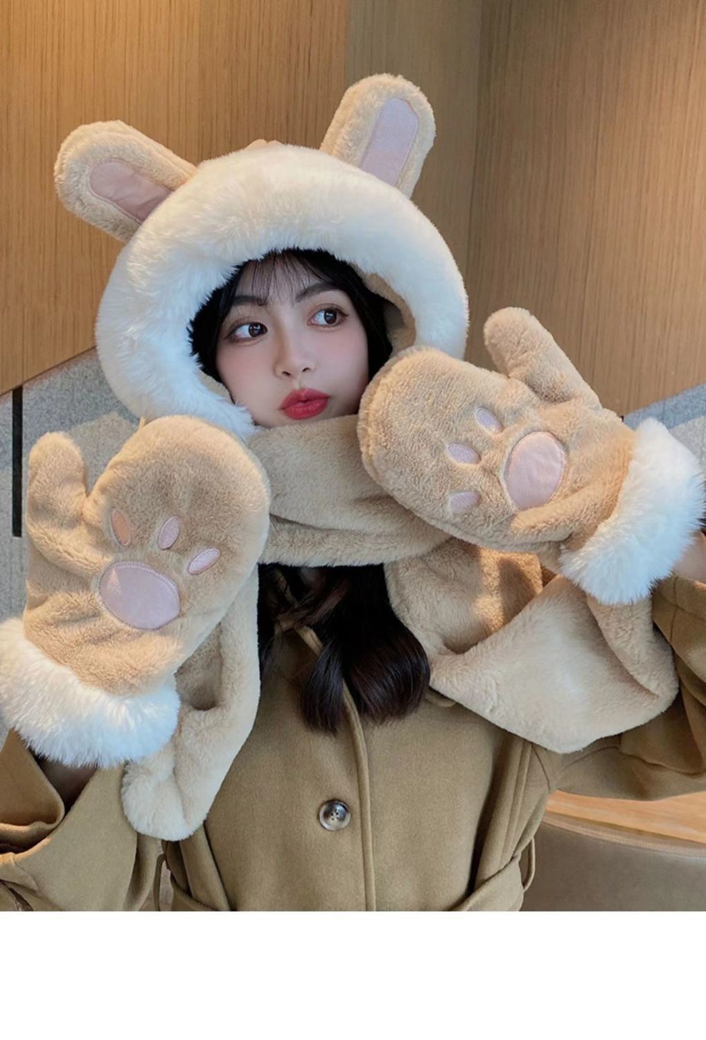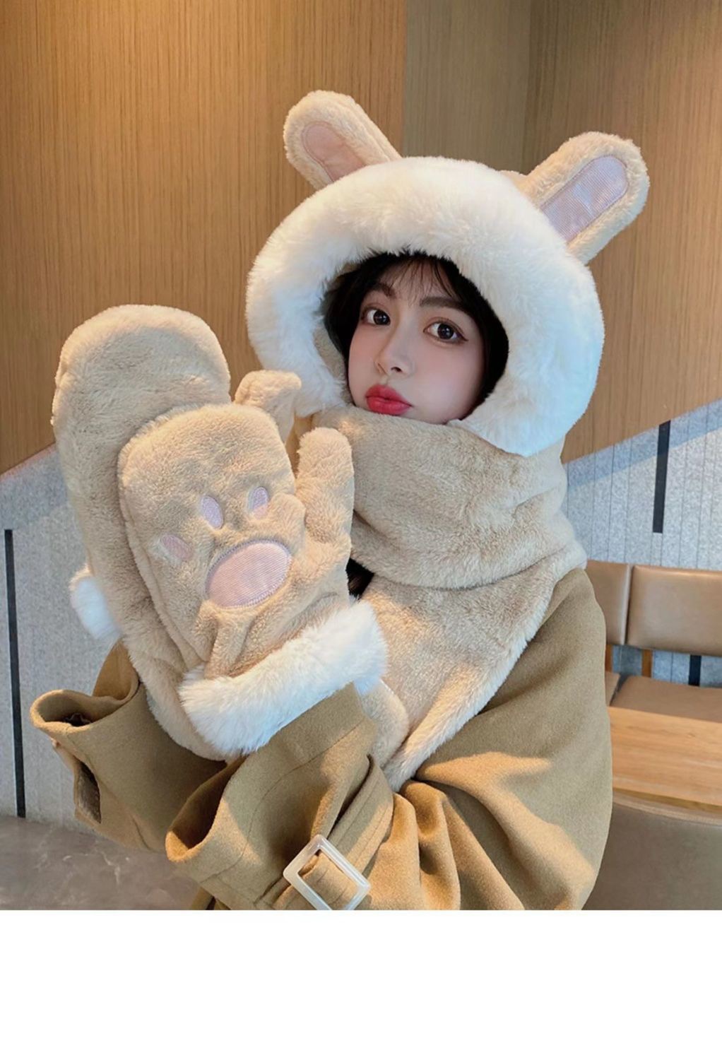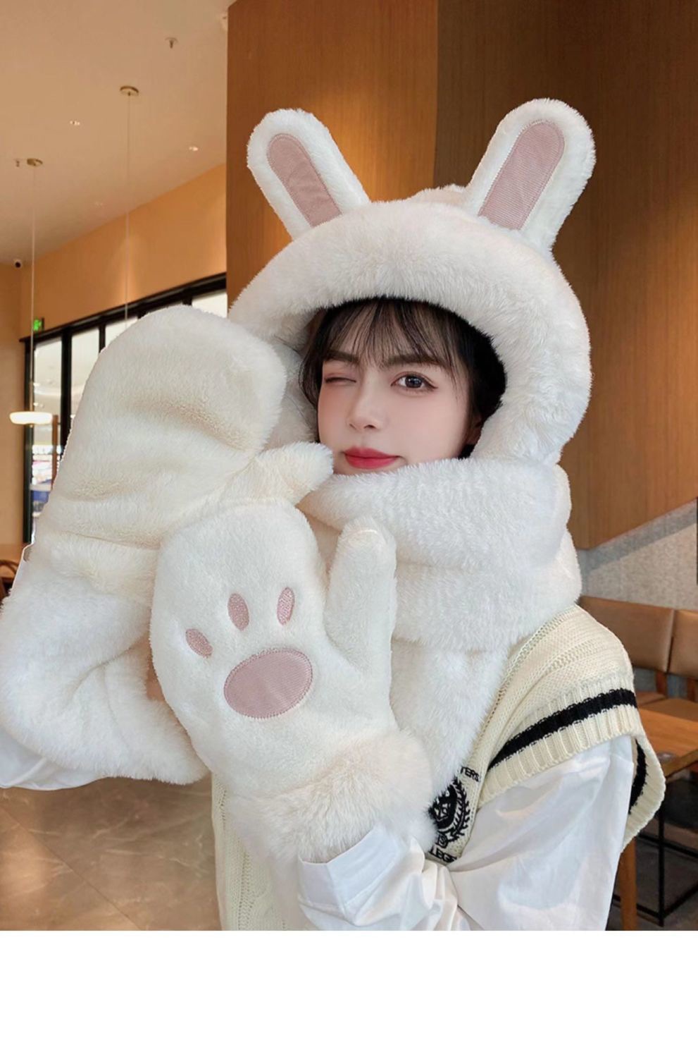 한국식 모자 여자 가을과 겨울 모자 스카프 3 피스 세트 귀여운 토끼 귀 올매치 두꺼운 따뜻한 스카프 3 피스 세트스토어 가기