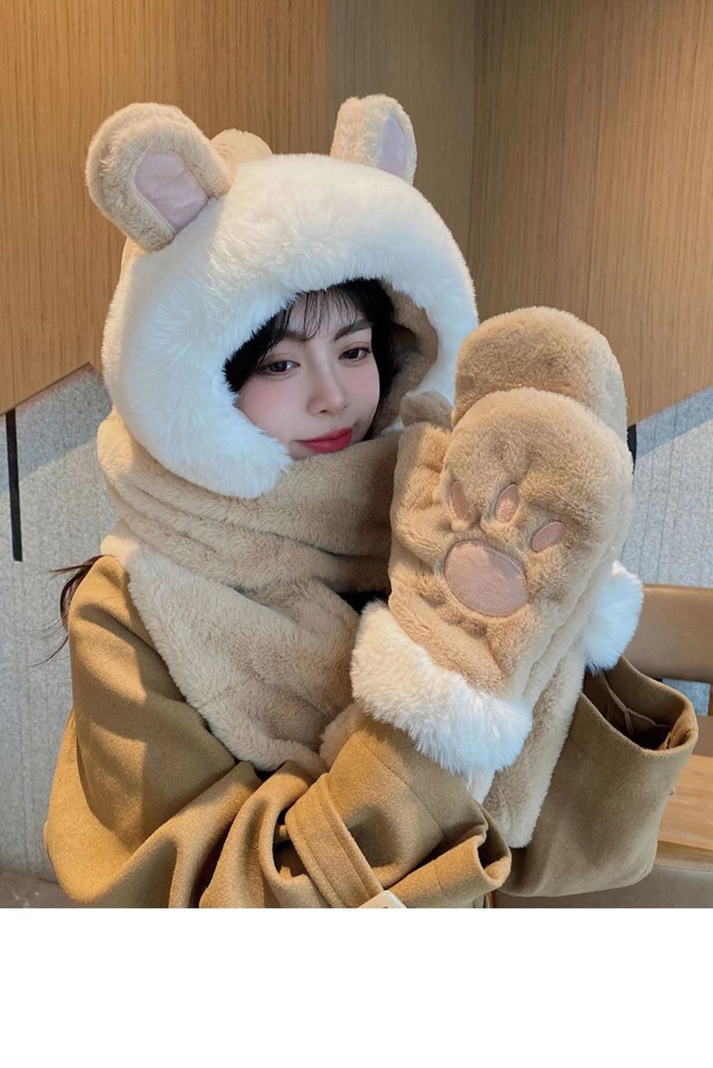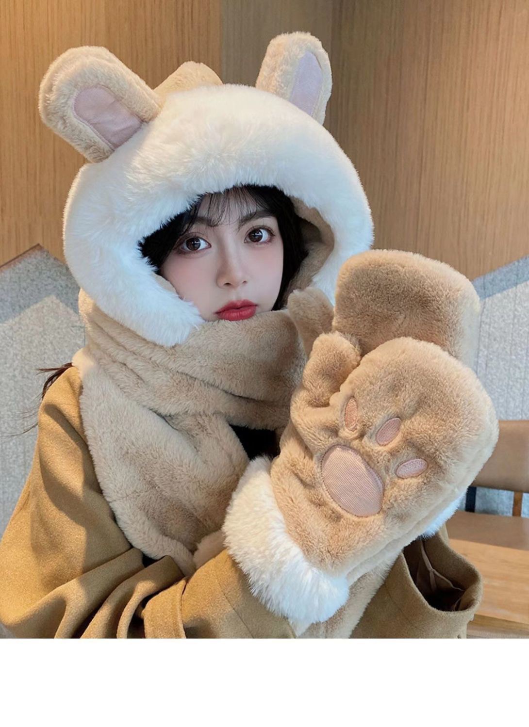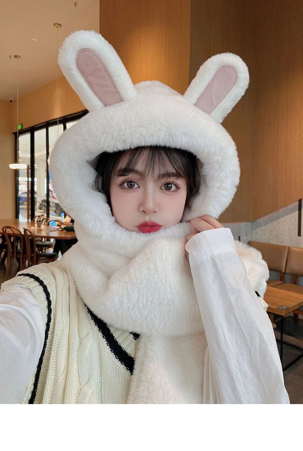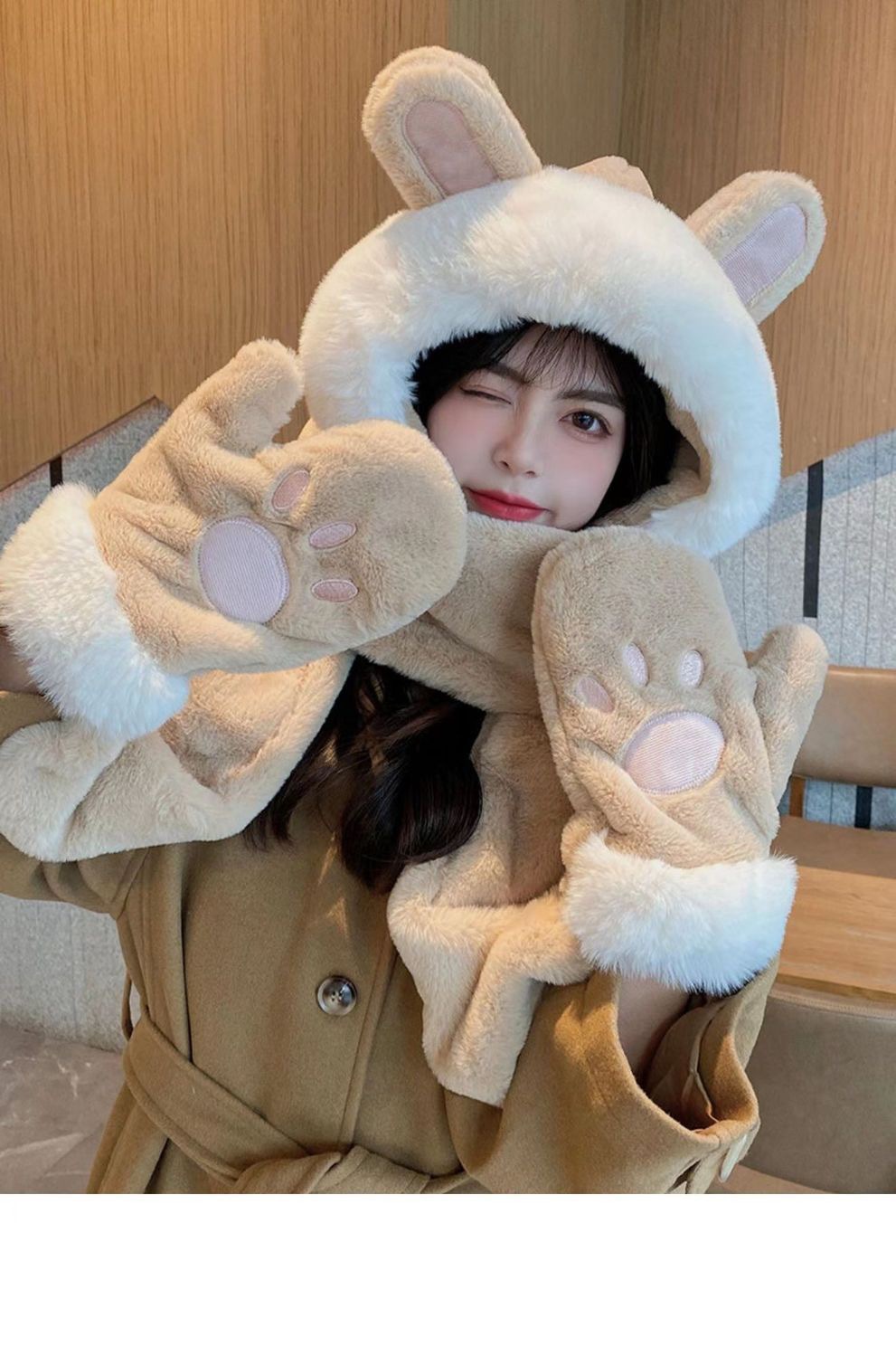 한국식 모자 여자 가을과 겨울 모자 스카프 3 피스 세트 귀여운 토끼 귀 올매치 두꺼운 따뜻한 스카프 3 피스 세트스토어 가기