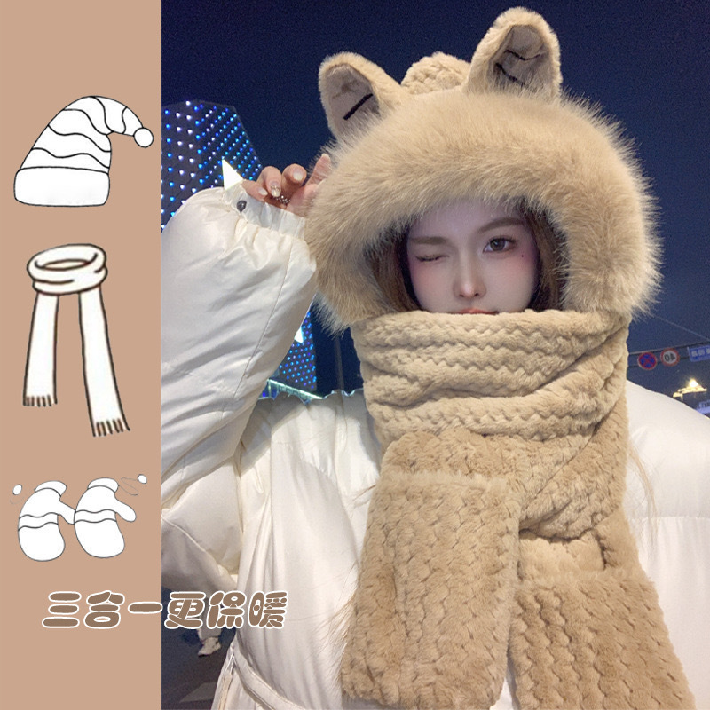 한국식 모자 여자 가을과 겨울 모자 스카프 3 피스 세트 귀여운 토끼 귀 올매치 두꺼운 따뜻한 스카프 3 피스 세트