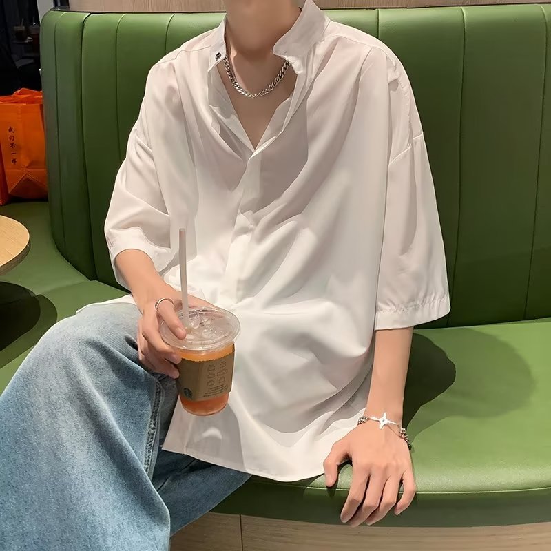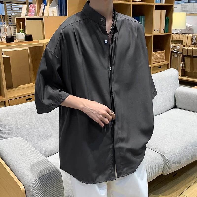 새로운 중국 스타일 국가 스타일 셔츠 남자의 반팔 수직 칼라 고급 포장 그레이 아이스 실크 셔츠 7 소매 빈티지 재킷
