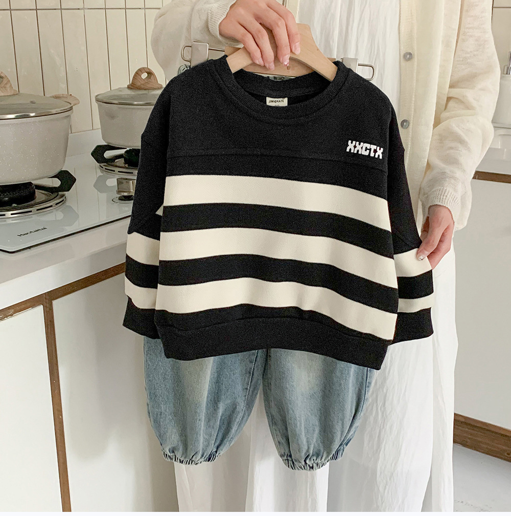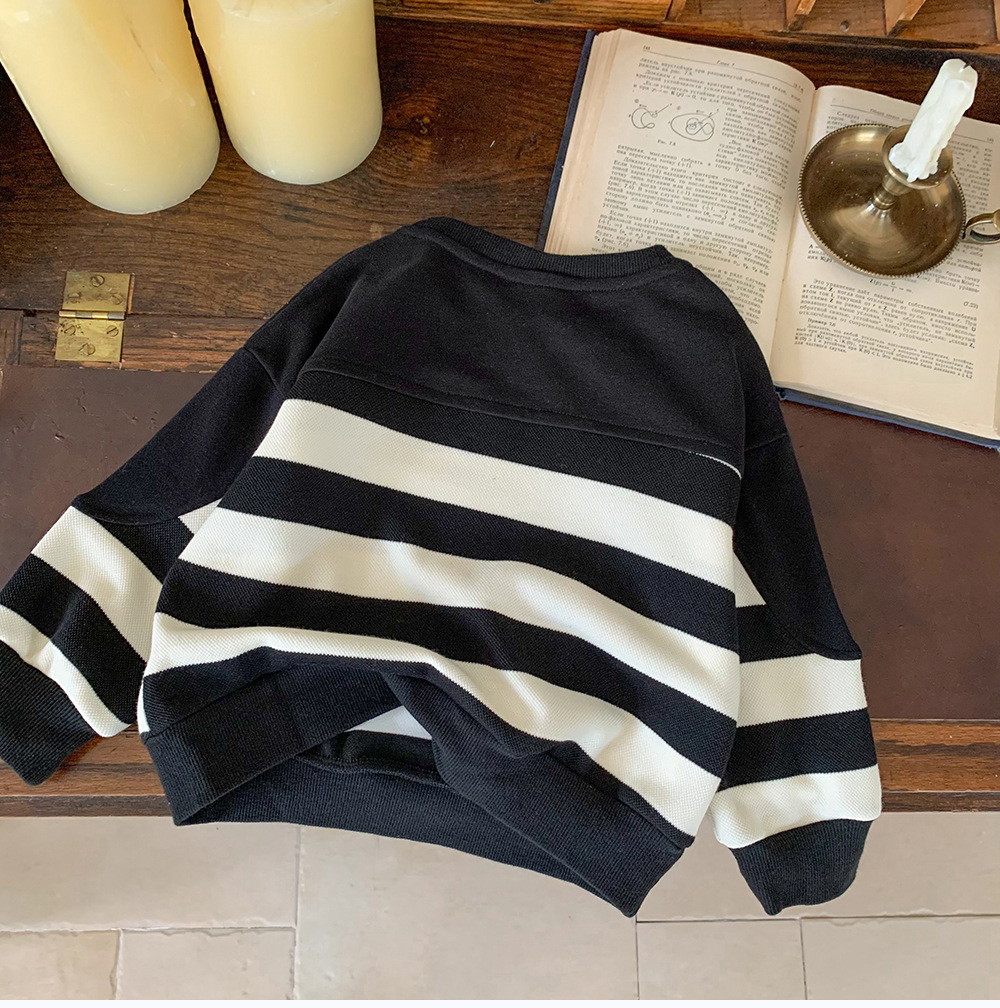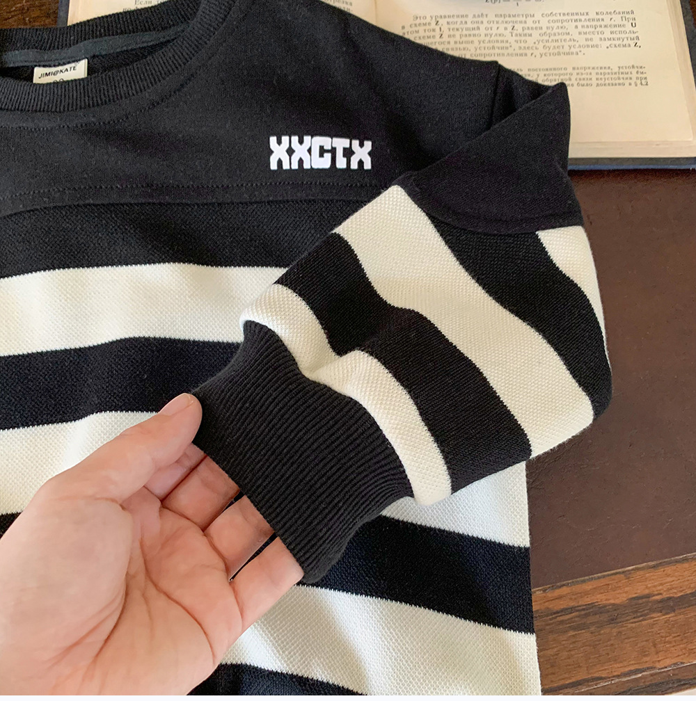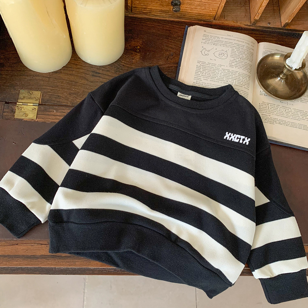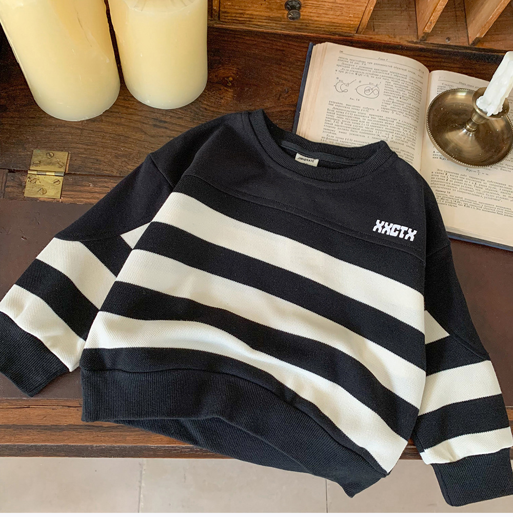 어린이 스웨터 2024 새로운 도착 가을 소년 스웨터 줄무늬 한국 스타일 트렌디 블랙 탑 어린이 풀오버 트렌디스토어 가기