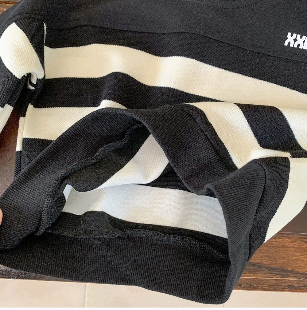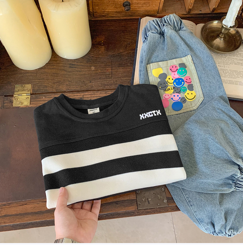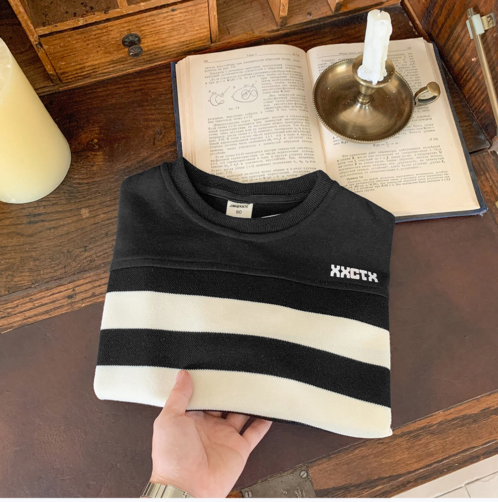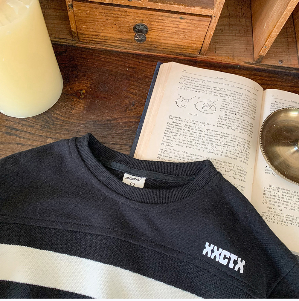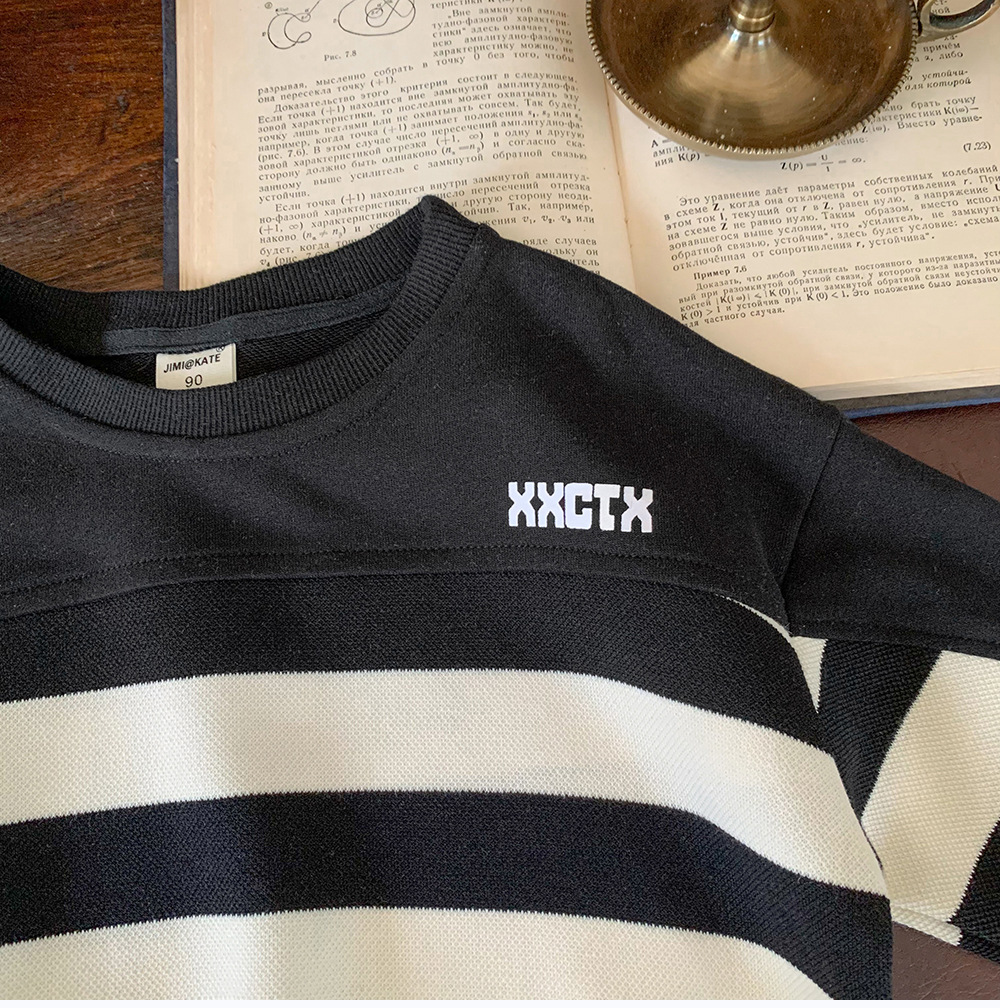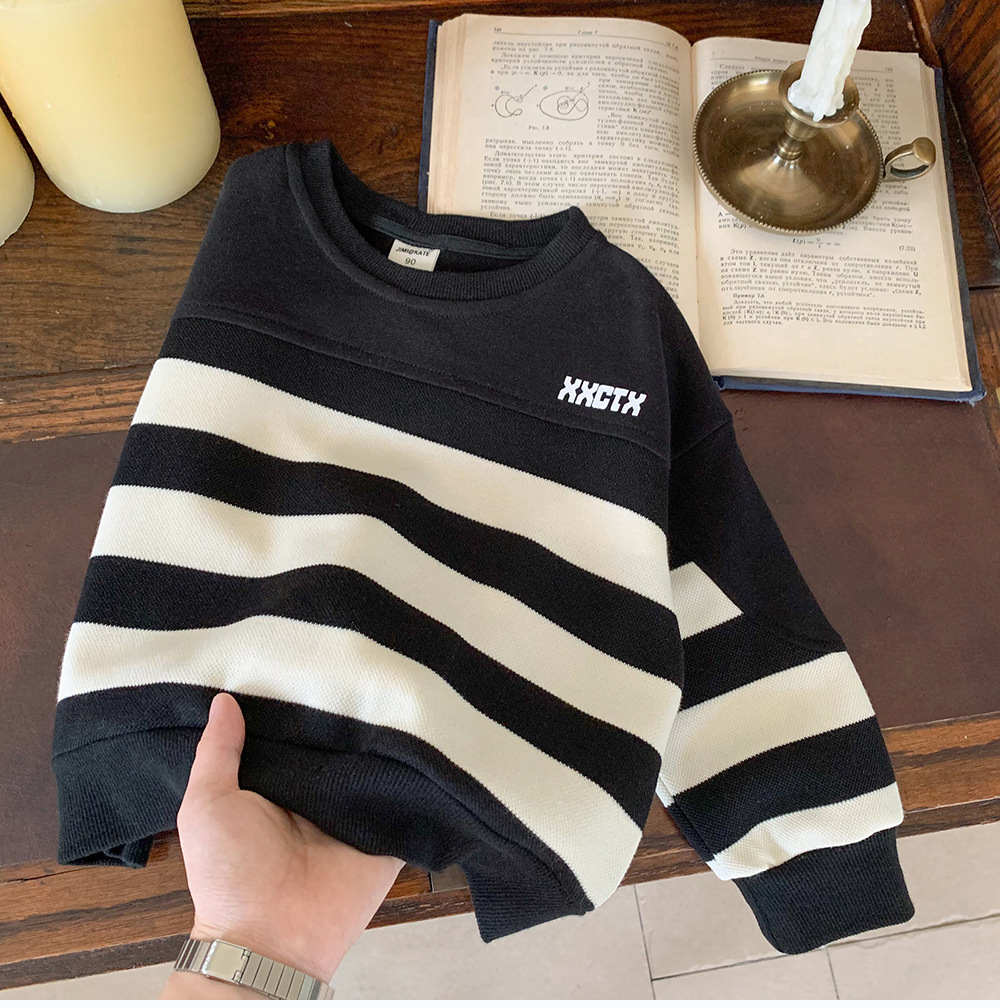 어린이 스웨터 2024 새로운 도착 가을 소년 스웨터 줄무늬 한국 스타일 트렌디 블랙 탑 어린이 풀오버 트렌디스토어 가기