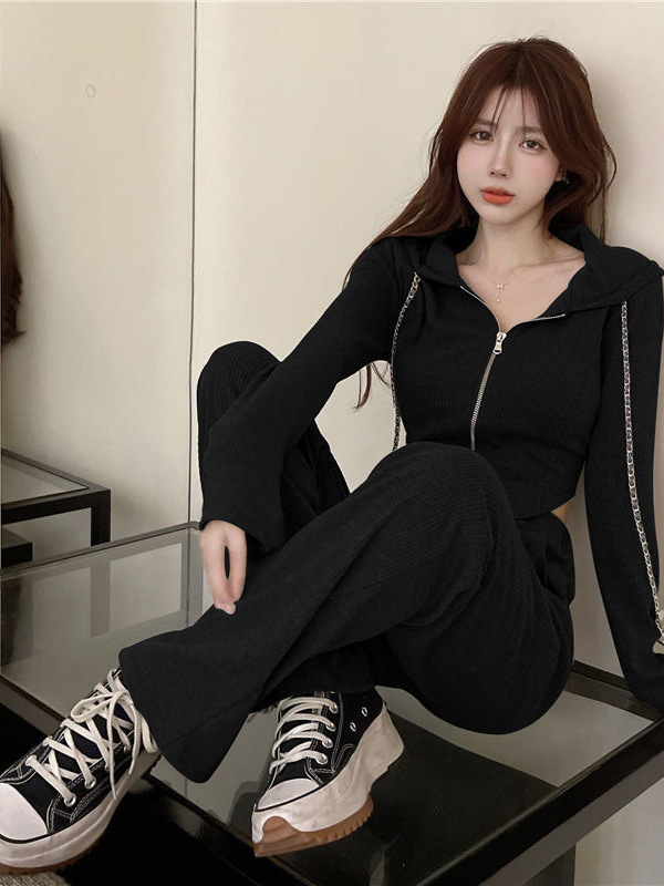 여성을위한 패션 정장 2025 봄, 가을 새로운 느슨한 캐주얼 스포츠 와이드 레그 팬츠 하이 웨이스트 슬림 스웨트 셔츠 투피스 세트