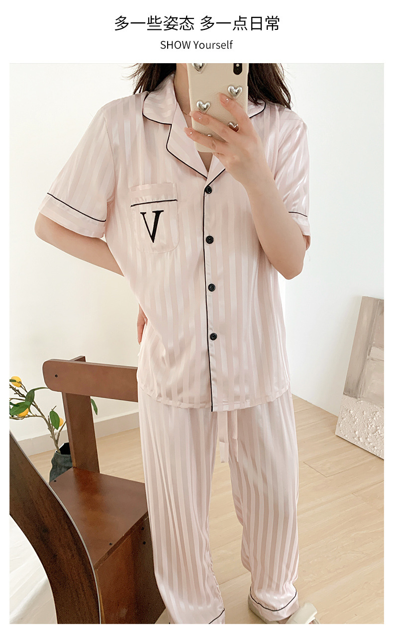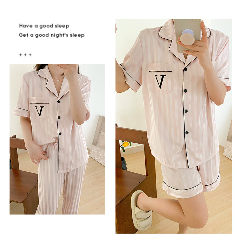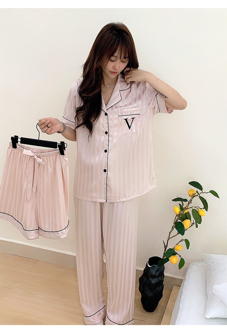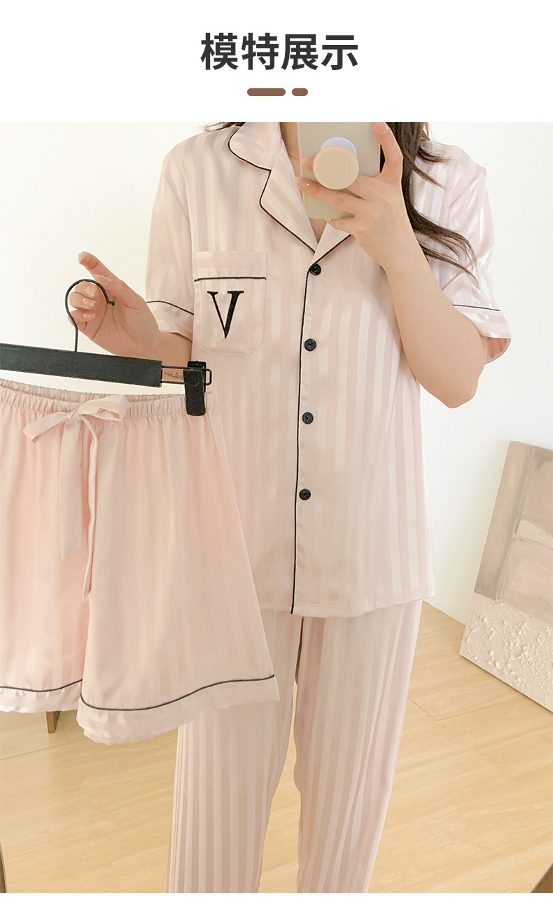 자카드 스트라이프 반팔 아이스 실크 파자마 여성 여름과 가을 3 피스 카디건 외부 워터 라이트 실크 홈 의류 하이 엔드 센스스토어 가기