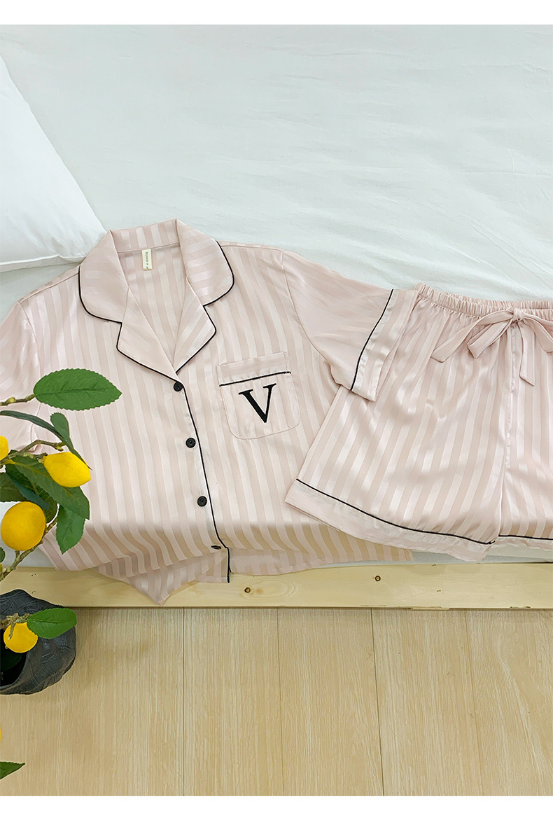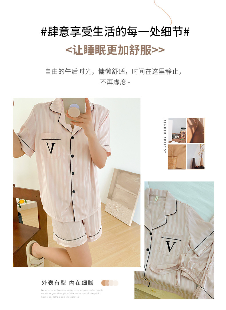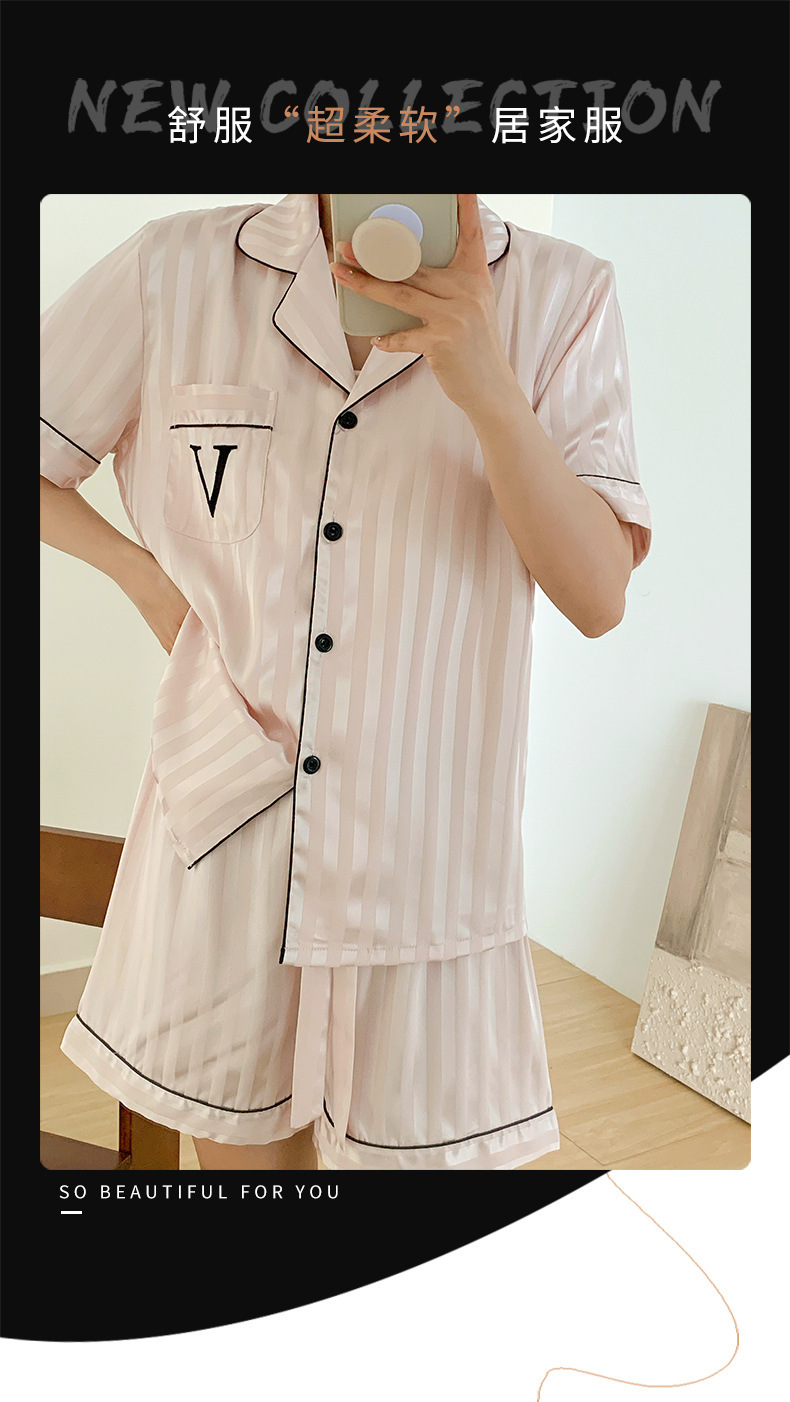 자카드 스트라이프 반팔 아이스 실크 파자마 여성 여름과 가을 3 피스 카디건 외부 워터 라이트 실크 홈 의류 하이 엔드 센스스토어 가기