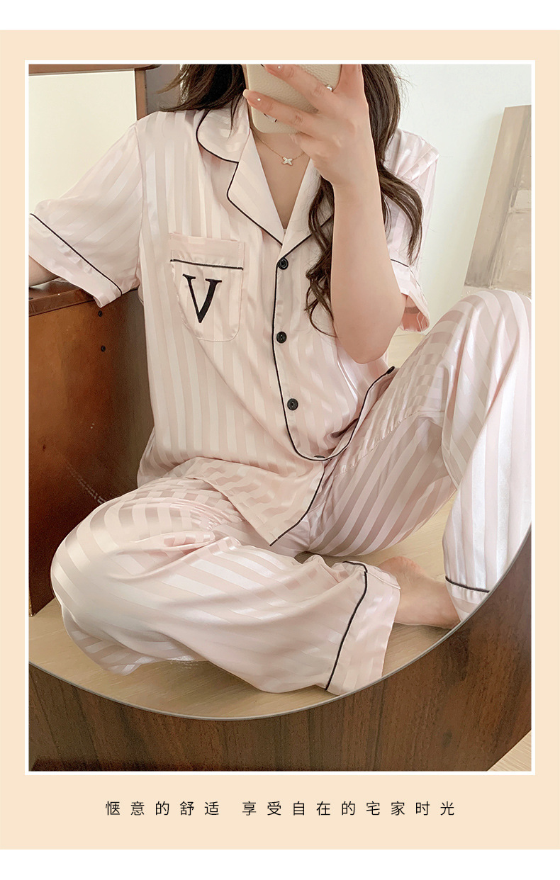 자카드 스트라이프 반팔 아이스 실크 파자마 여성 여름과 가을 3 피스 카디건 외부 워터 라이트 실크 홈 의류 하이 엔드 센스