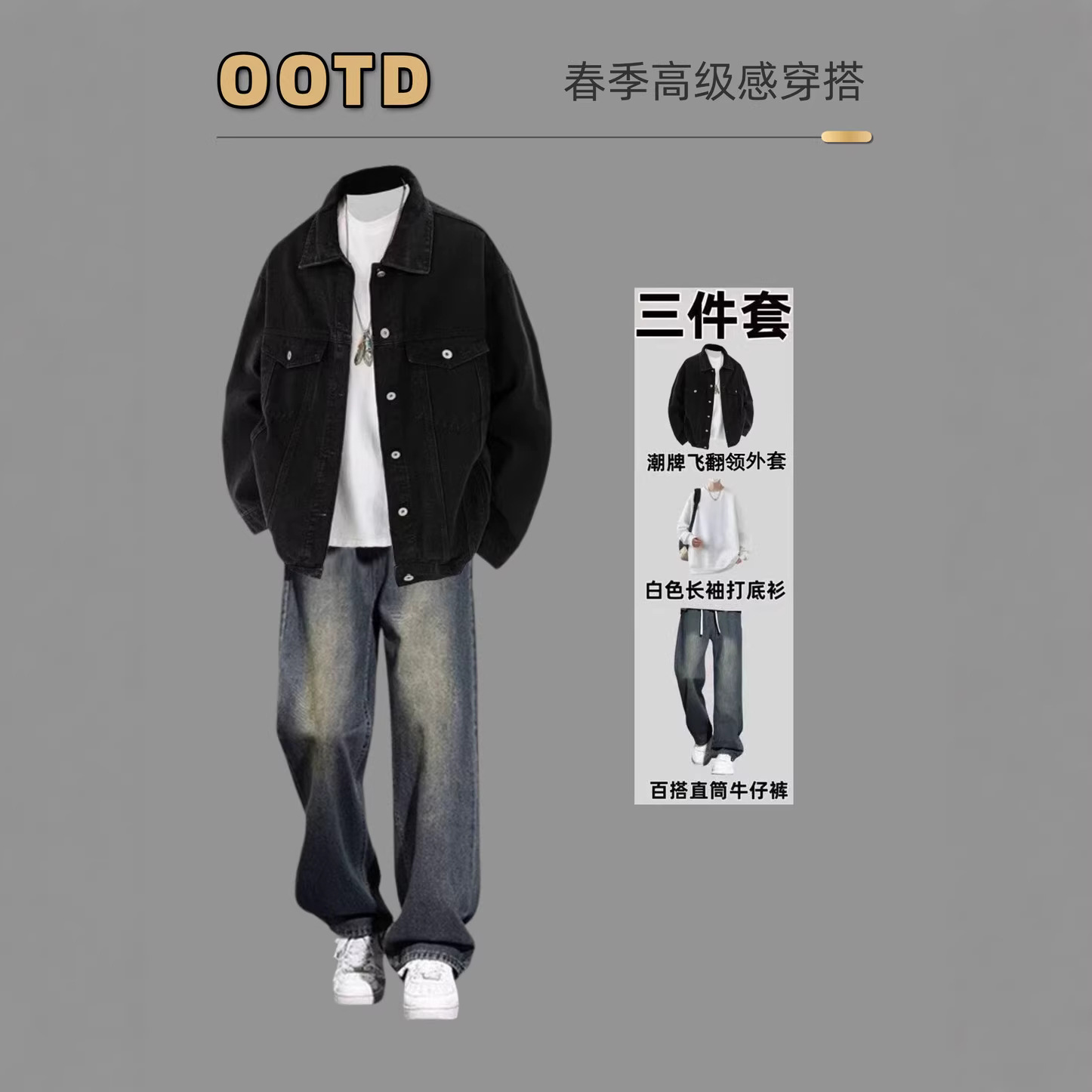 • N067 블랙 재킷 + 긴팔 흰색 티셔츠 + K50 블루 데님 팬츠