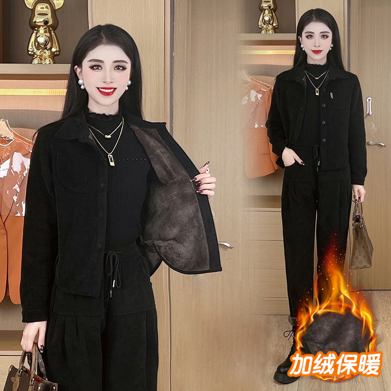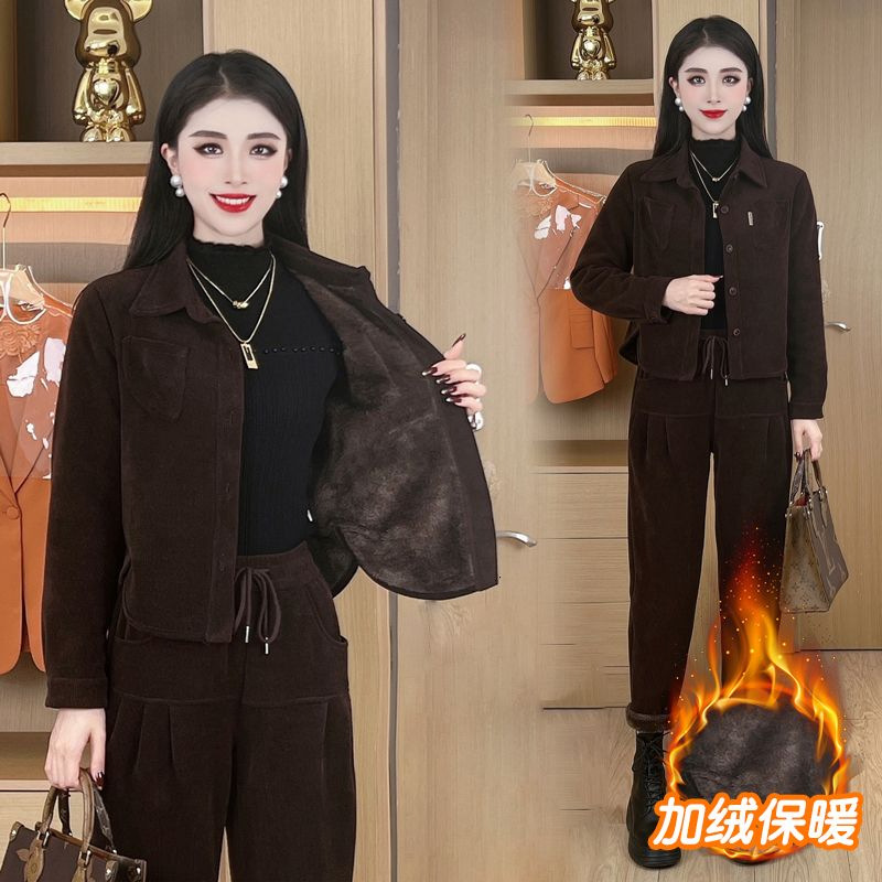 겨울 기모 따뜻한 유행 세트 여성 새 어머니의 나이를 줄이는 코듀로이 코트 두꺼운 고급 2 피스 세트스토어 가기