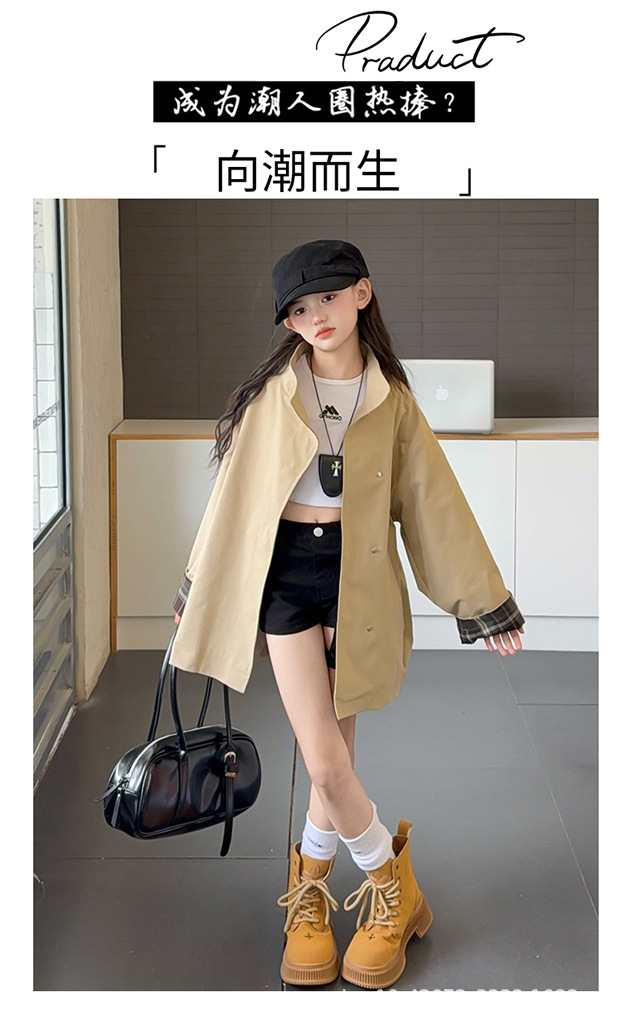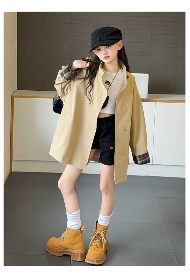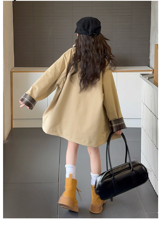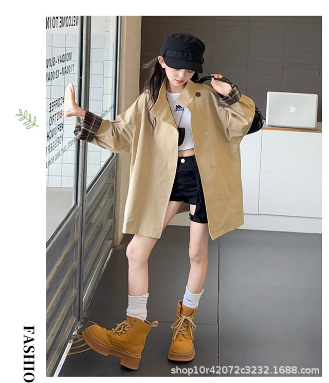 걸스 칼리지 스타일 옷깃 윈드 브레이커 봄 새로운 면 단일 가슴 대형 어린이를위한 중간 길이의 허리 코트