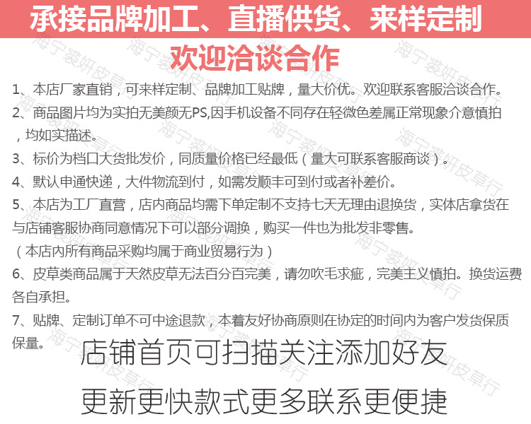 Our store undertakes brand processing, Taobao orders, live streaming supply, sample customization, and physical merchant pickup. Welcome to contact customer service to discuss cooperation!