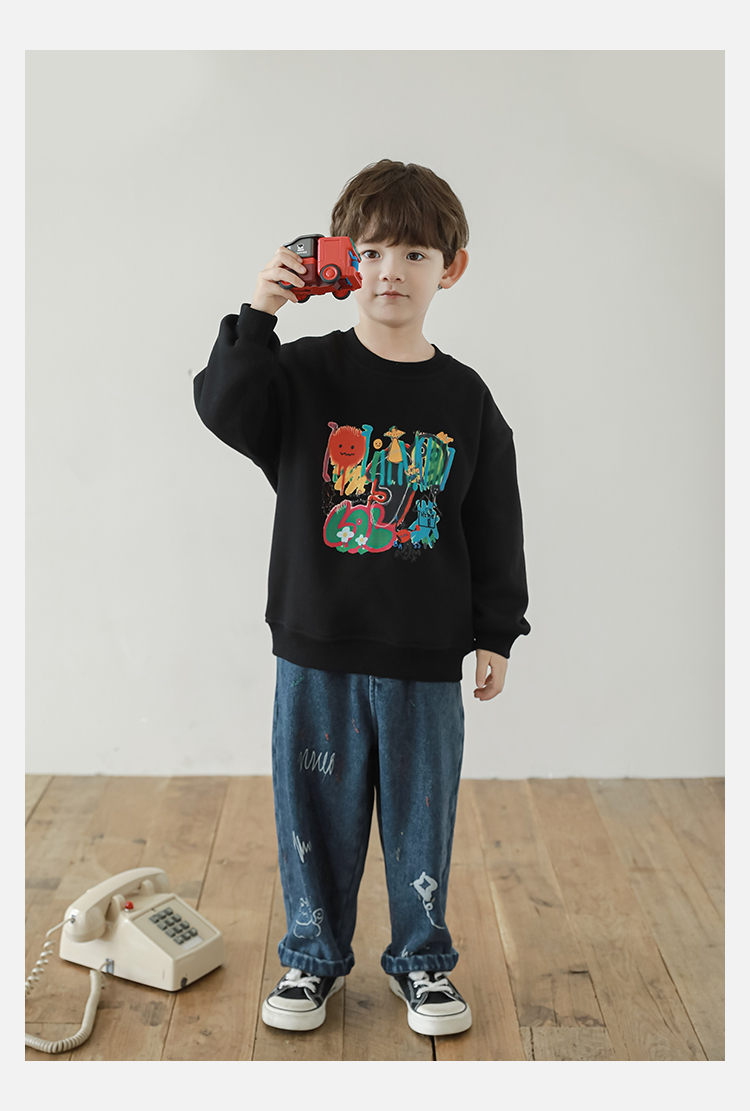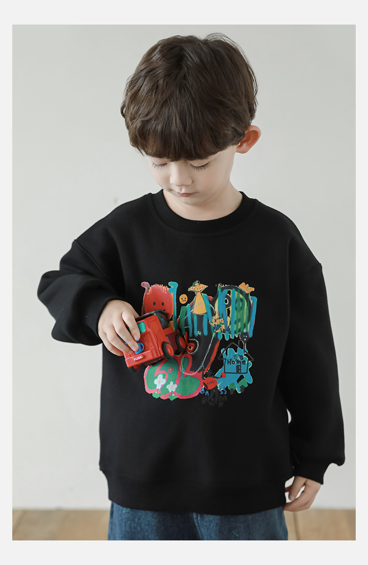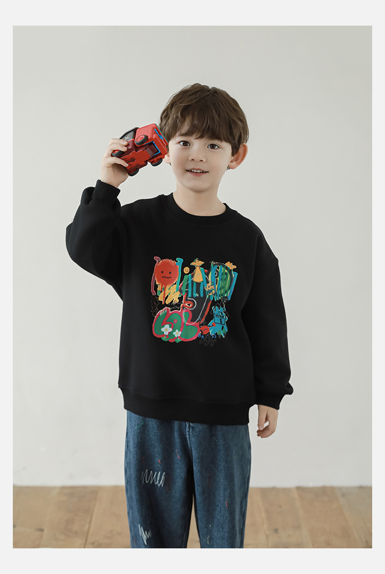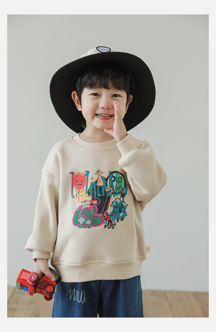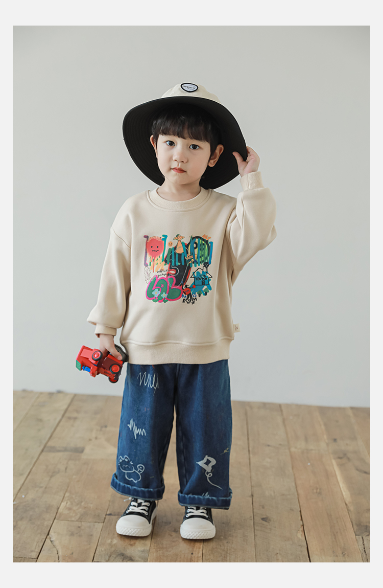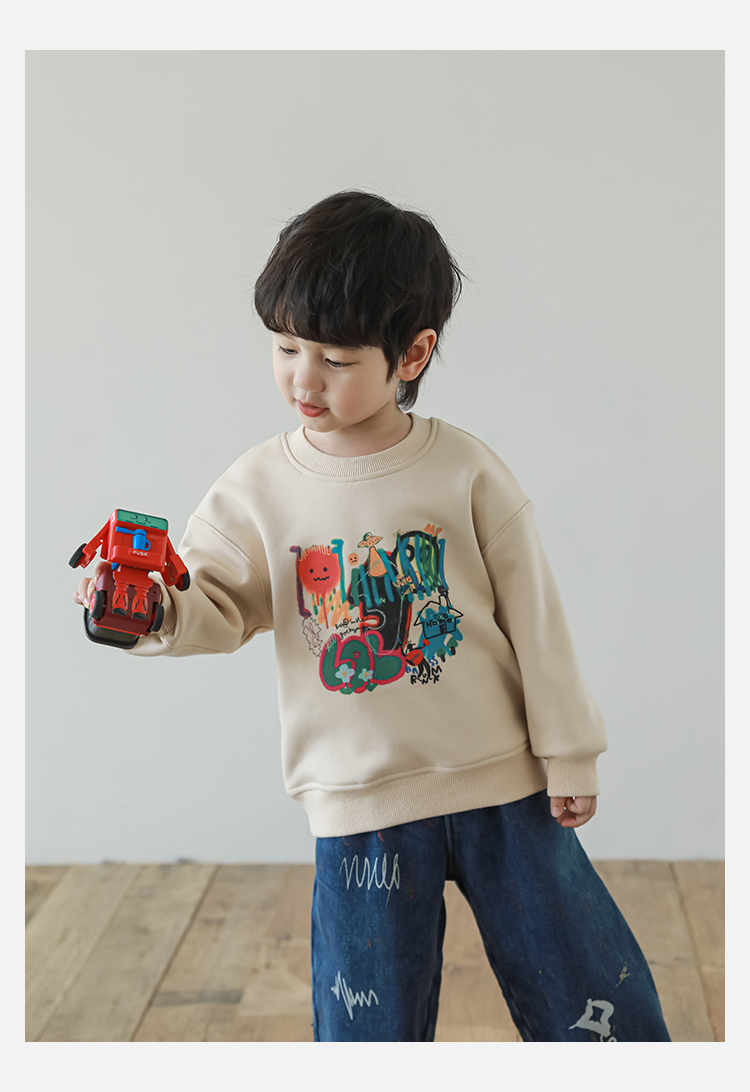 Wurib One Boy 2024 새로운 긴 소매 라운드 넥 그래피티 스웨트 셔츠 가을 인기 느슨한 캐주얼 어린이 탑스토어 가기