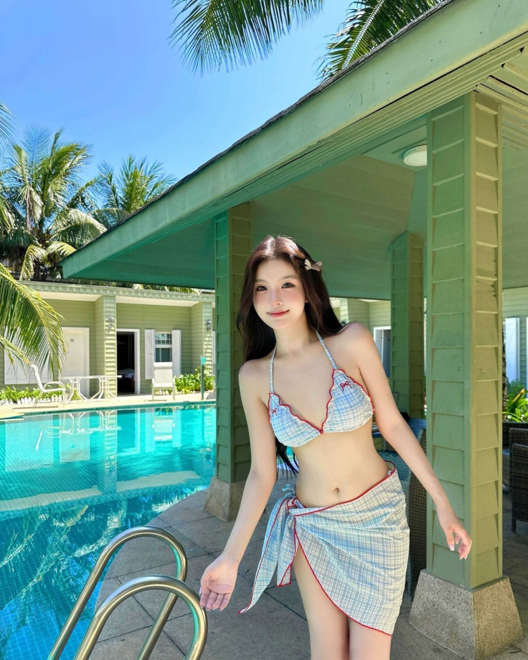 귀여운 소녀의 작은 활 빈티지 격자 3 조각 원피스 비키니 비키니 분할 수영복