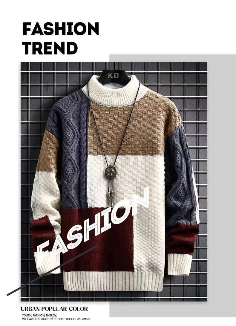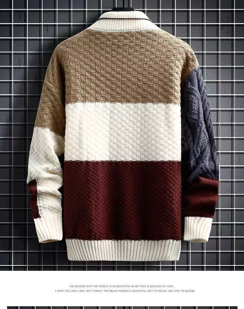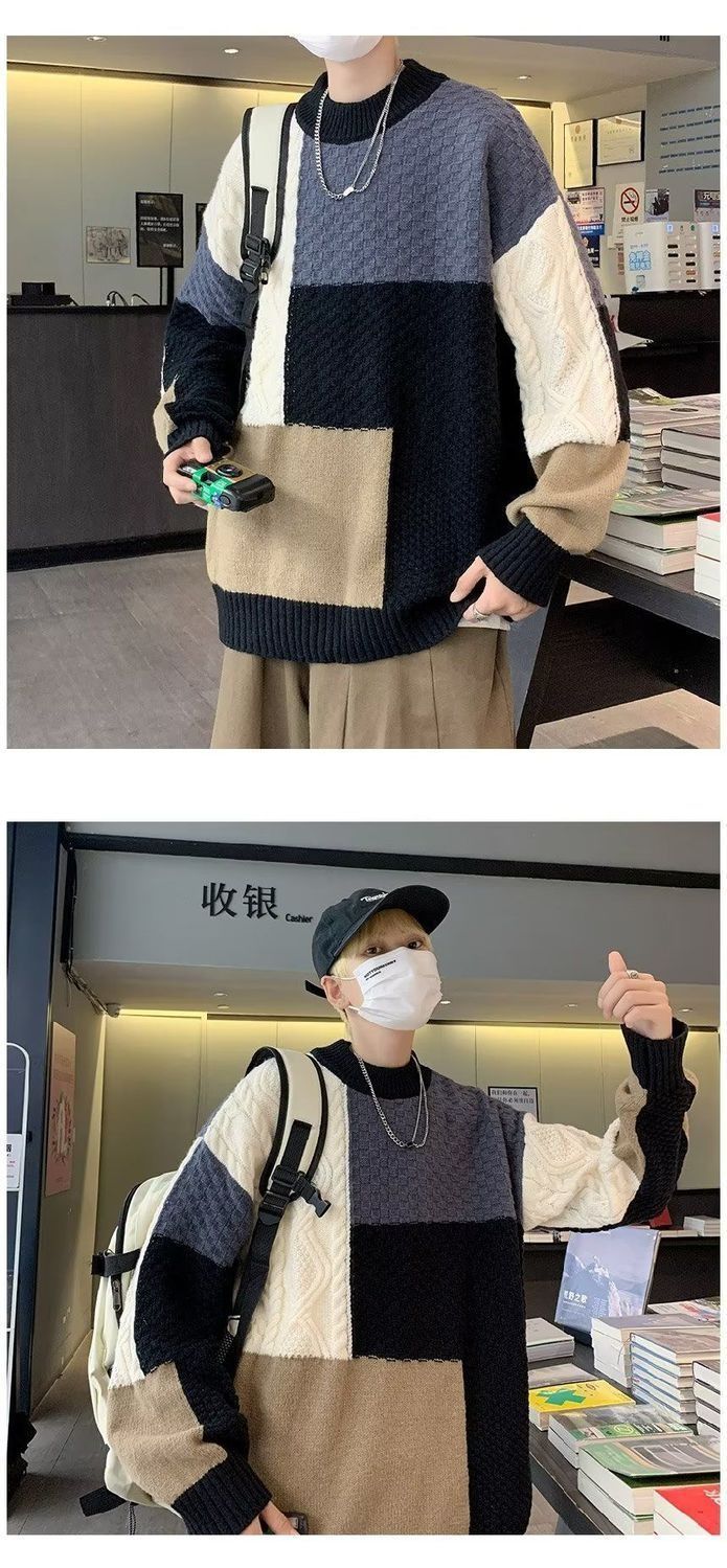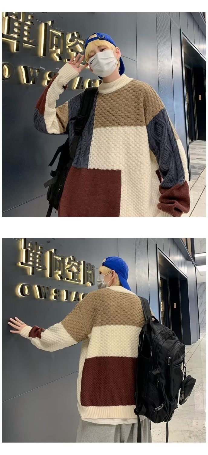 아메리칸 스타일 하이 스트리트 레트로 긴 소매 스웨터 남성용 스티칭 캐주얼 루즈 심플 라운드 넥 잘 생긴 디자인 스웨터 트렌디스토어 가기