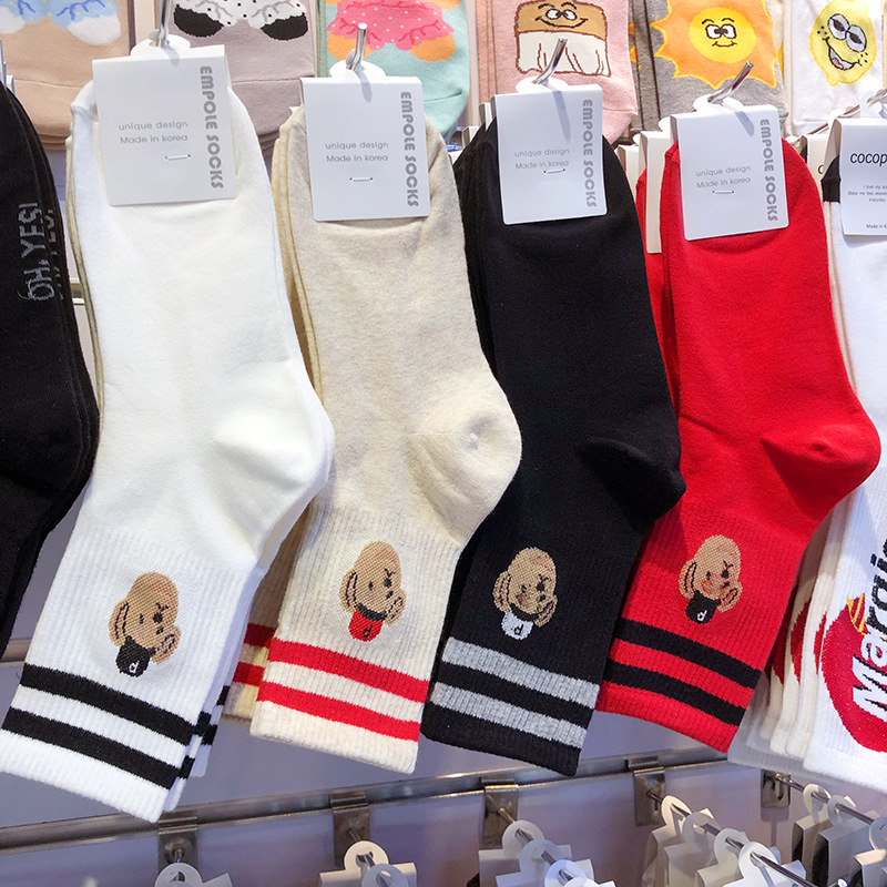 한국 수입 EMPOLE 양말 귀여운 모자 곰 소녀의 중간 길이 양말 대학 스타일 2 바 줄무늬 면 양말스토어 가기