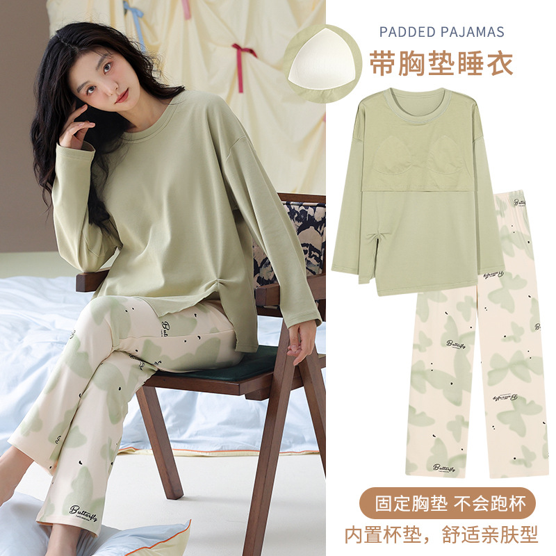 하이 퀄리티 잠옷 여성의 봄과 가을 순면 벨트 가슴 패드 긴 소매 세트 귀여운 만화 2024 새 집 옷스토어 가기