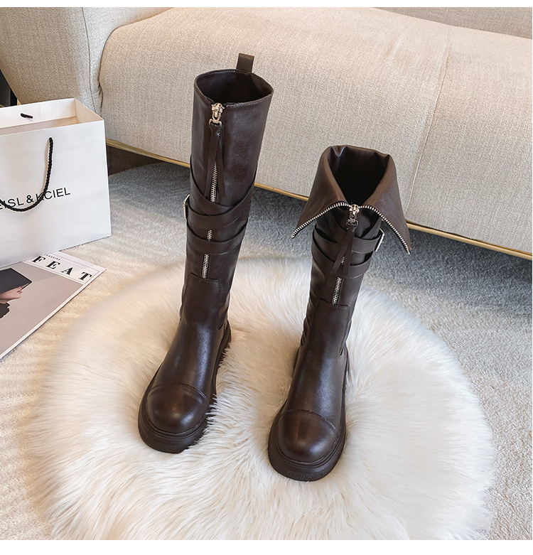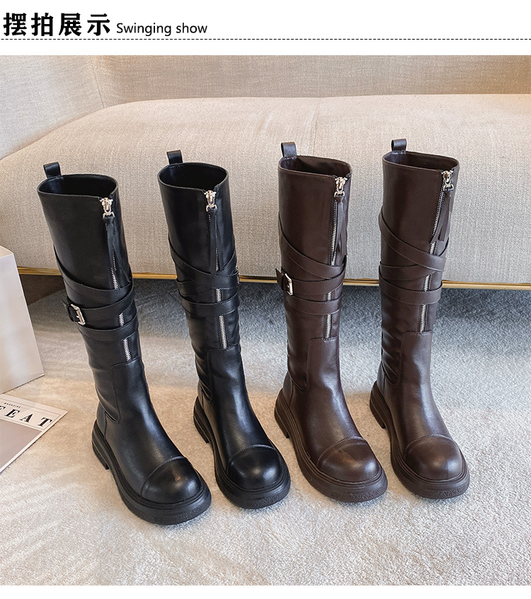 새로운 스타일 부츠 여성 2024 프론트 지퍼 두꺼운 하단 무릎 긴 배럴 나이트 부츠 통통녀 높은 부츠 폭 넓은 마틴 부츠
