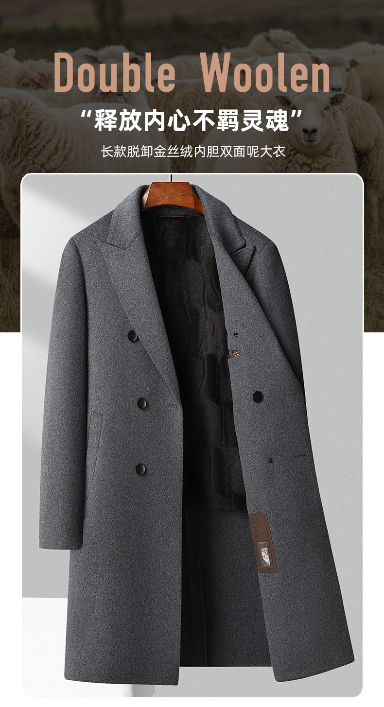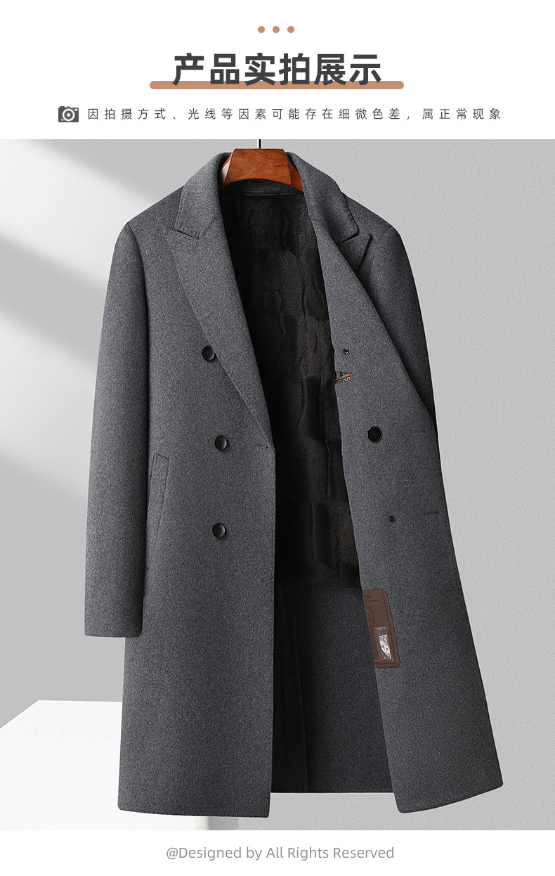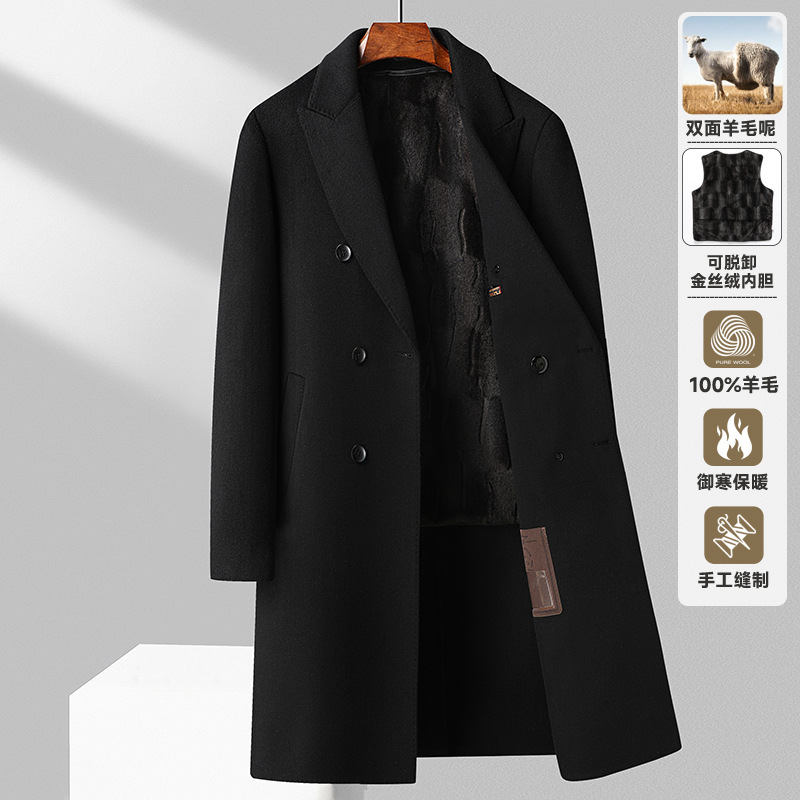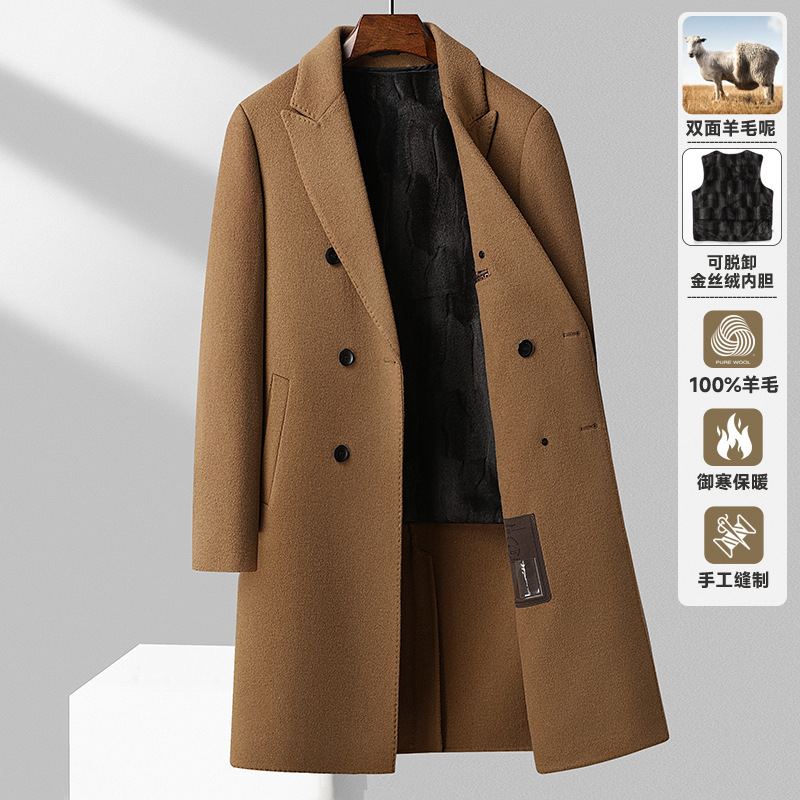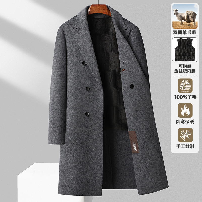 100% 울 더블 브레스티드 무릎 아래 길이 울 코트 2025 가을 겨울 골드 벨벳 안감 양면 울 코트 남성용스토어 가기