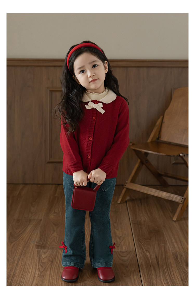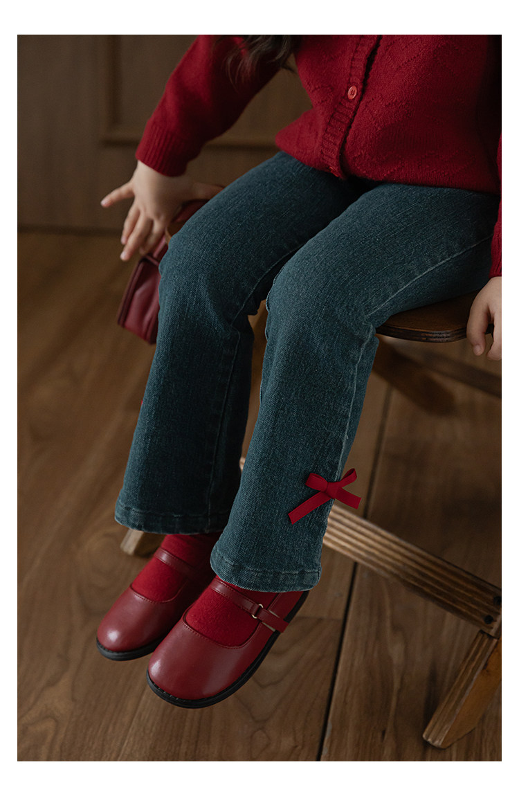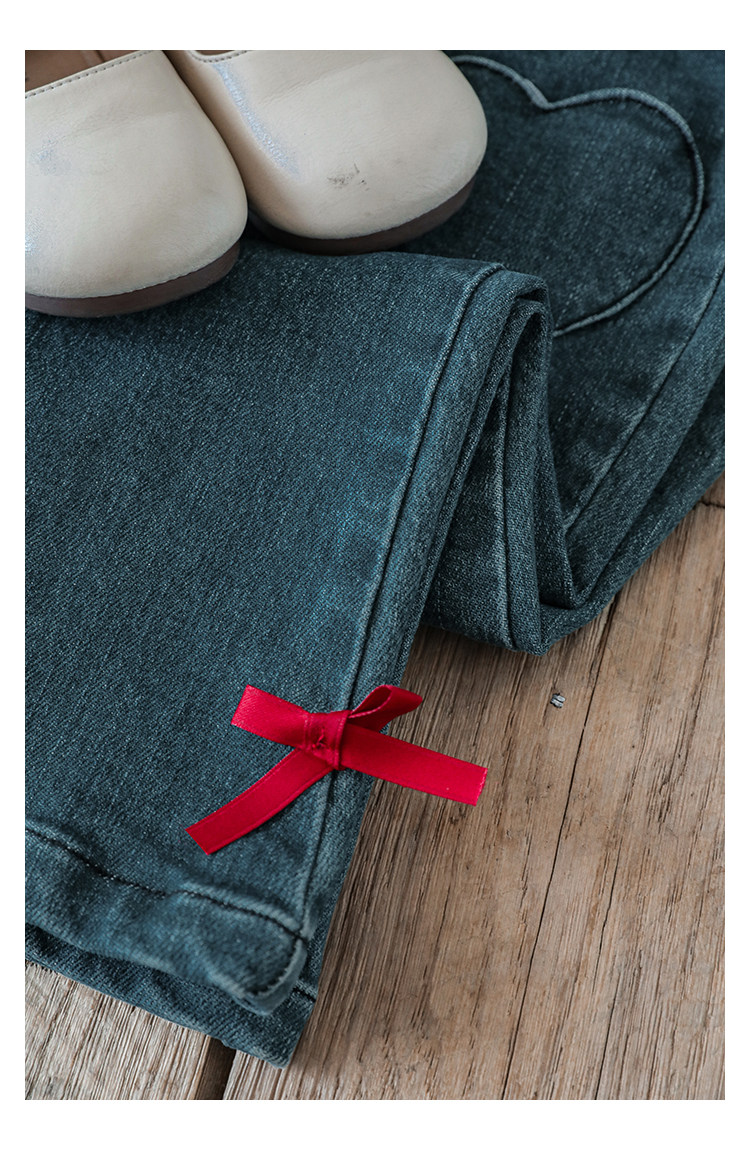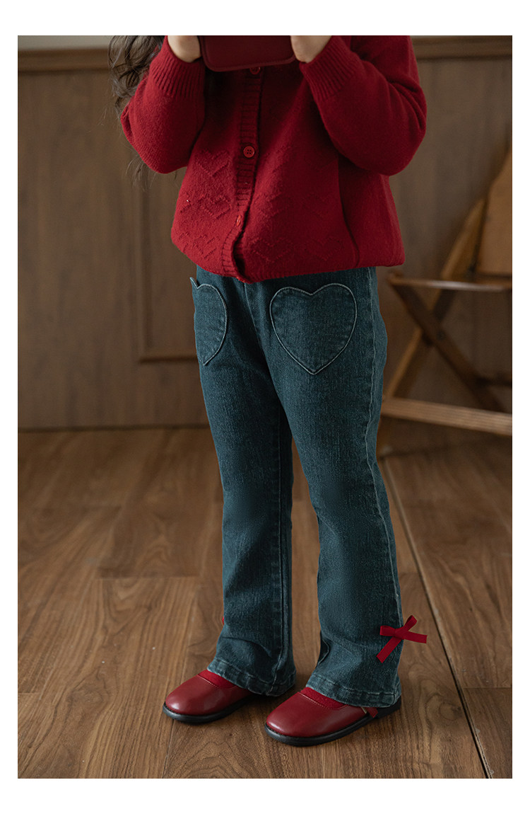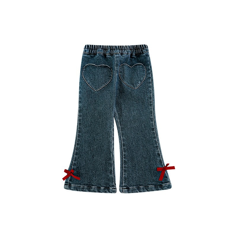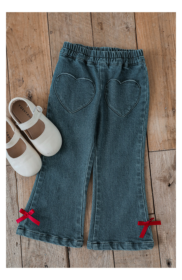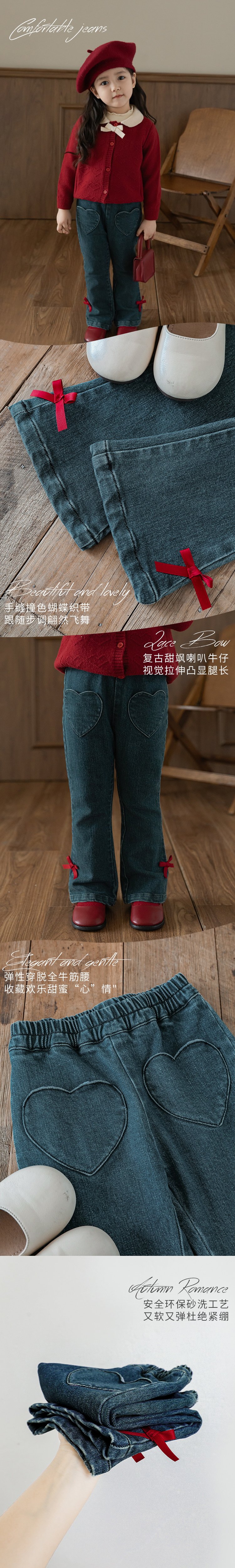Wurib One Girl's Retro Sweet scruff Horn Jeans 가을 어린이 귀여운 대비 나비 리본 바지