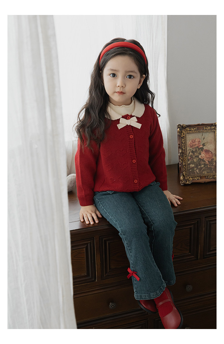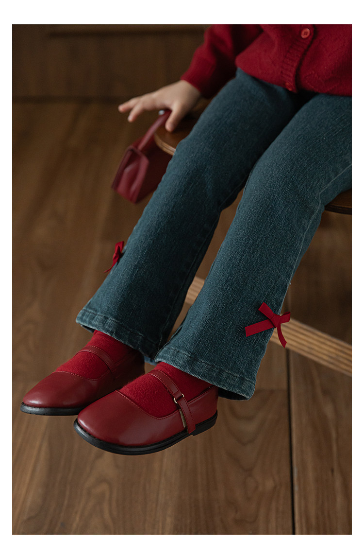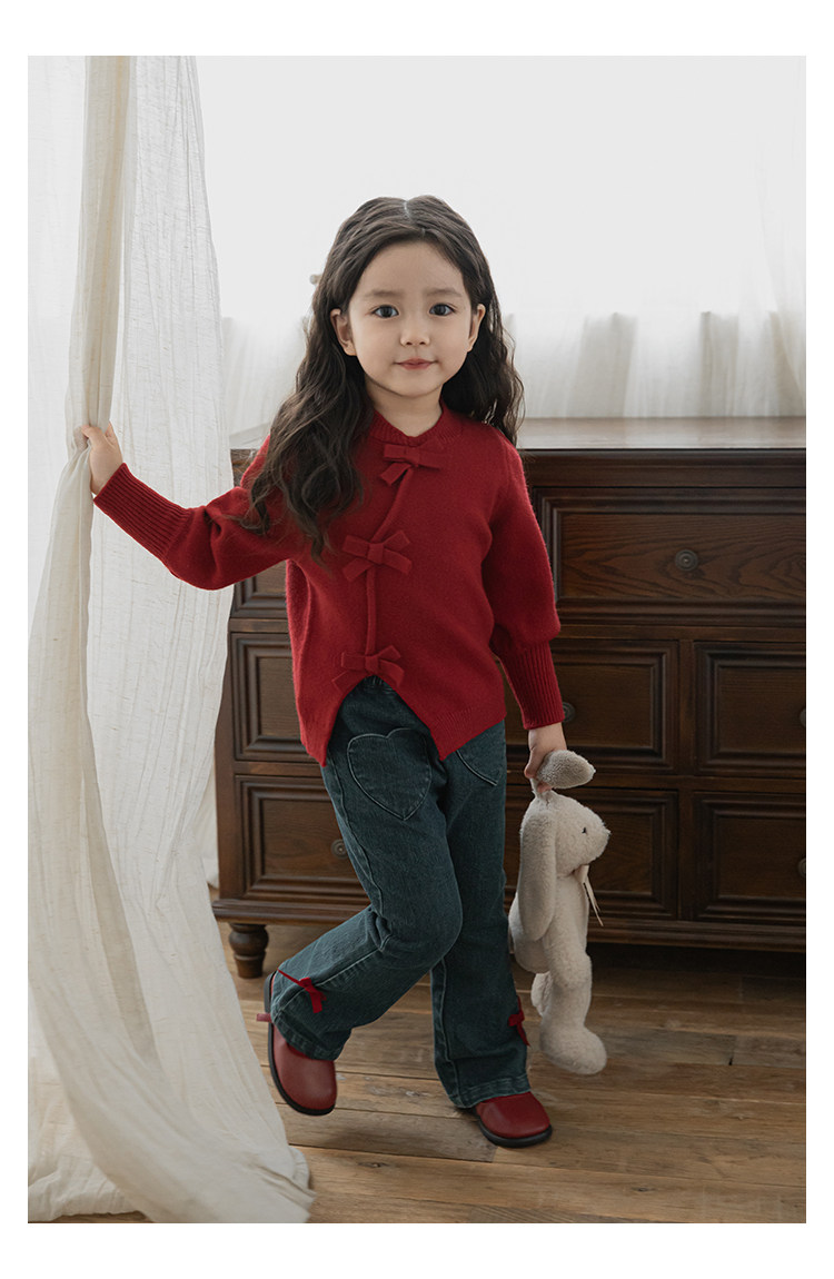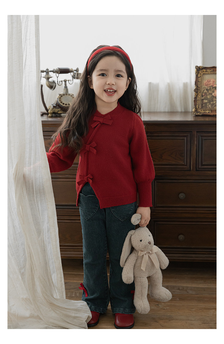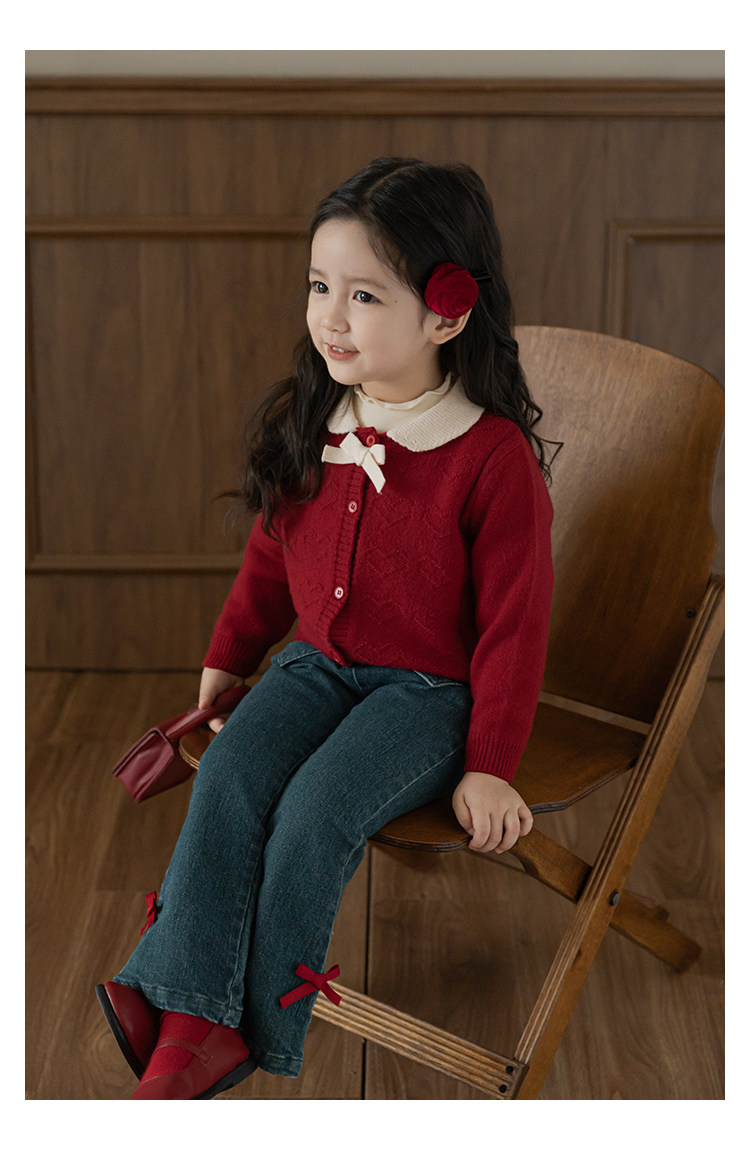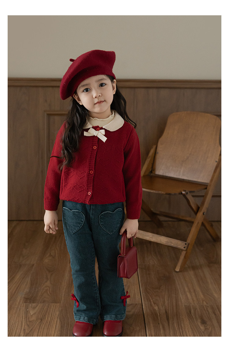 Wurib One Girl's Retro Sweet scruff Horn Jeans 가을 어린이 귀여운 대비 나비 리본 바지