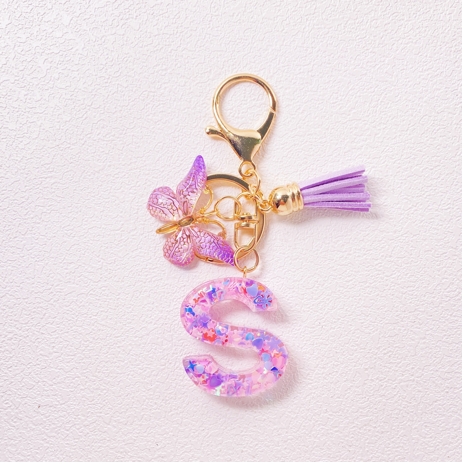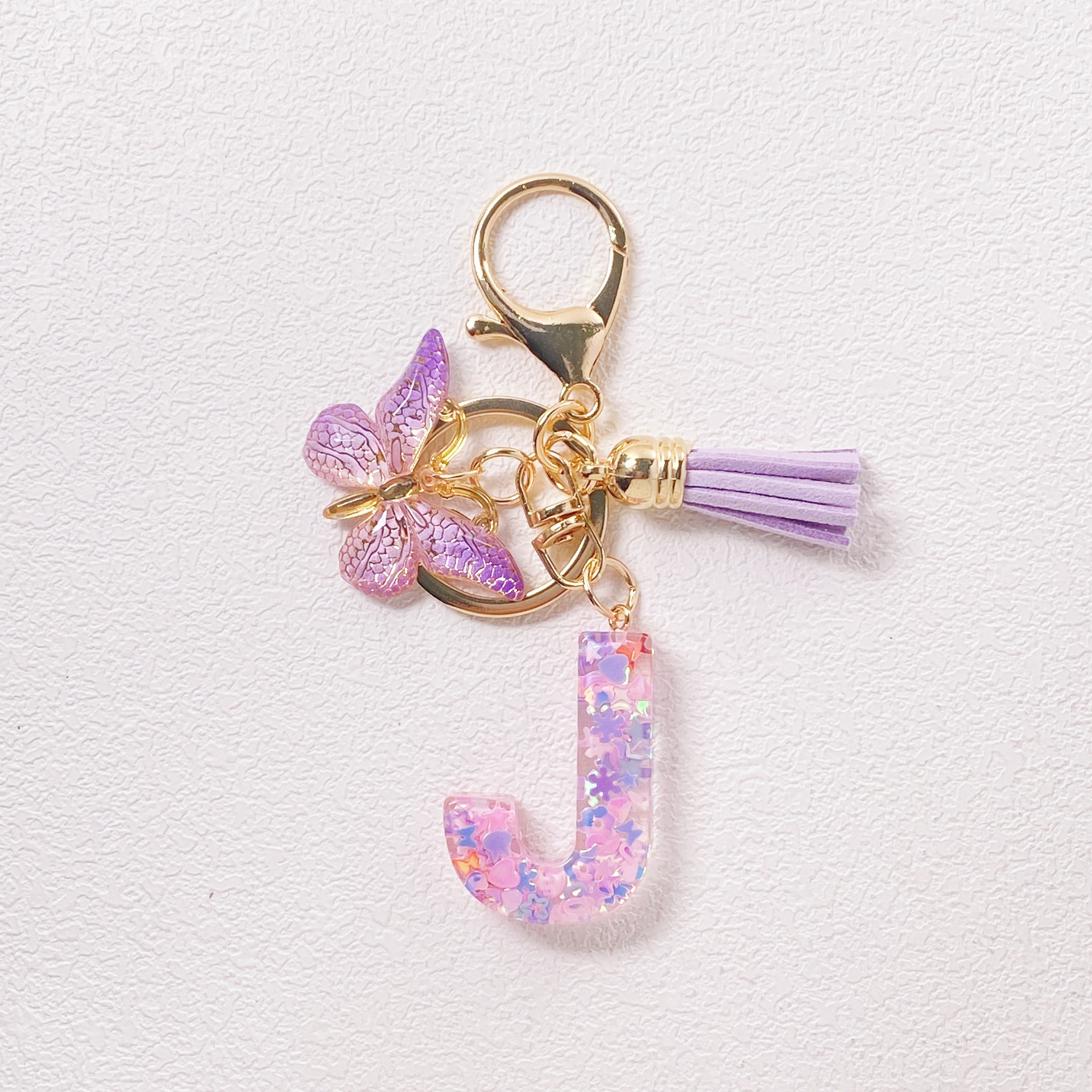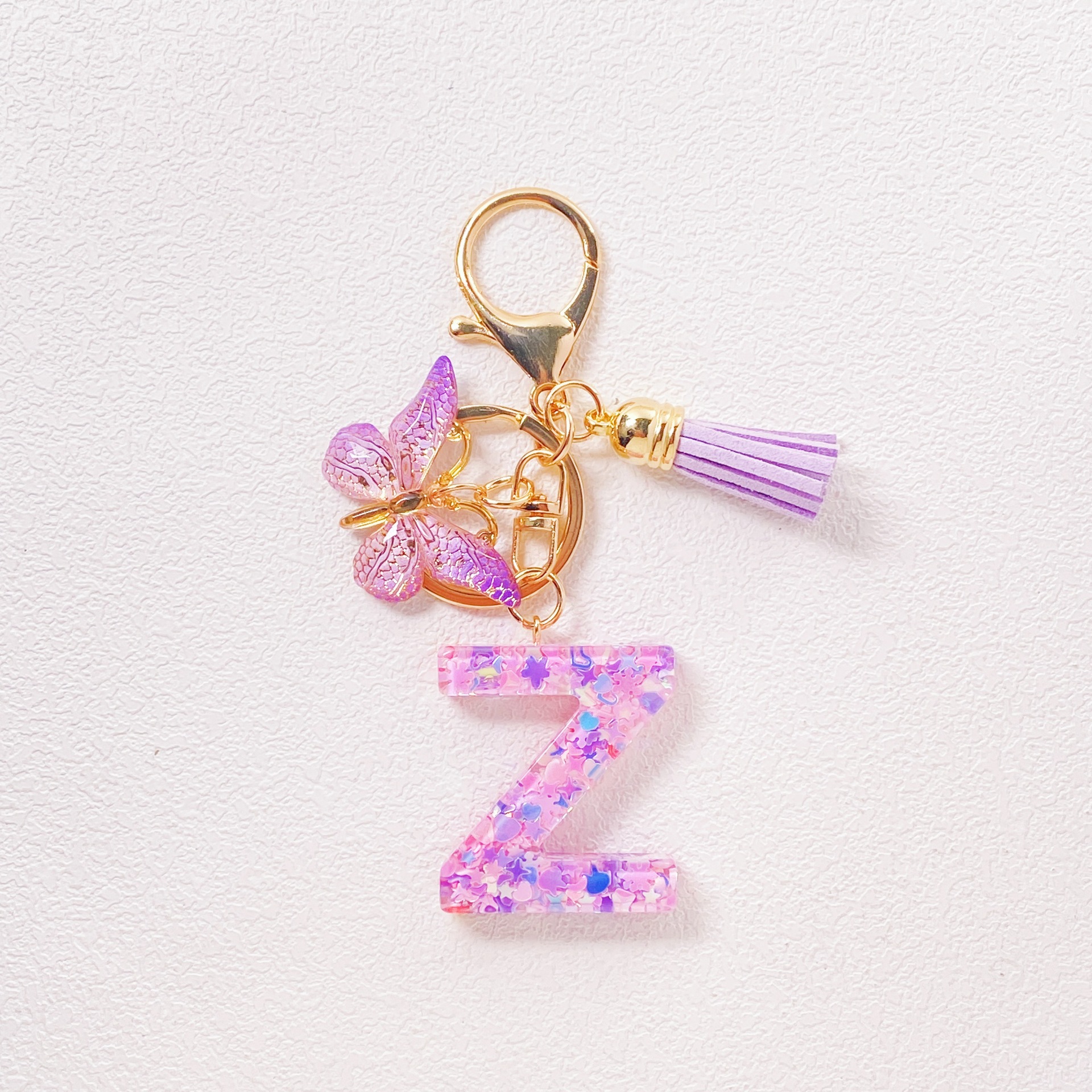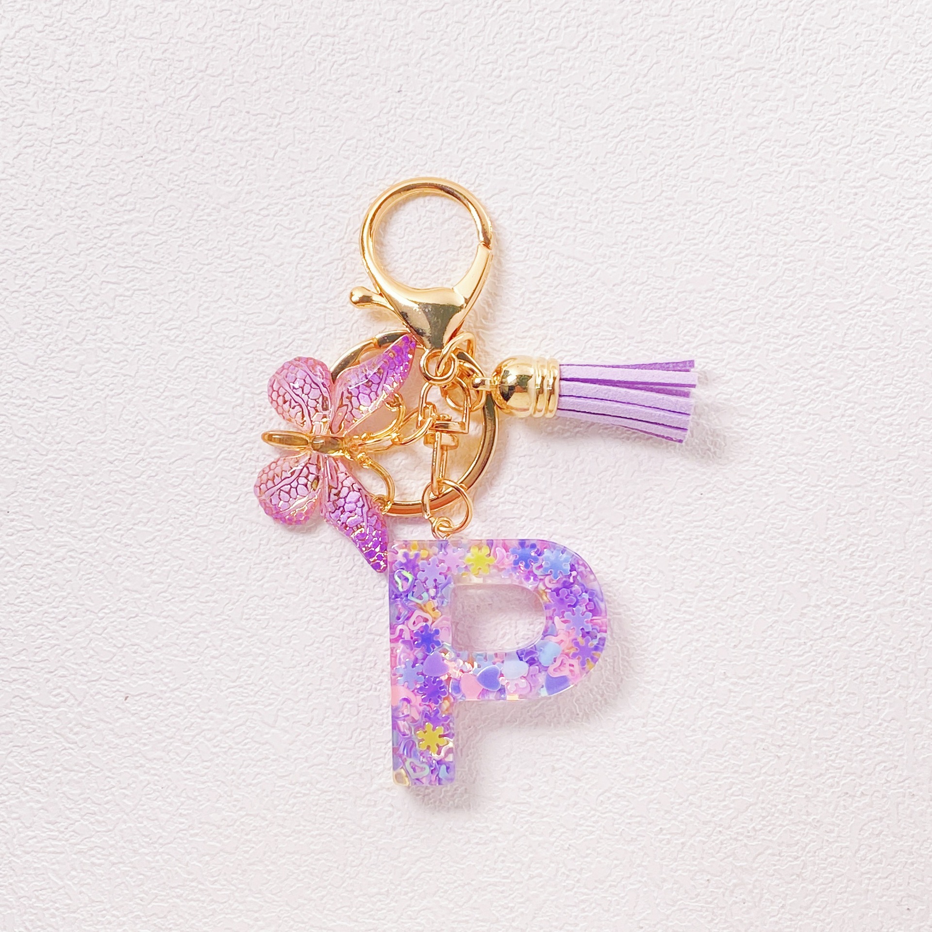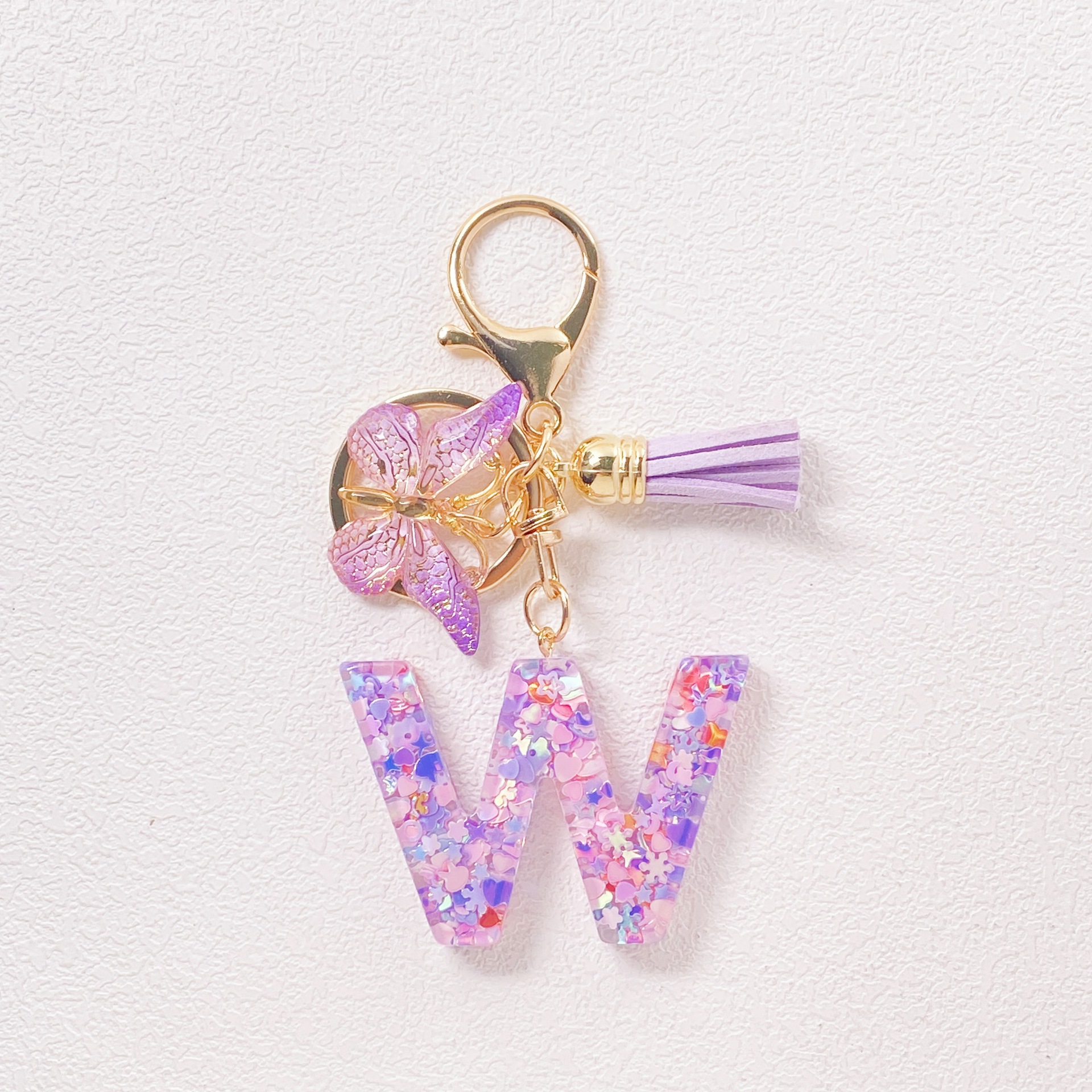 패션 보라색 문자 키 체인 러브 스팽글 나비 술 크리스탈 접착제 펜던트 액세서리 숙녀 키 체인