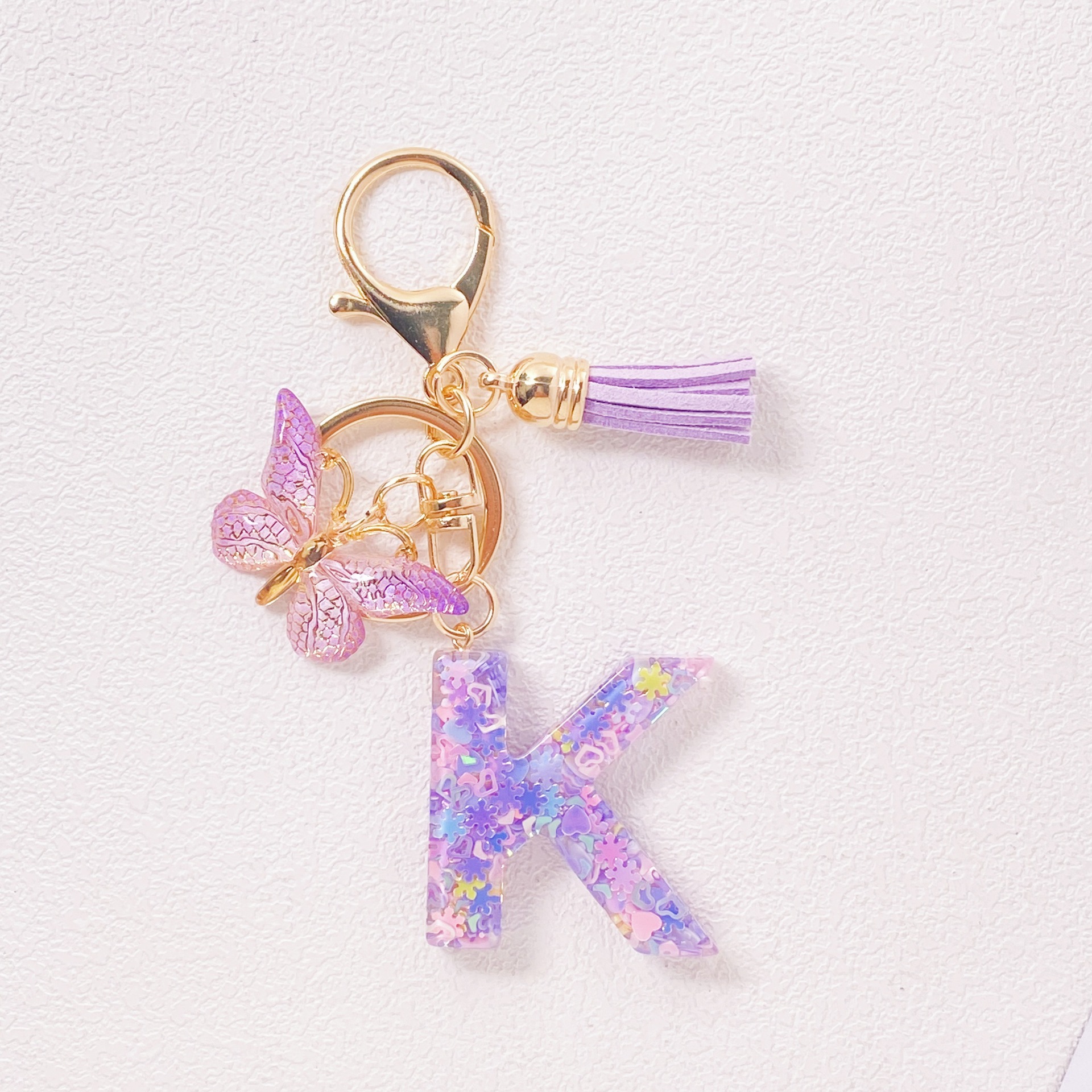 패션 보라색 문자 키 체인 러브 스팽글 나비 술 크리스탈 접착제 펜던트 액세서리 숙녀 키 체인스토어 가기