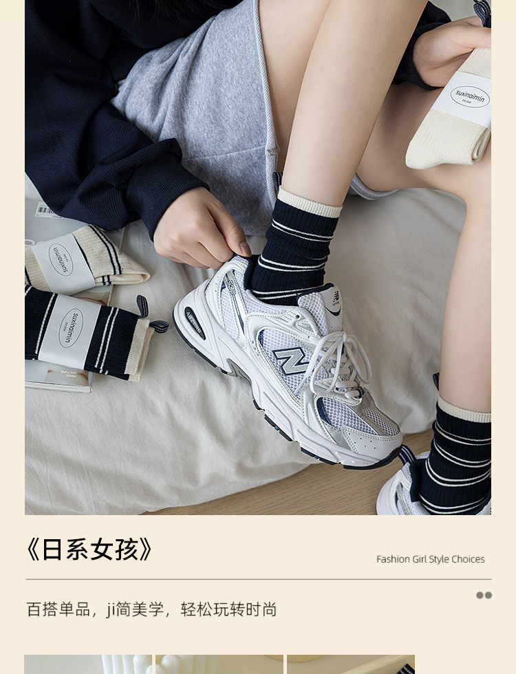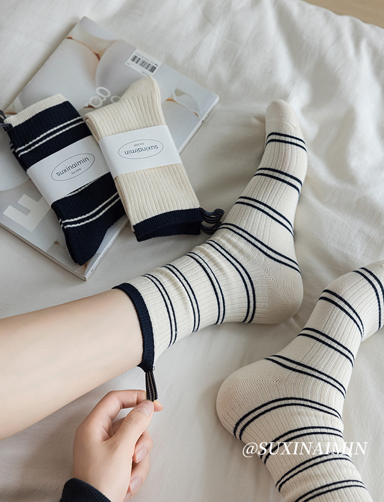 수시나이민 여성용 양말 봄 가을 배색 스트라이프 인스 트렌드 일본 스타일 땀 흡수 힐 라벨 중목 양말