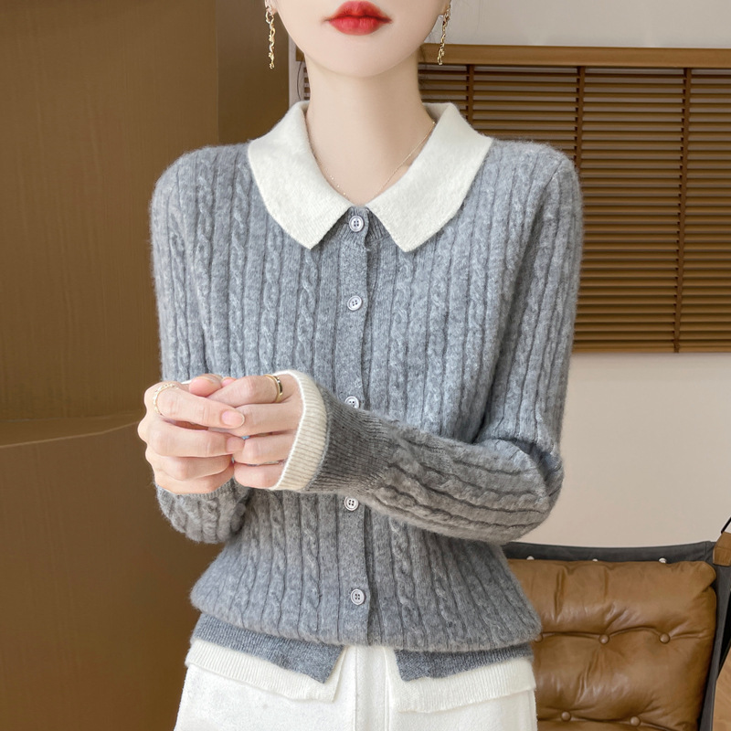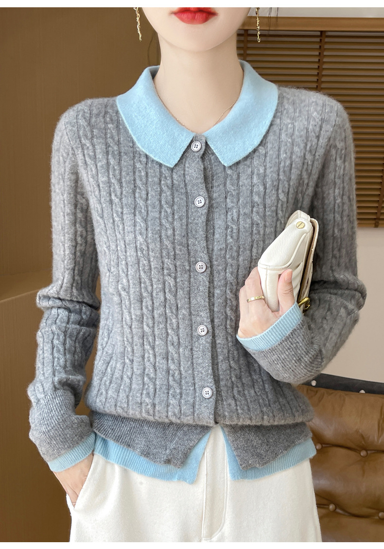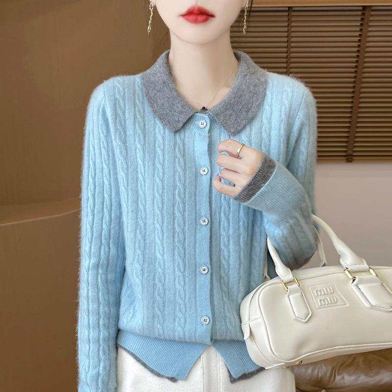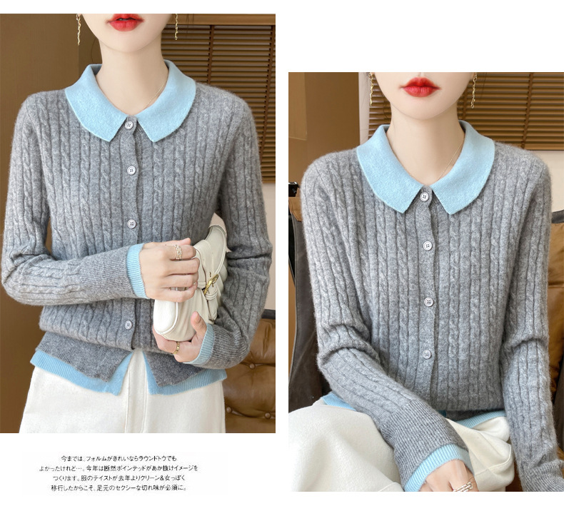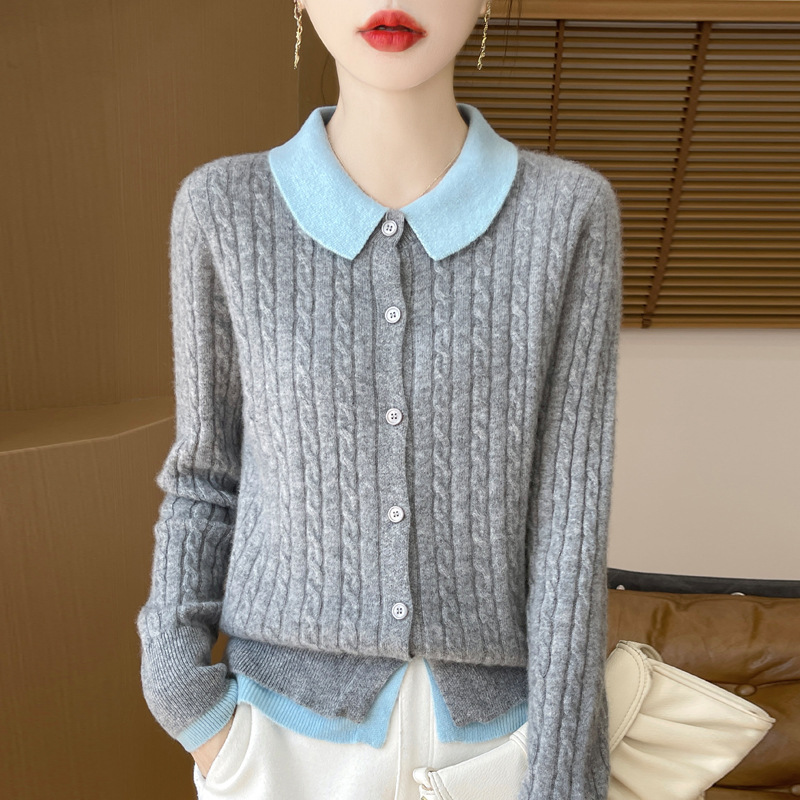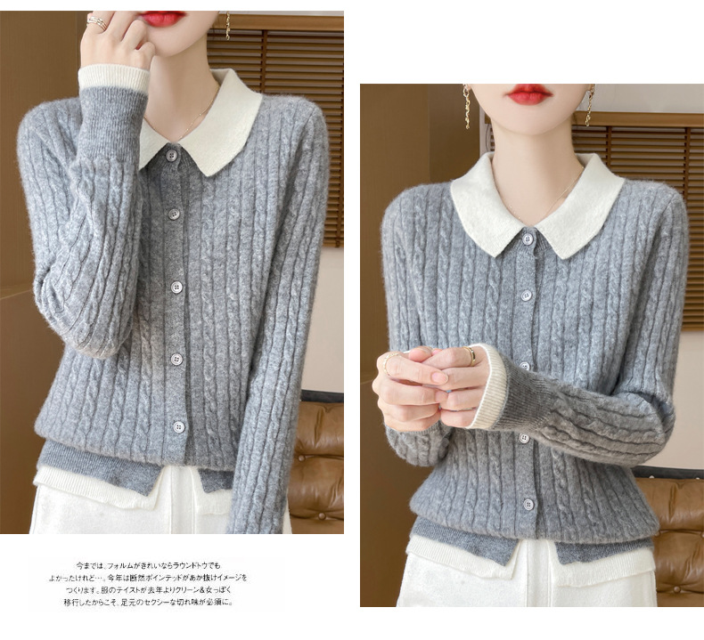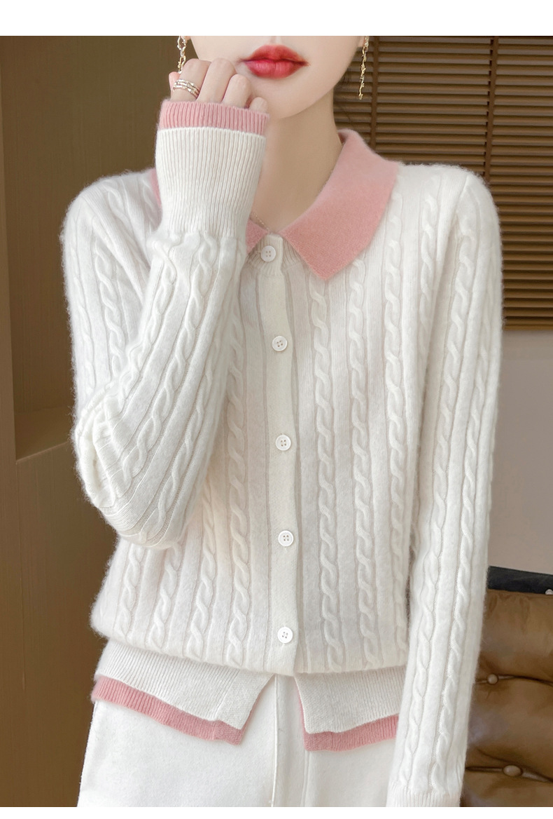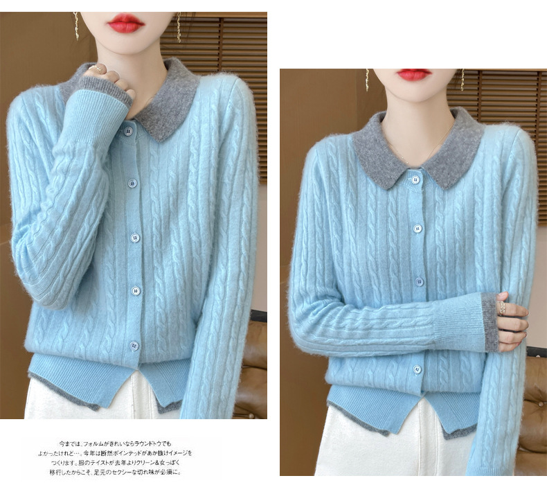 가을과 겨울 2024 새로운 두꺼운 순수 양모 옷깃 니트 카디건 긴 소매 여성의 명암 가짜 투피스 트위스트 탑