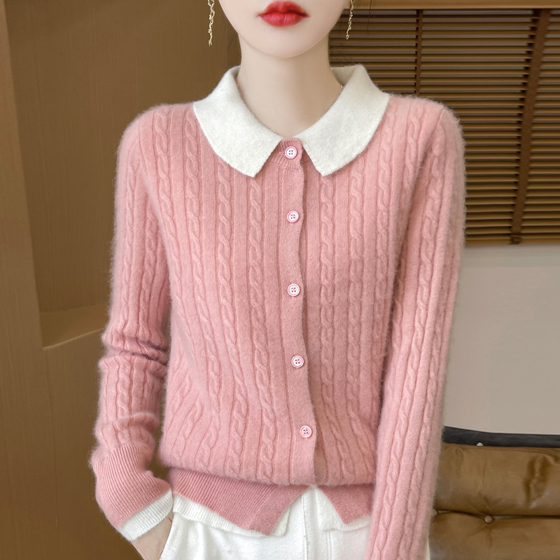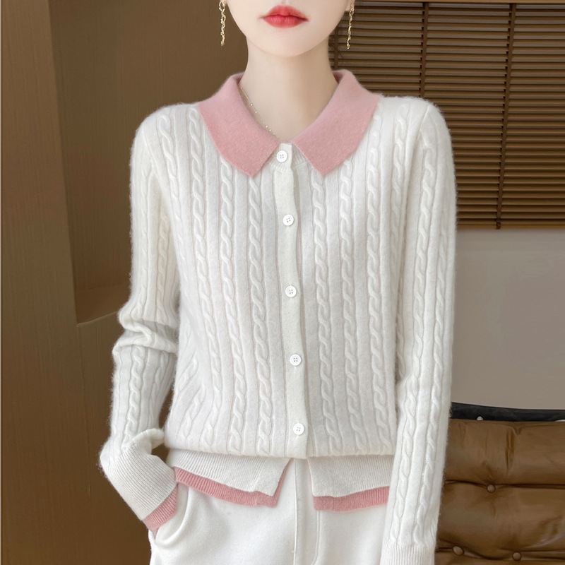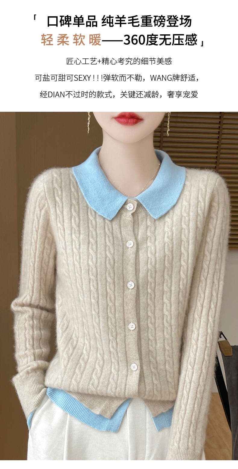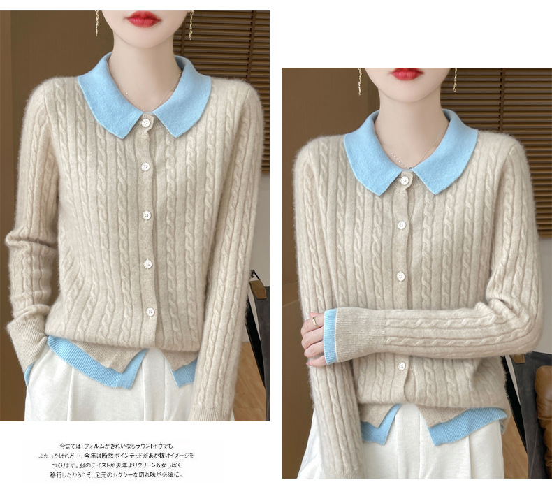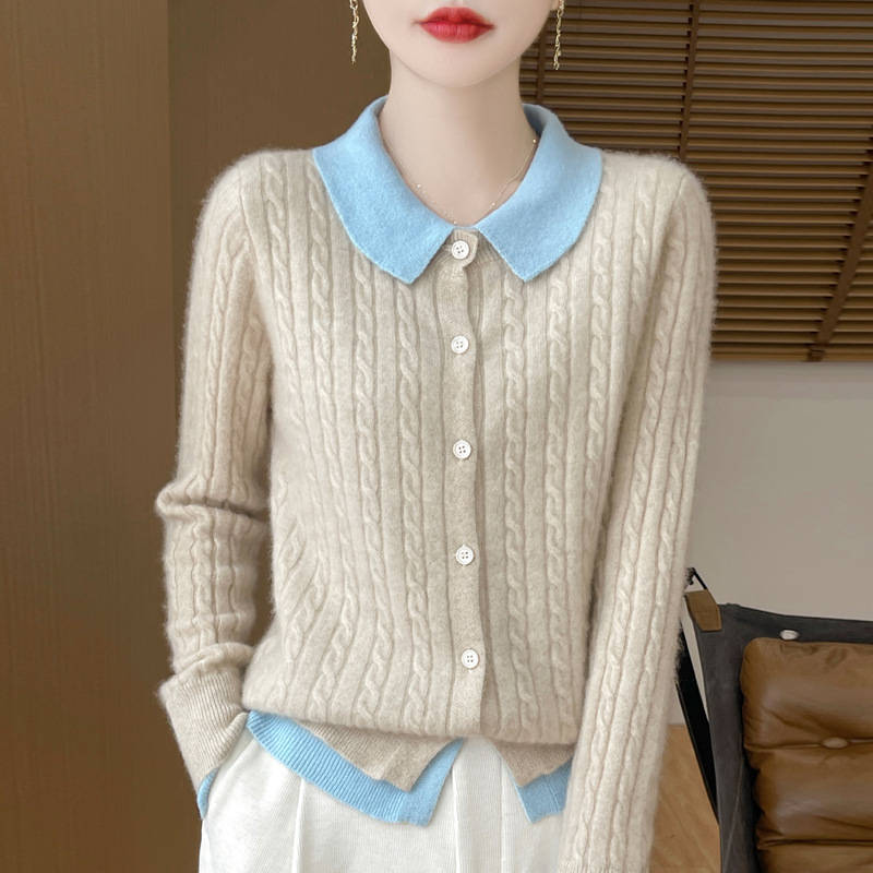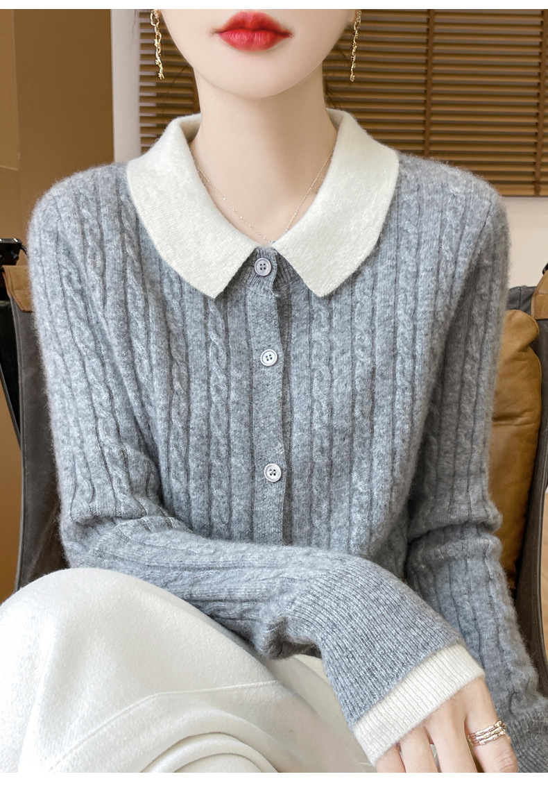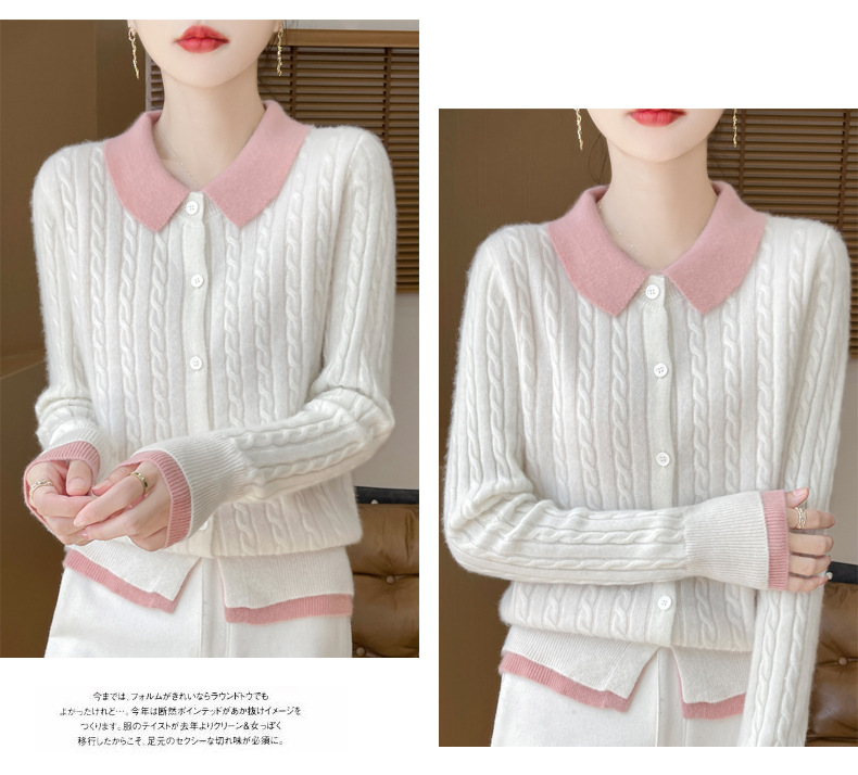 가을과 겨울 2024 새로운 두꺼운 순수 양모 옷깃 니트 카디건 긴 소매 여성의 명암 가짜 투피스 트위스트 탑