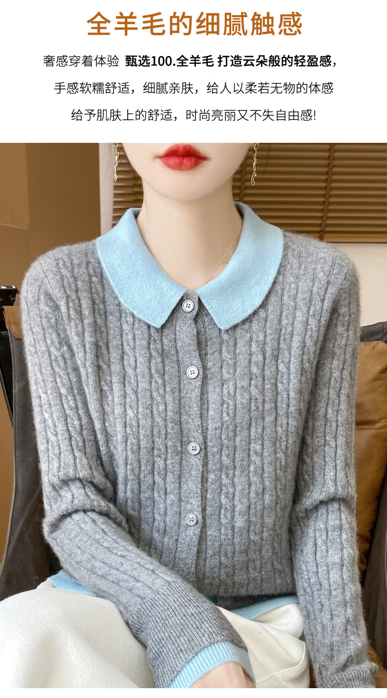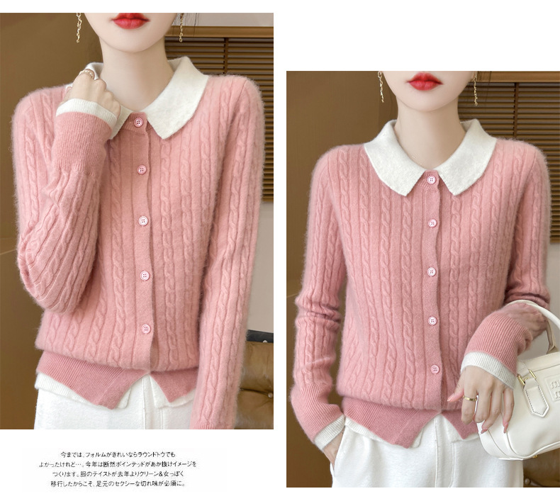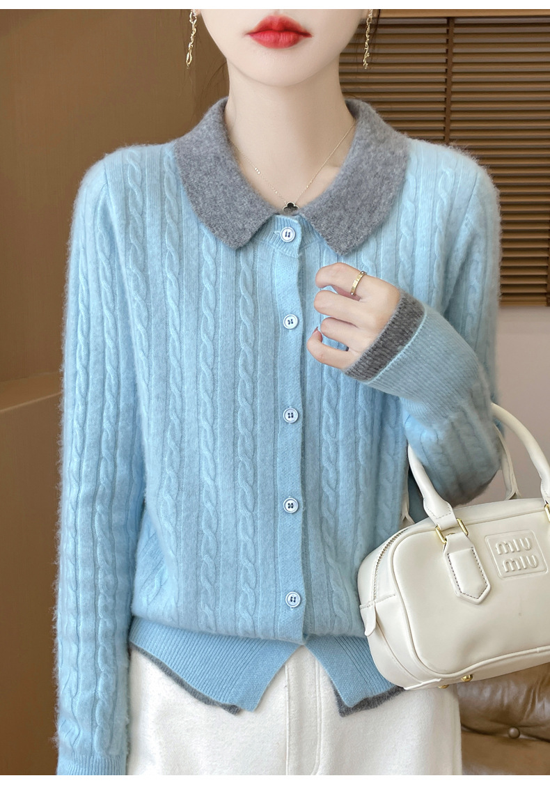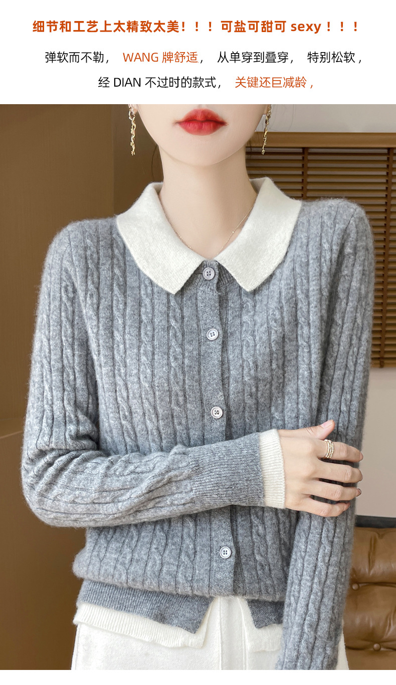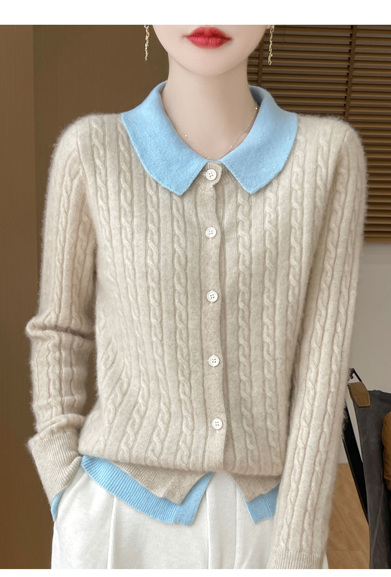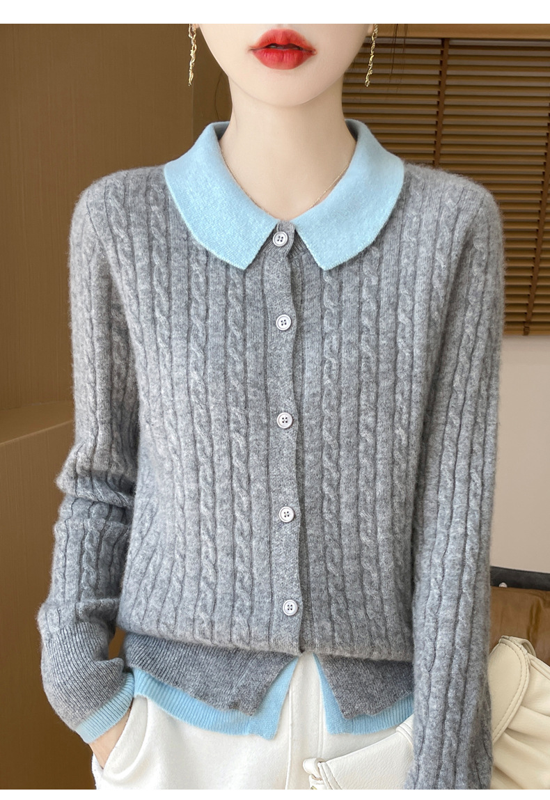 가을과 겨울 2024 새로운 두꺼운 순수 양모 옷깃 니트 카디건 긴 소매 여성의 명암 가짜 투피스 트위스트 탑