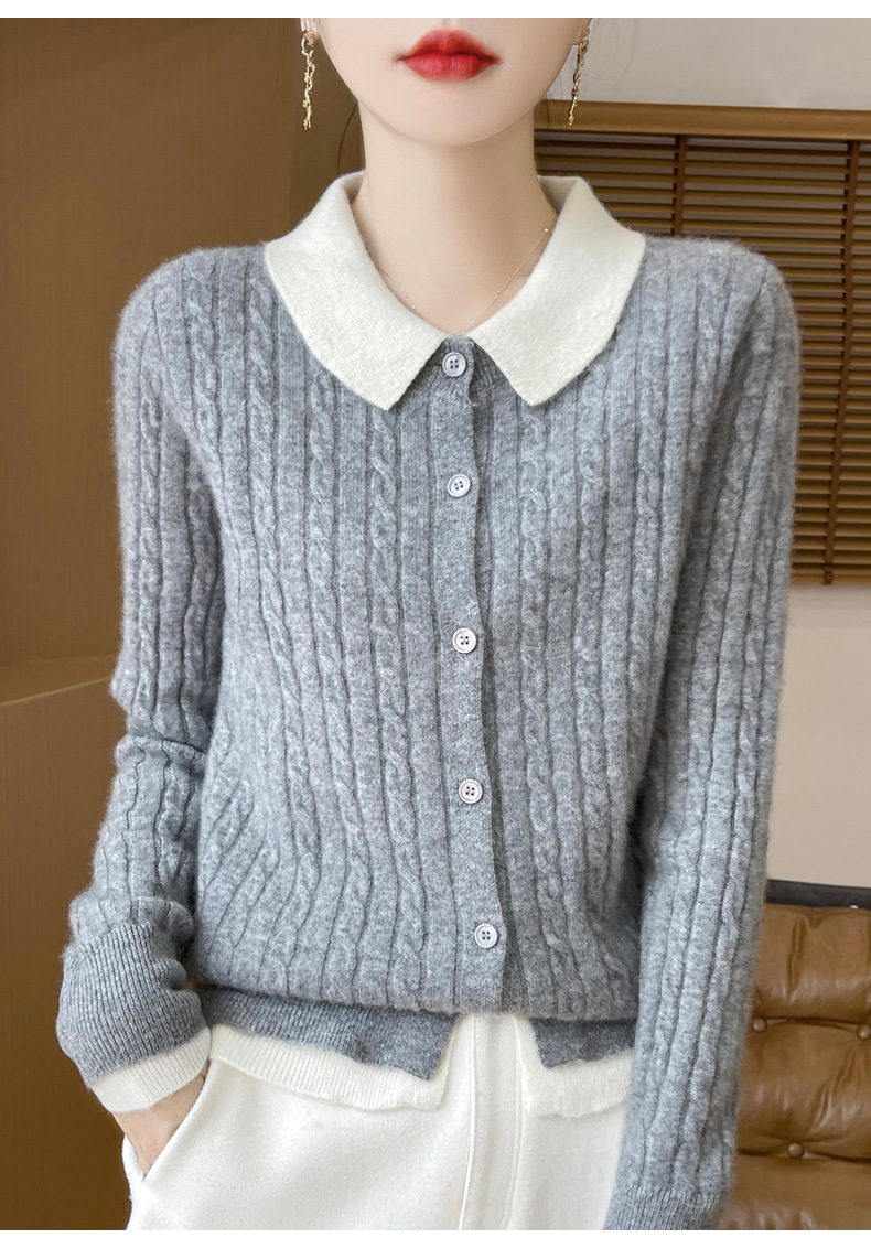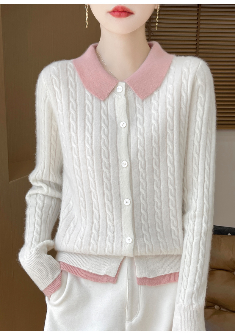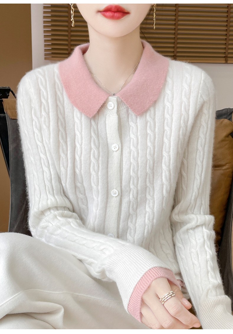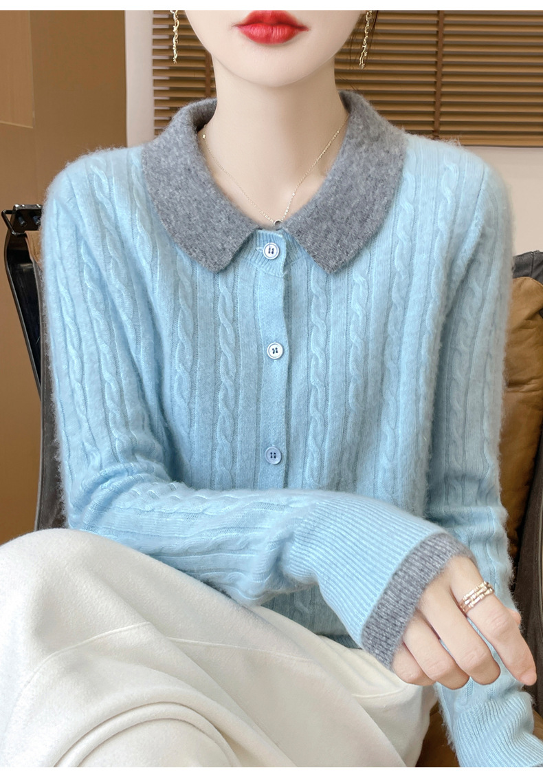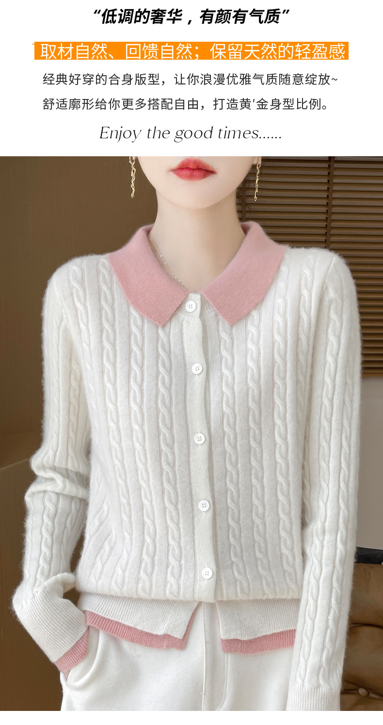 가을과 겨울 2024 새로운 두꺼운 순수 양모 옷깃 니트 카디건 긴 소매 여성의 명암 가짜 투피스 트위스트 탑
