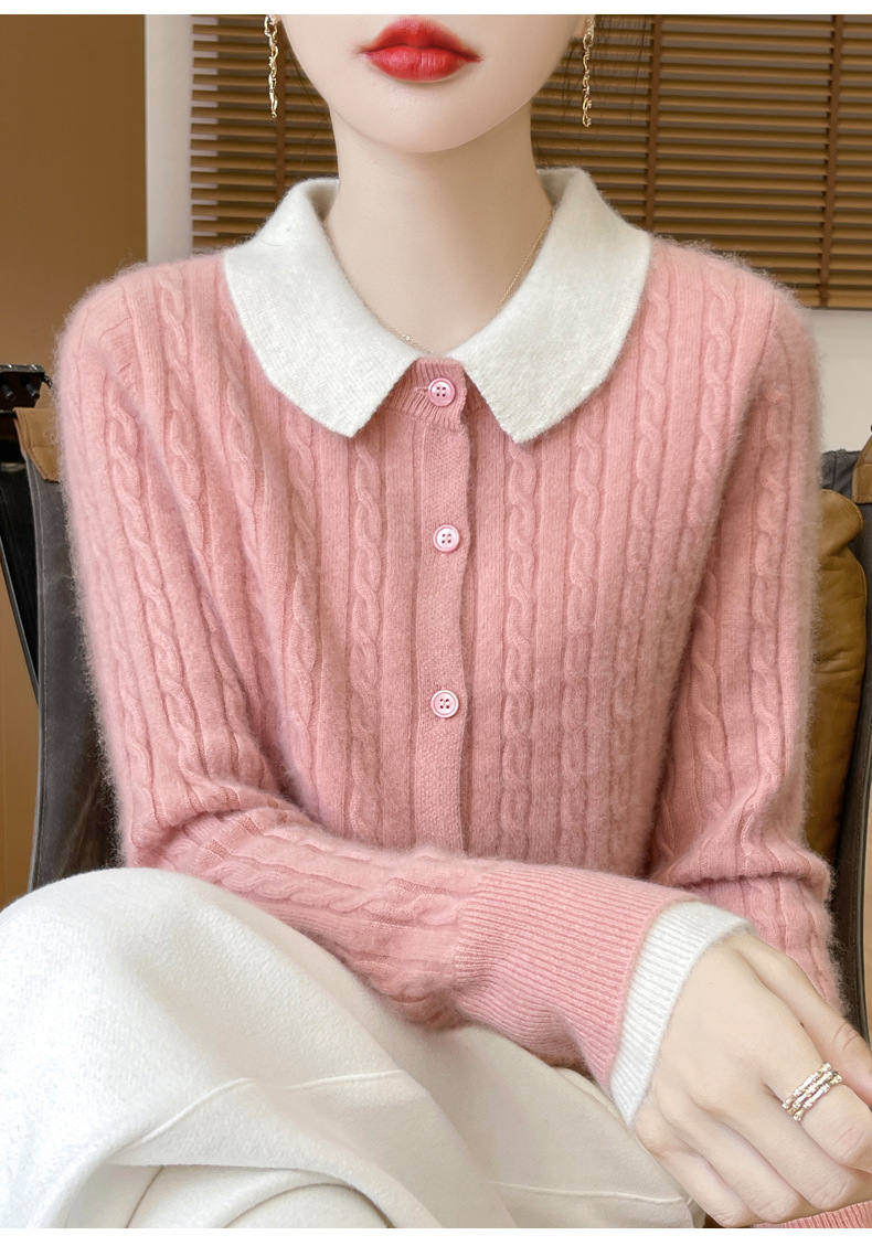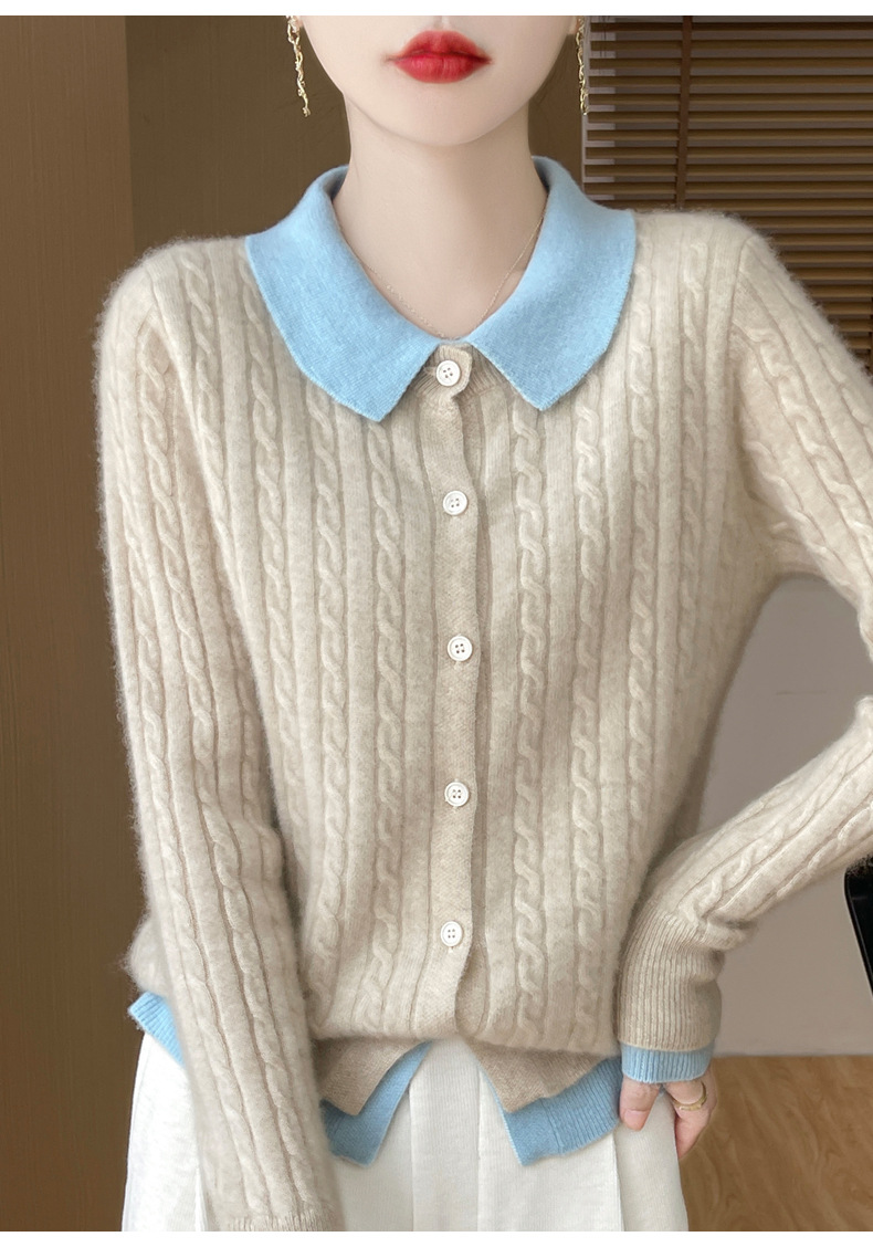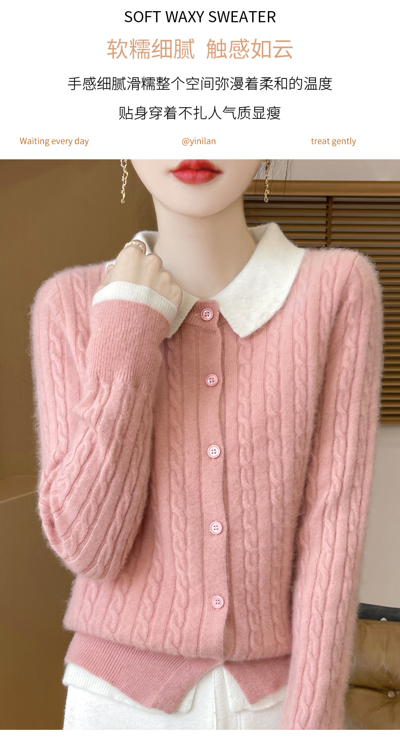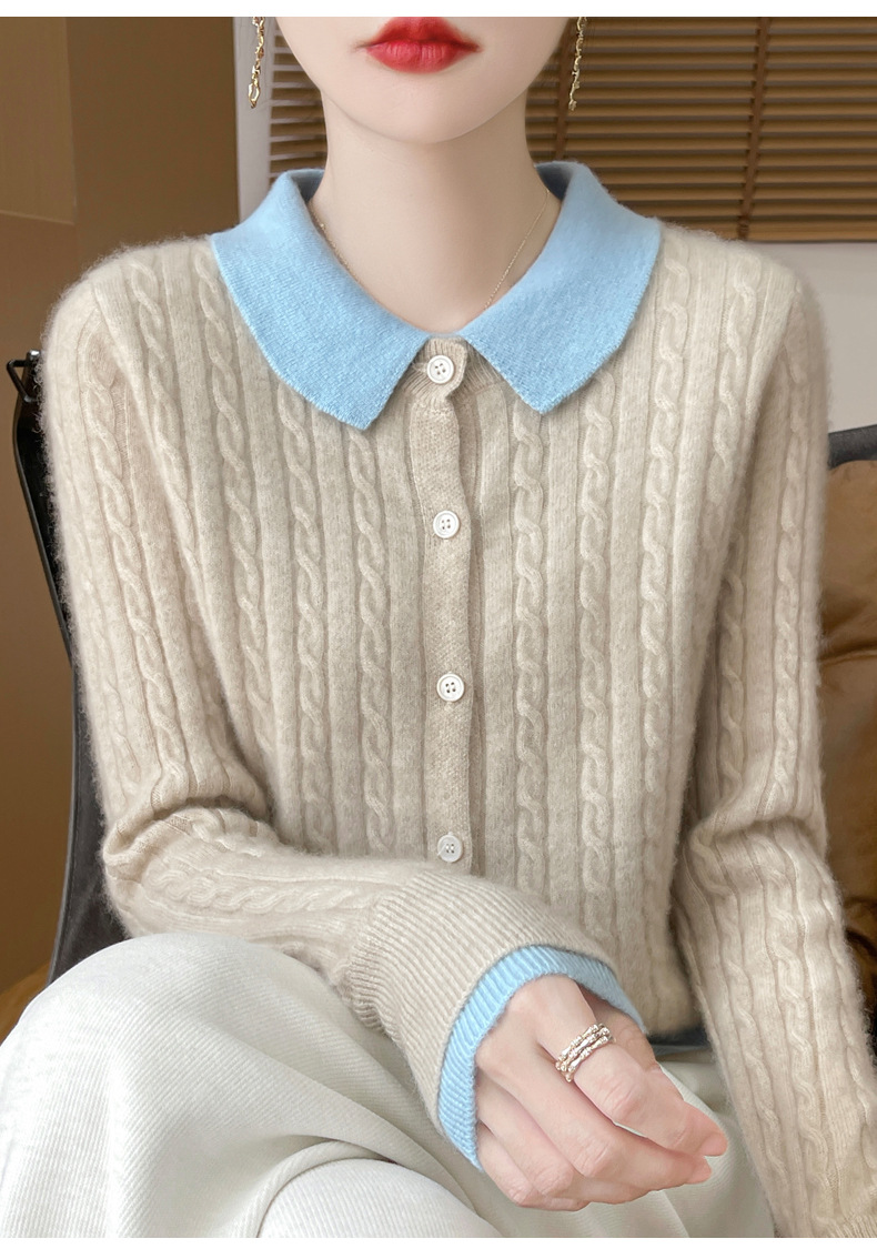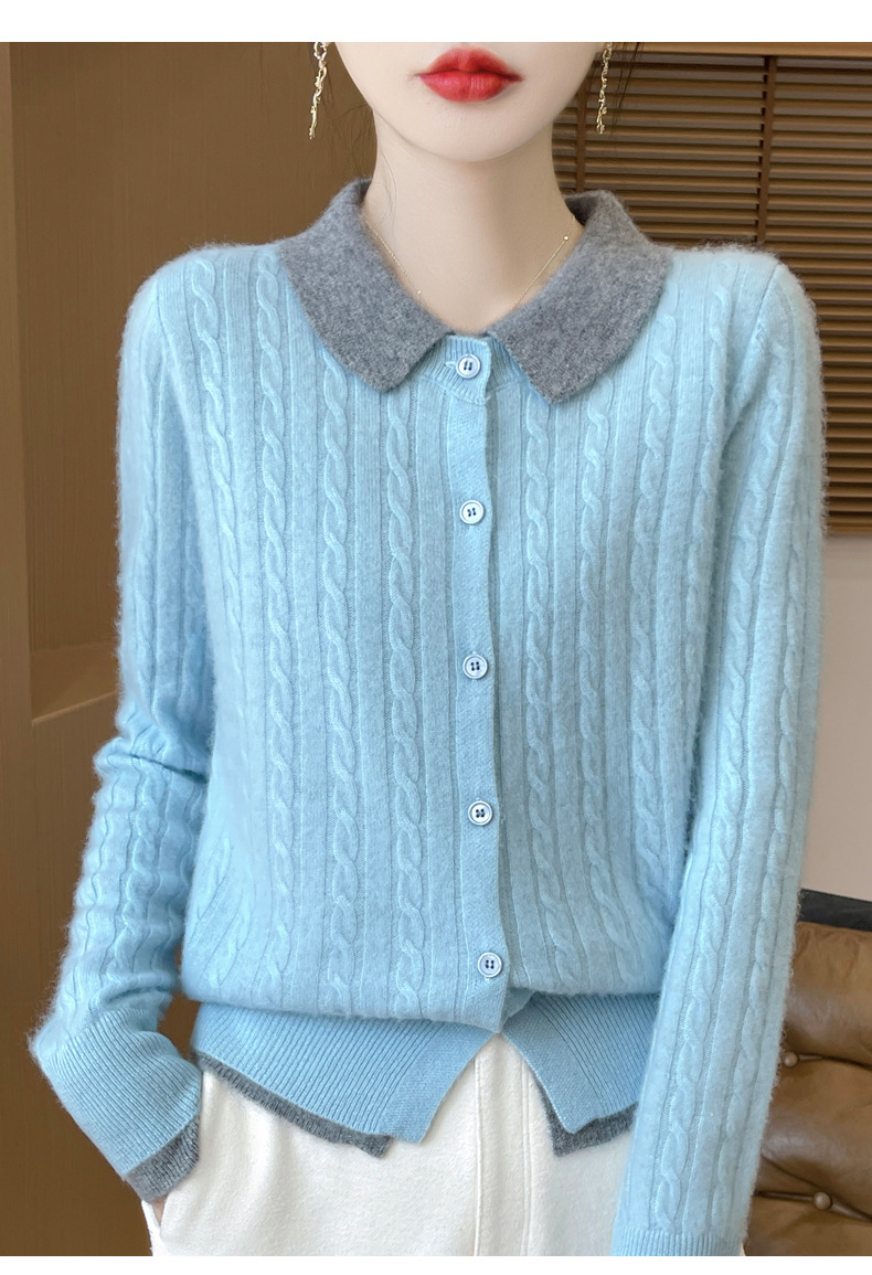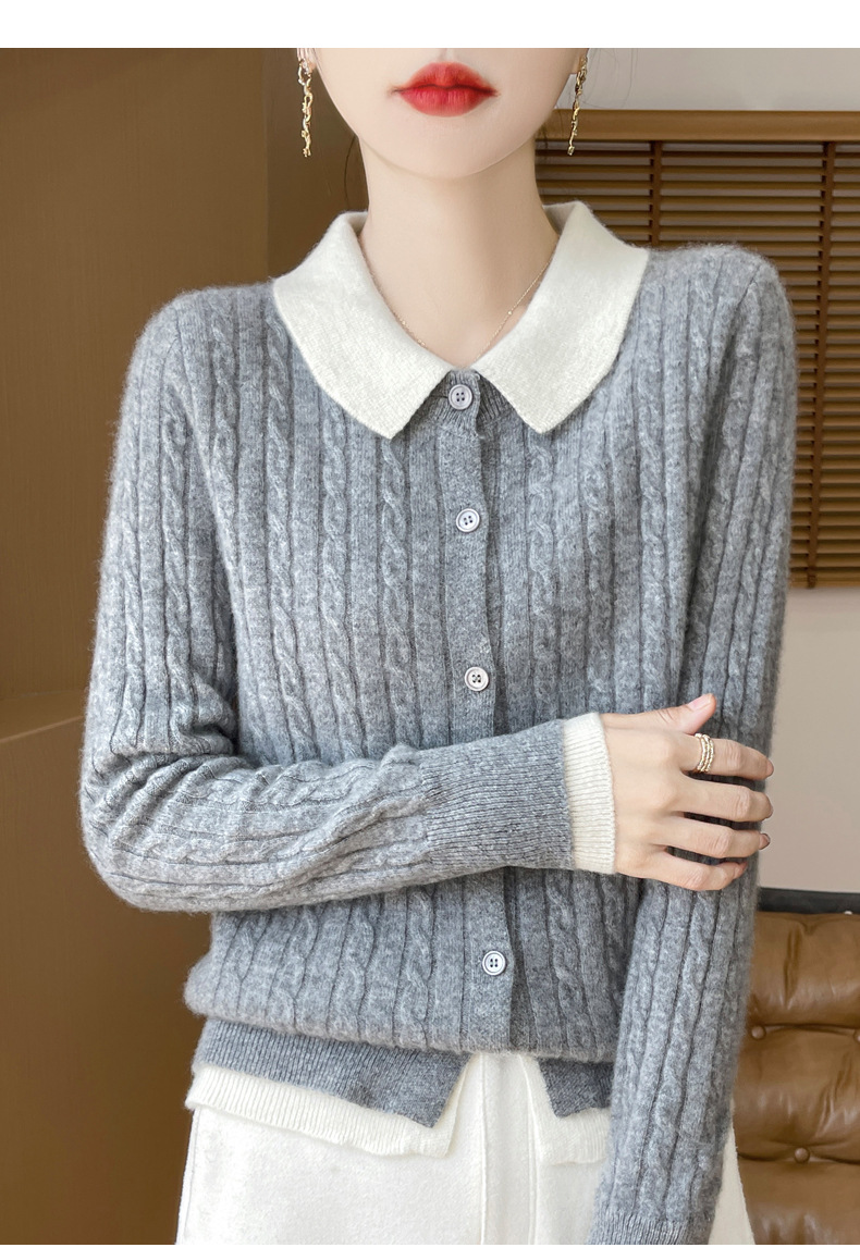 가을과 겨울 2024 새로운 두꺼운 순수 양모 옷깃 니트 카디건 긴 소매 여성의 명암 가짜 투피스 트위스트 탑