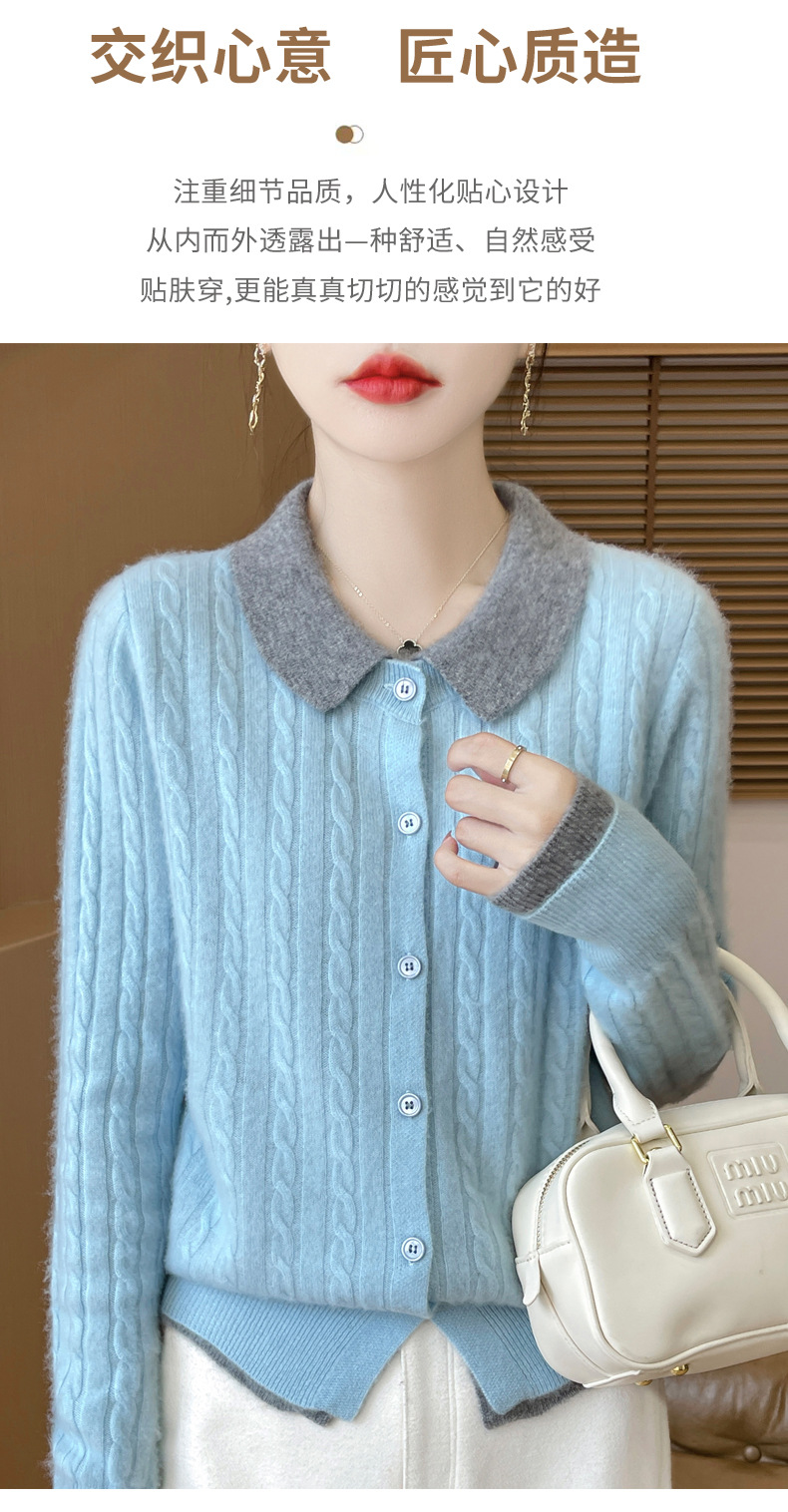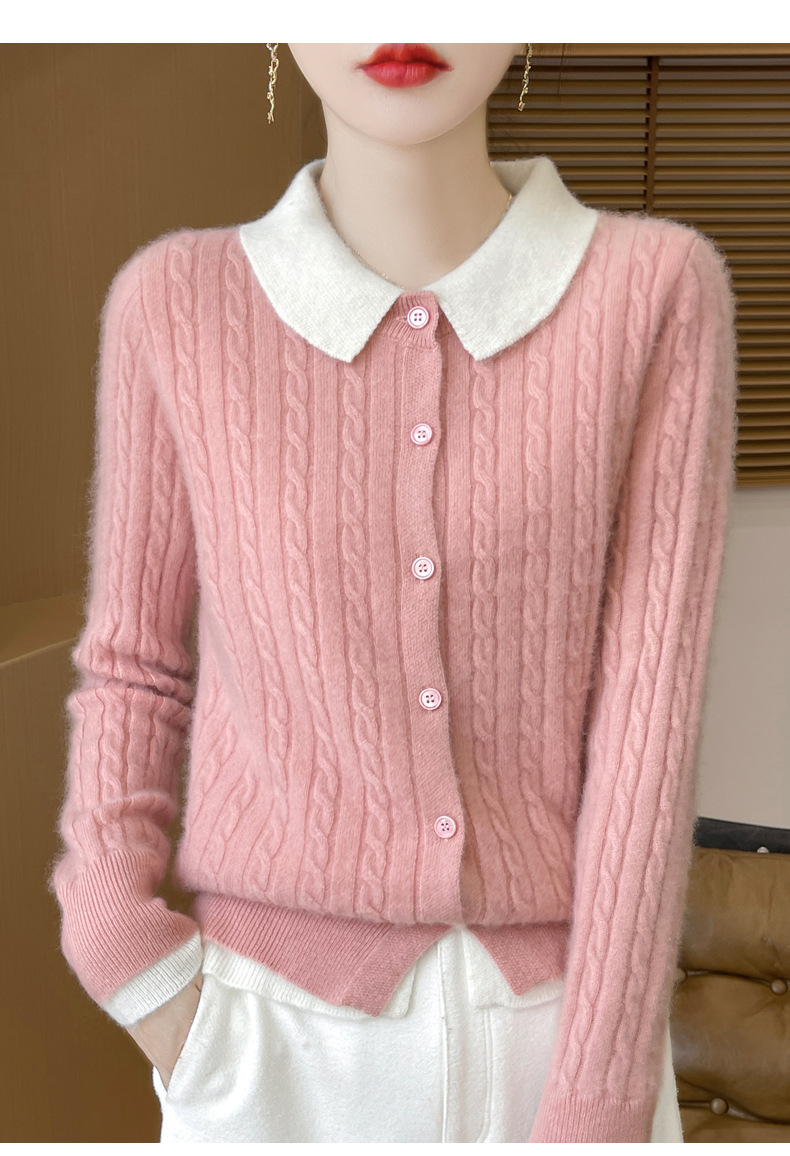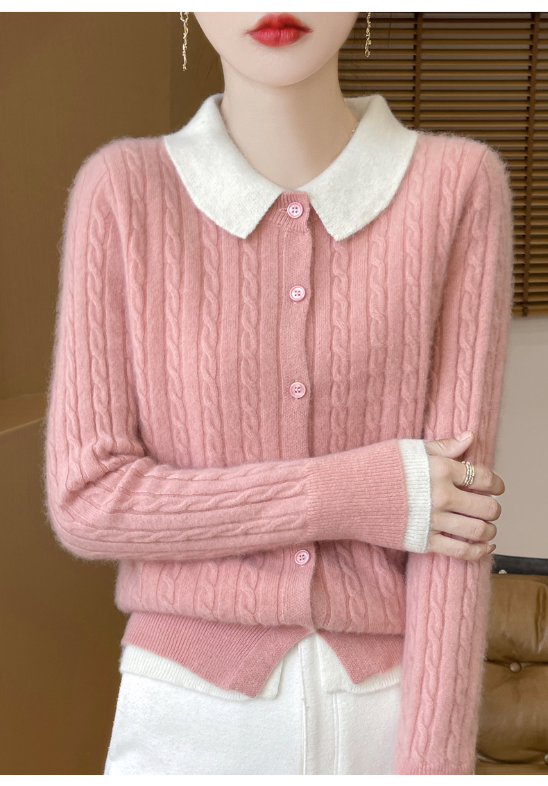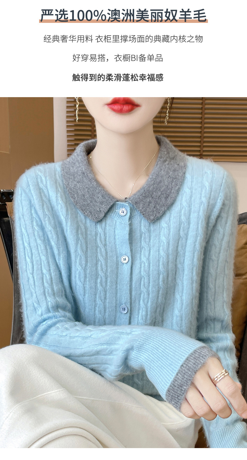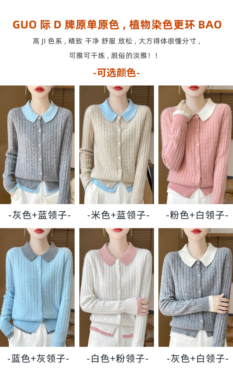 가을과 겨울 2024 새로운 두꺼운 순수 양모 옷깃 니트 카디건 긴 소매 여성의 명암 가짜 투피스 트위스트 탑